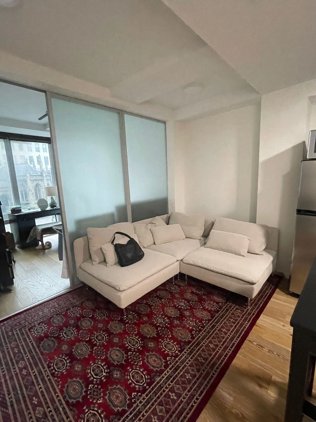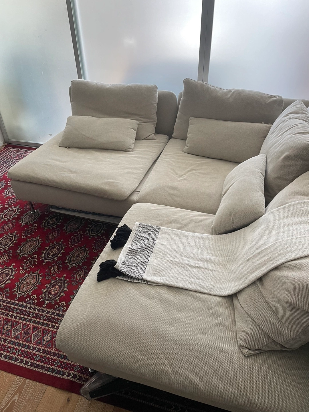 Lightly used IKEA sectional sofa. Resistant fabric. Great for smaller apartments/corners. You would have to pick up and move the couch but there’s an elevator in my building so it makes the process much easier.
