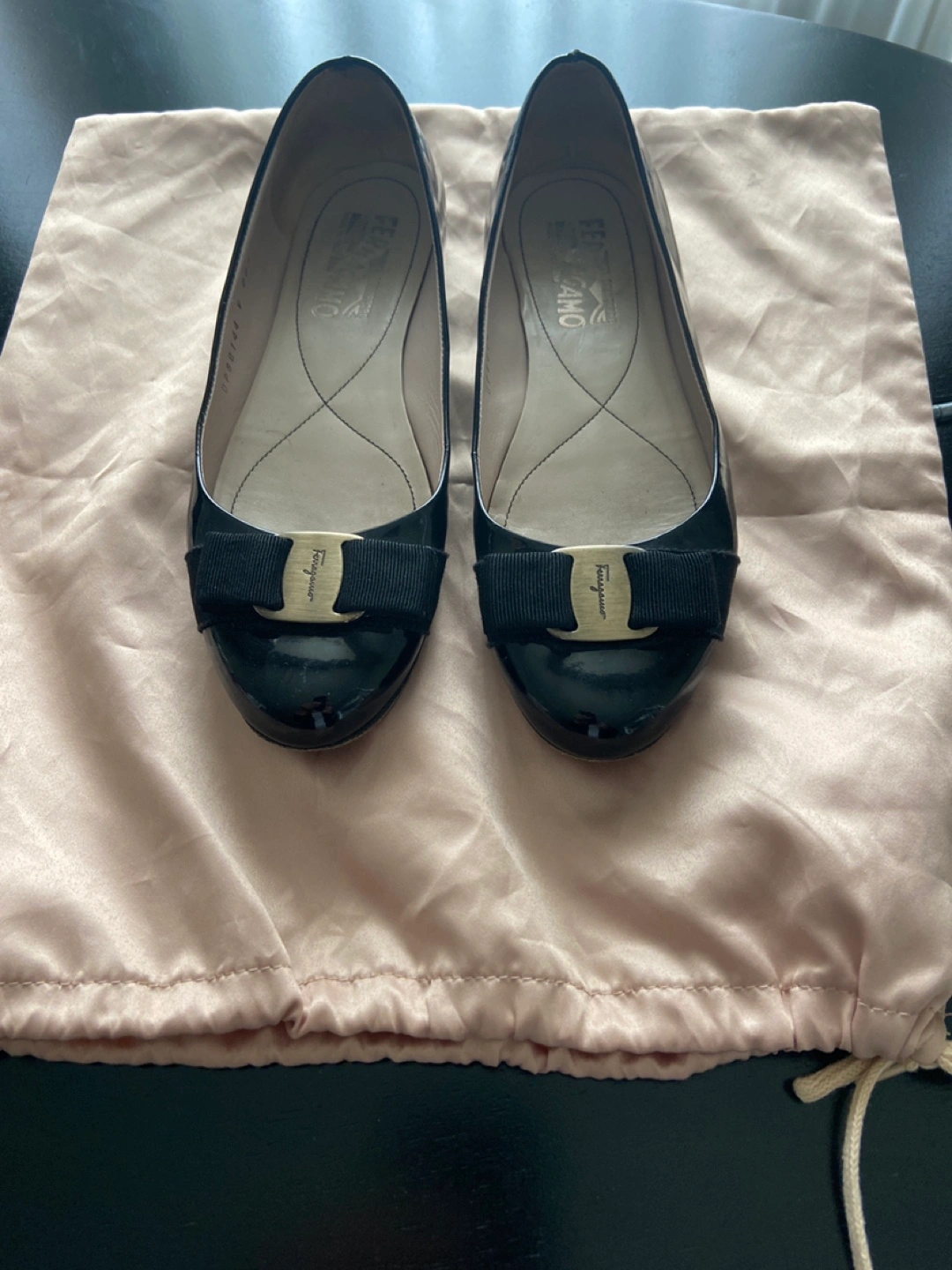 20Women's black patent leather ballerina flats. Classic style, signature Vara bow detail. Pre-owned.