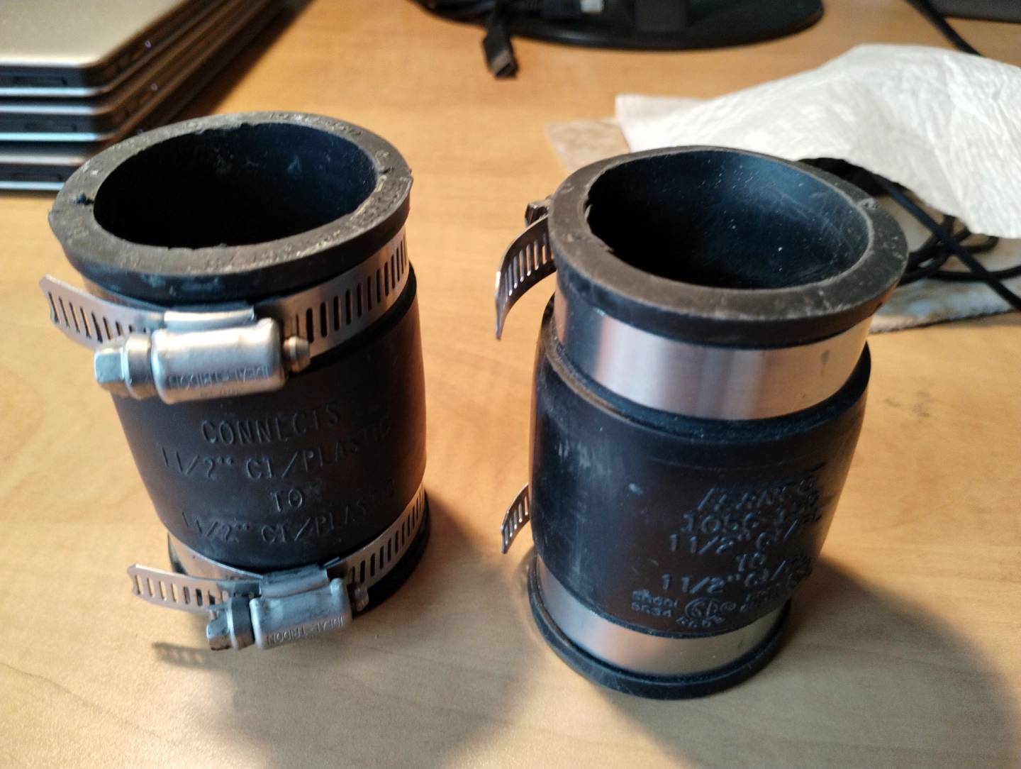 Pair of used 1 1/2" black rubber couplings. Connects cast iron and plastic pipes. Allows slight movement between noints. Includes stainless steel clamps. Shows slight wear. includes all the stainless hardware fittings as in pictures.