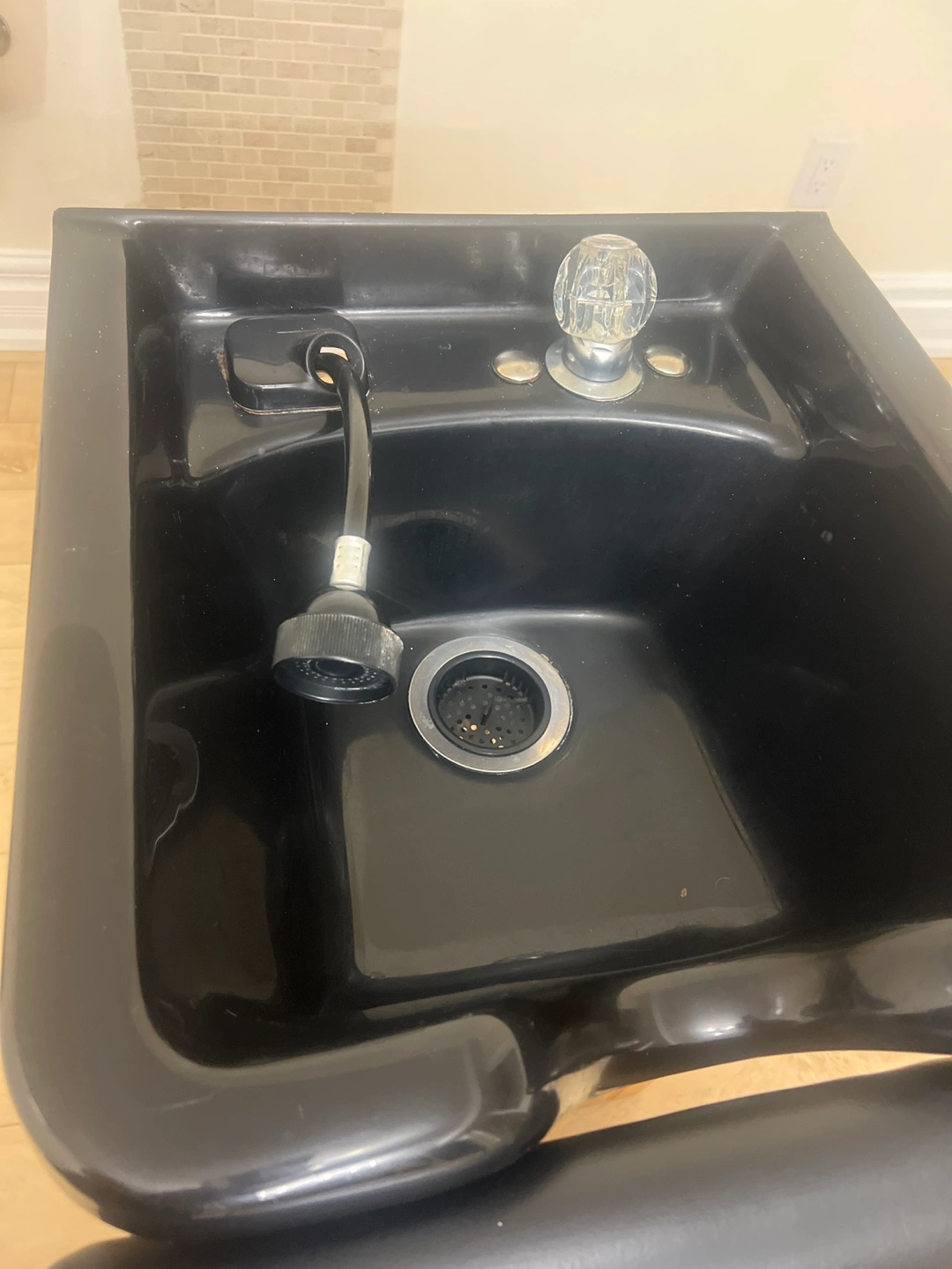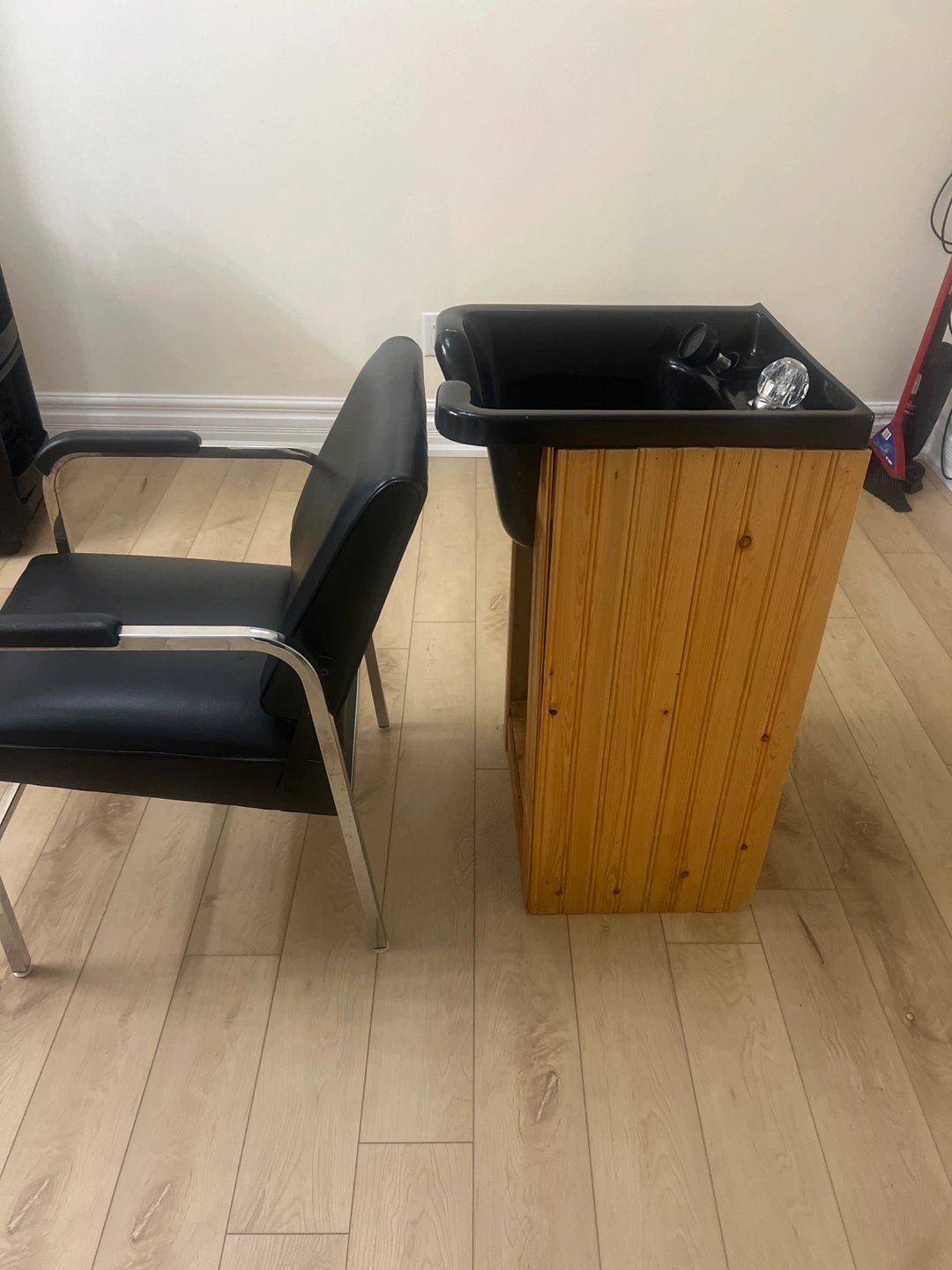 Hair washing station with shampoo bowl and accompanying chair. Black vinyl chair with chrome accents. Good condition.wooden cabinet not available, just reclining chair and sink that needs quick installation