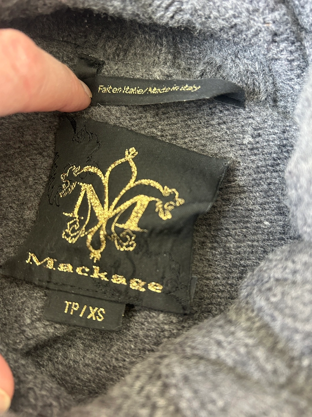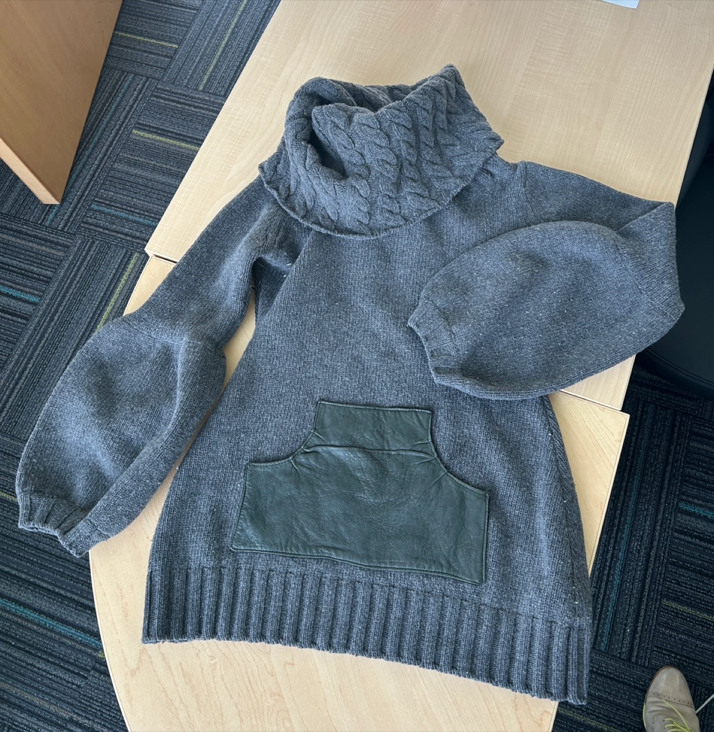 635Grey wool sweater by Mackage with a high mock neck, balloon sleeves, and a unique leather pocket. Made in Italy. Top quality!! Pick up in the Beaches at Queen and Victoria Park.