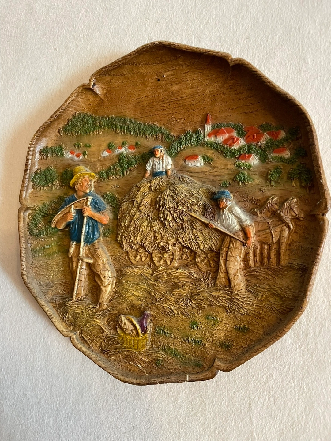 Unique vintage wall hanging. Features a rustic scene of farmers working in a field. Intricate details and warm colours. Perfect for farmhouse or country decor.