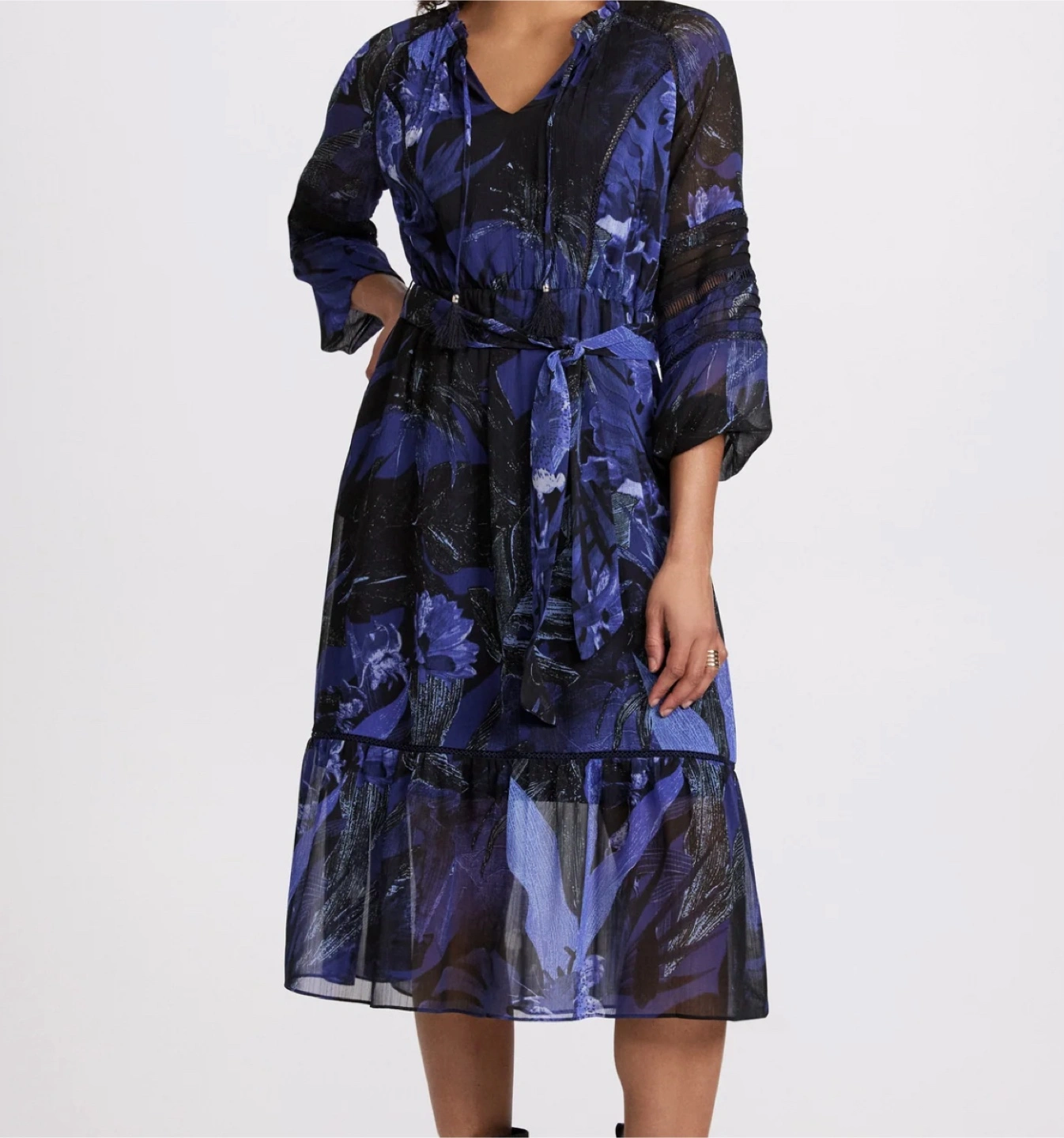Beautiful floral print midi dress. Features a V-neck, three-quarter sleeves, and a tie waist. Lightweight and flowy fabric. Perfect for spring or summer.
