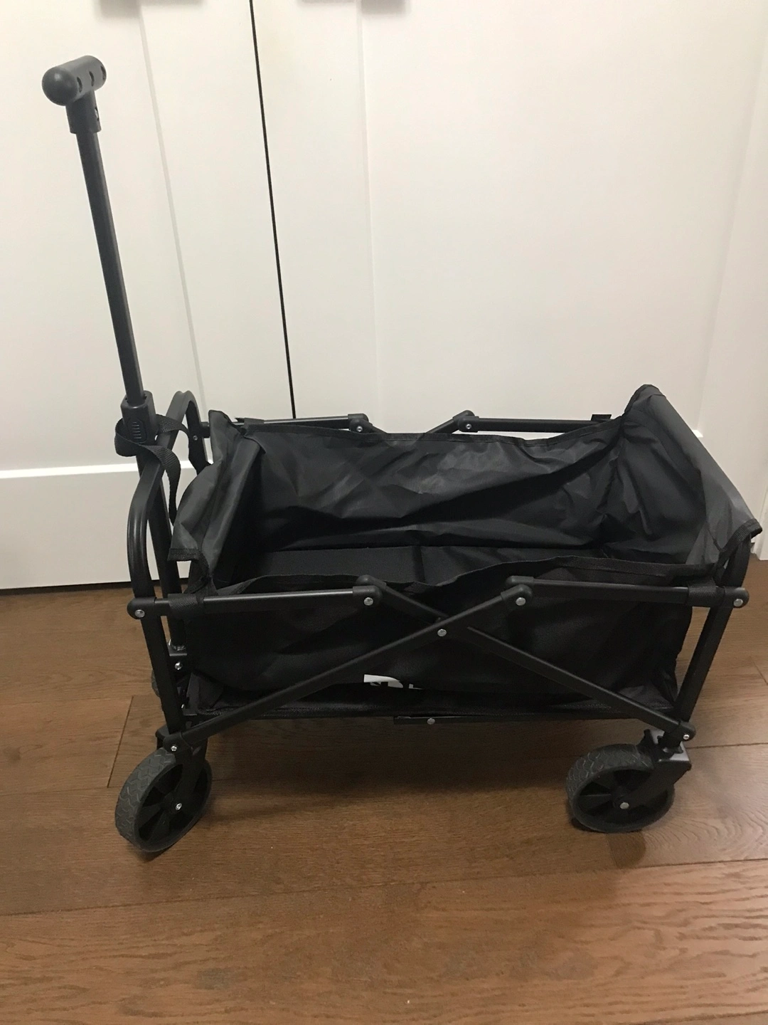 69Foldable wagon. Black fabric interior. Four heavy duty wheels. Pull handle. Great for groceries, cottage, gardening, beach, camping