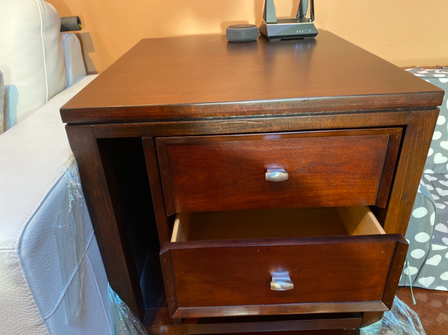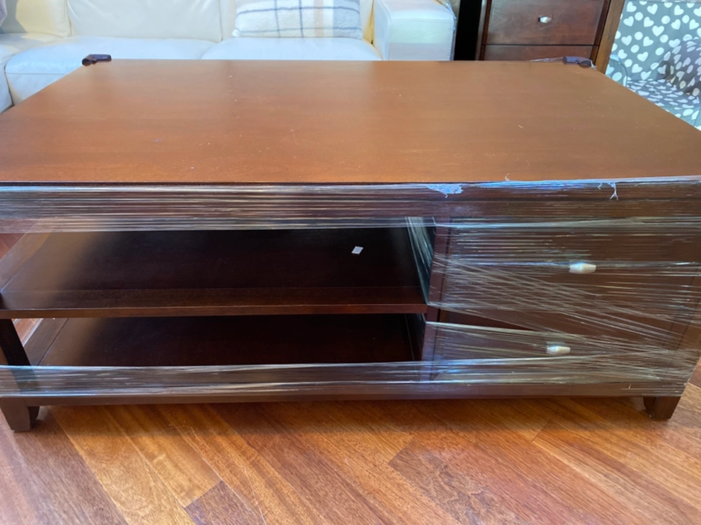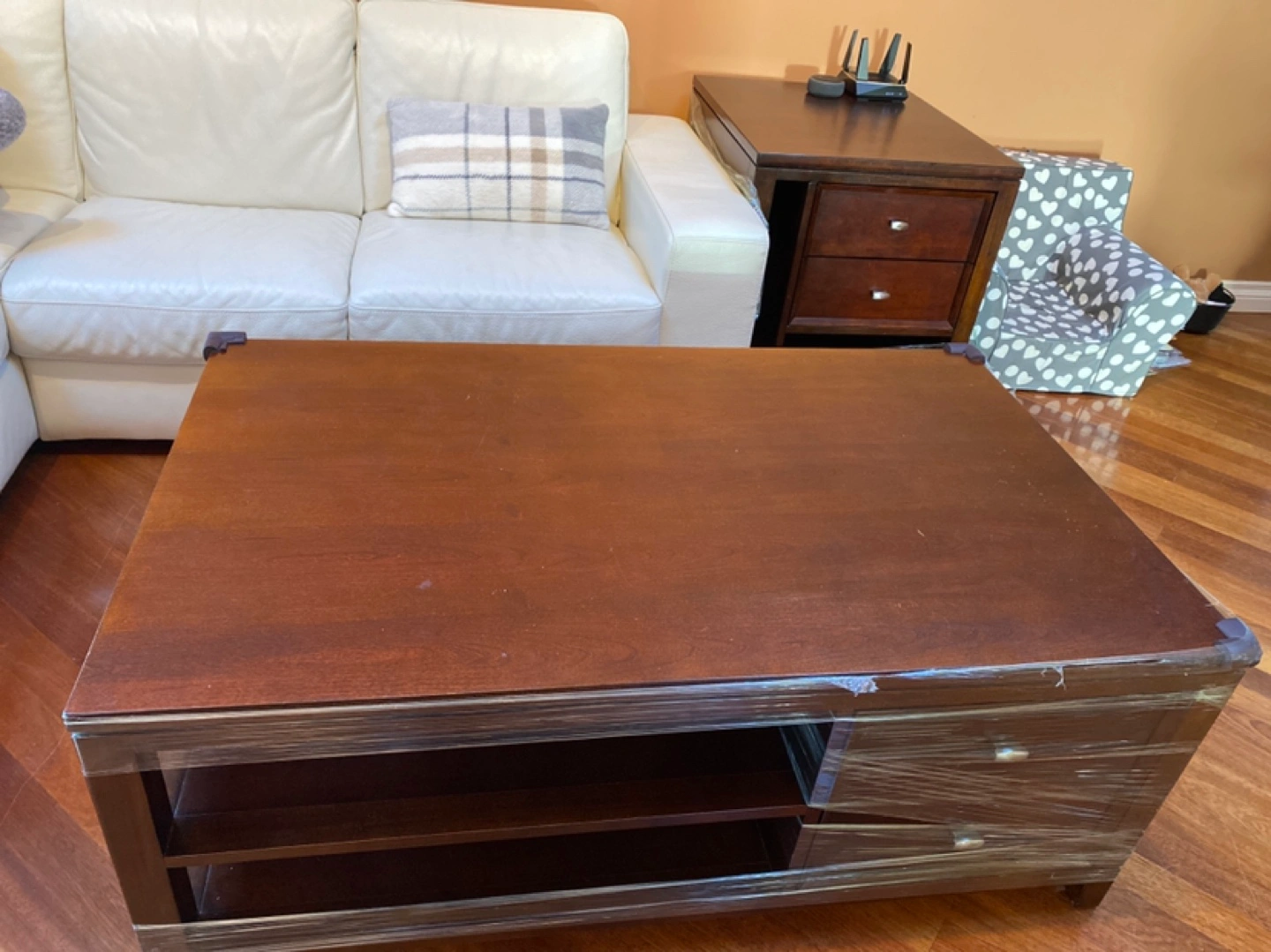 Espresso coloured Hard wood coffee table + side table set. Heavy and sturdy. 50wx30dx20h inch for the coffee table. 25wx28dx26h inch for the side table. There are some sign of use, the table top is not in great condition but still ok, it has some scuffs & wear. This table is on heavy side.