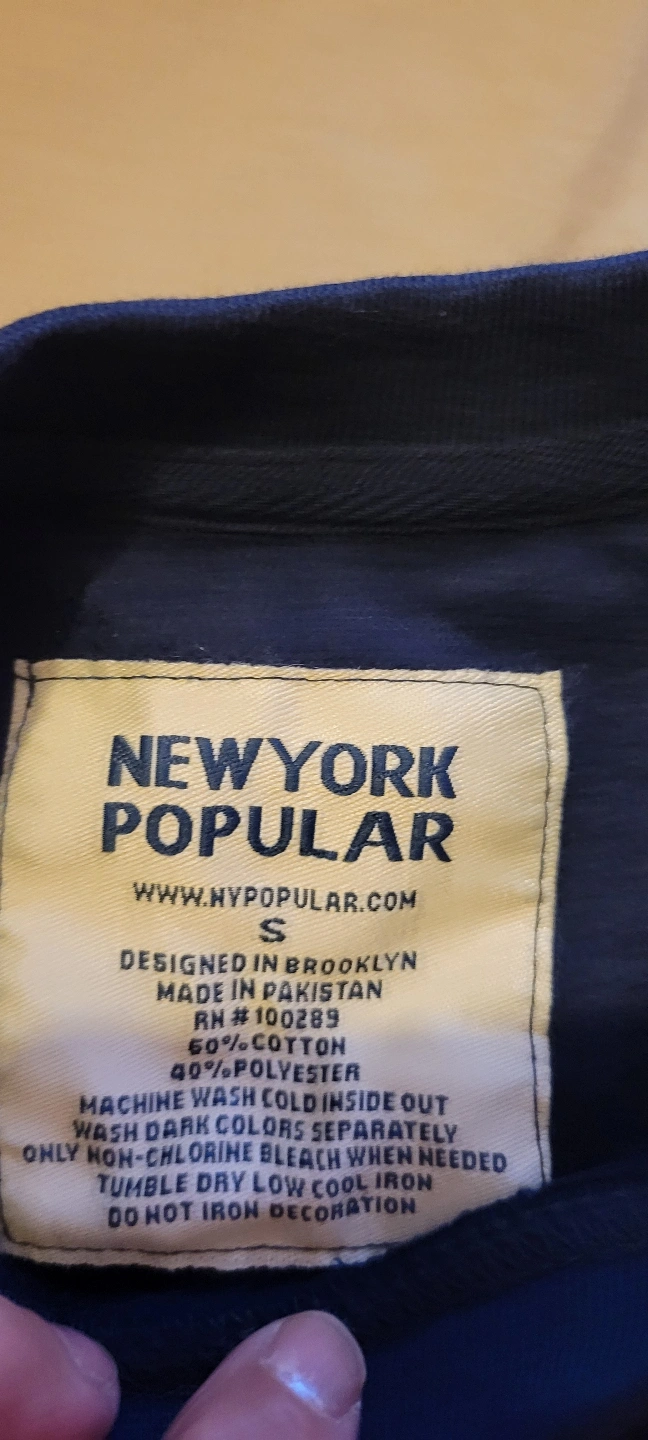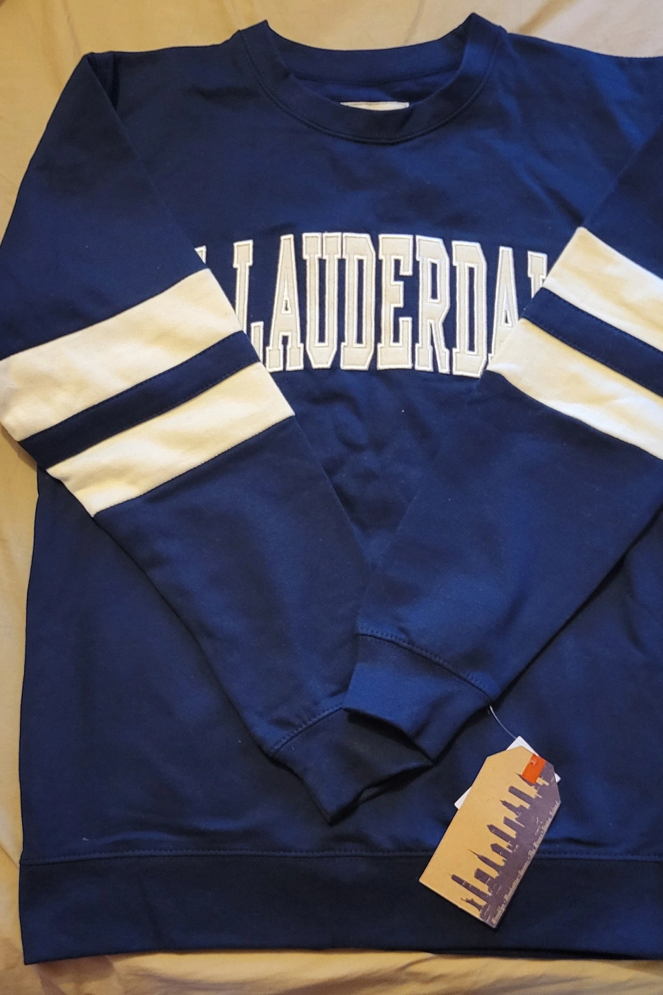 97Navy blue crewneck sweatshirt. Features white stripes on sleeves and Lauderda embroidered on the front. Size small. Designed in Brooklyn, made in Pakistan. 60% cotton, 40% polyester. rogers and dufferin
