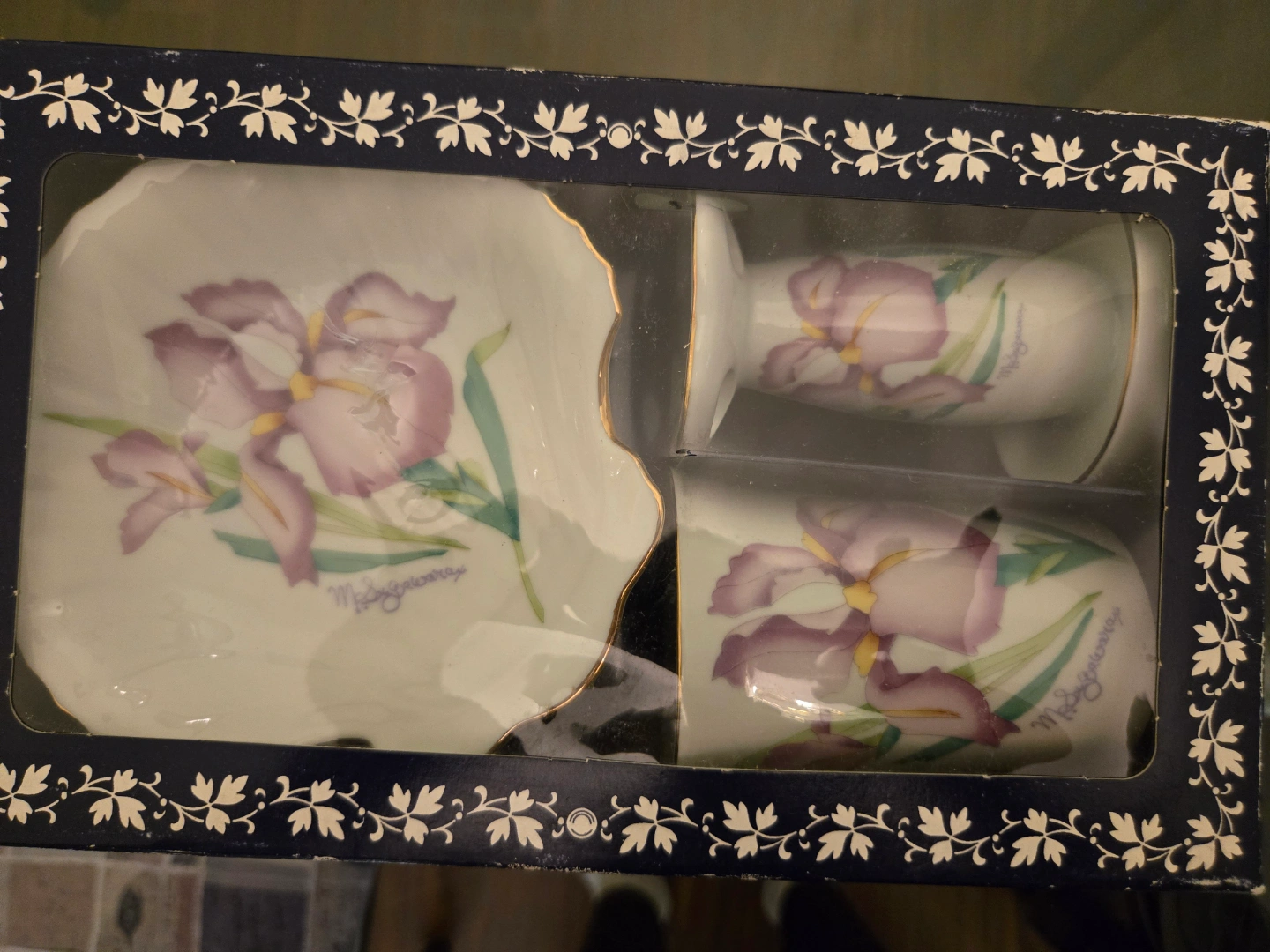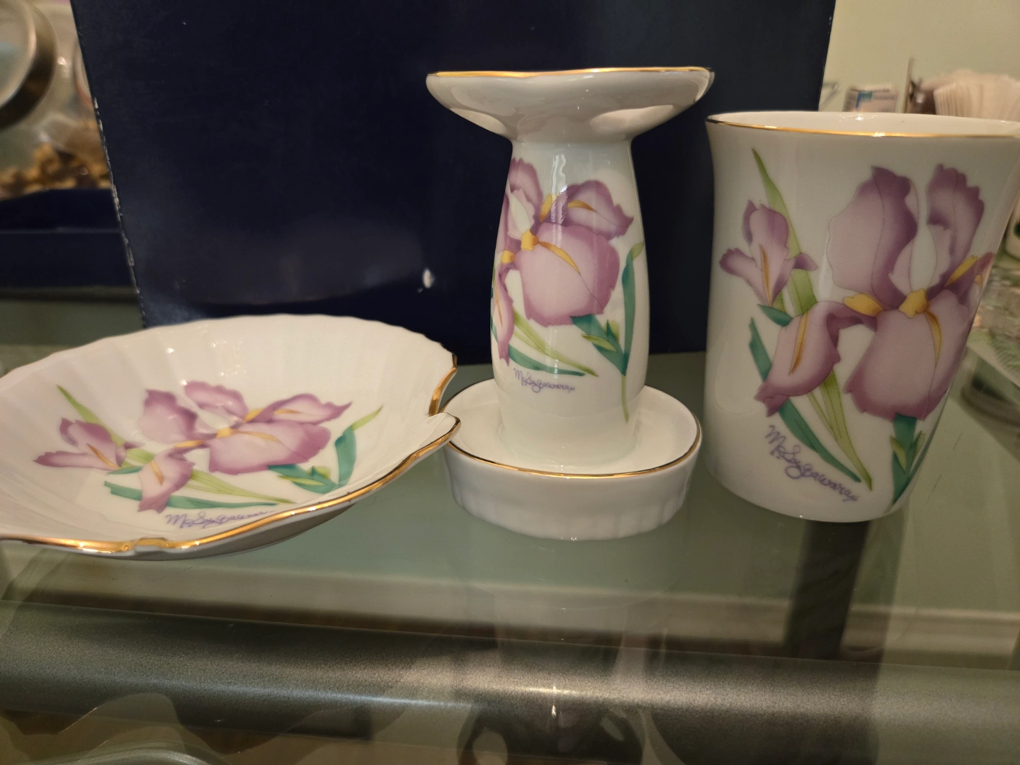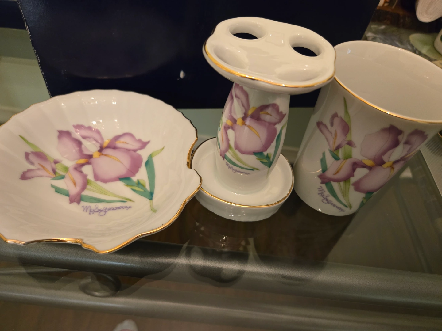 Beautiful porcelain bathroom set. Features a soap dish, tumbler, and toothbrush holder. Purple iris design. Gold accents. Excellent condition, in original box. Box is damaged.