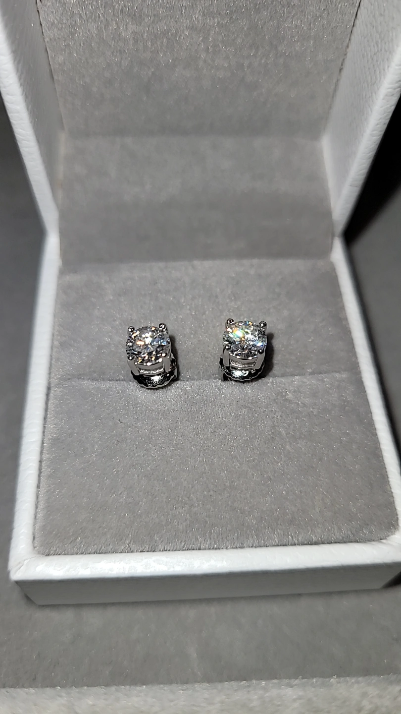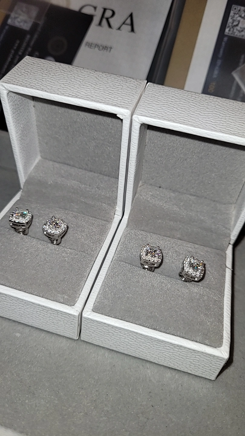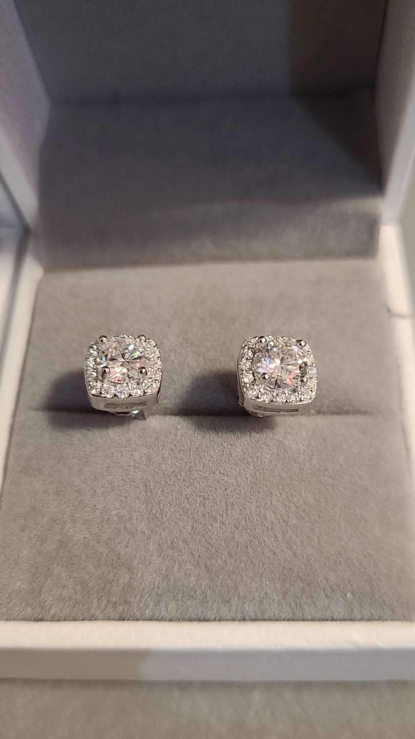 gra certified earrings made with 925 silver and flawless clarity d color lab stones that pass the diamond tester. Earrings include jewelery box and certification round studs, halo studs, honeycomb/cluster studs and hoops available