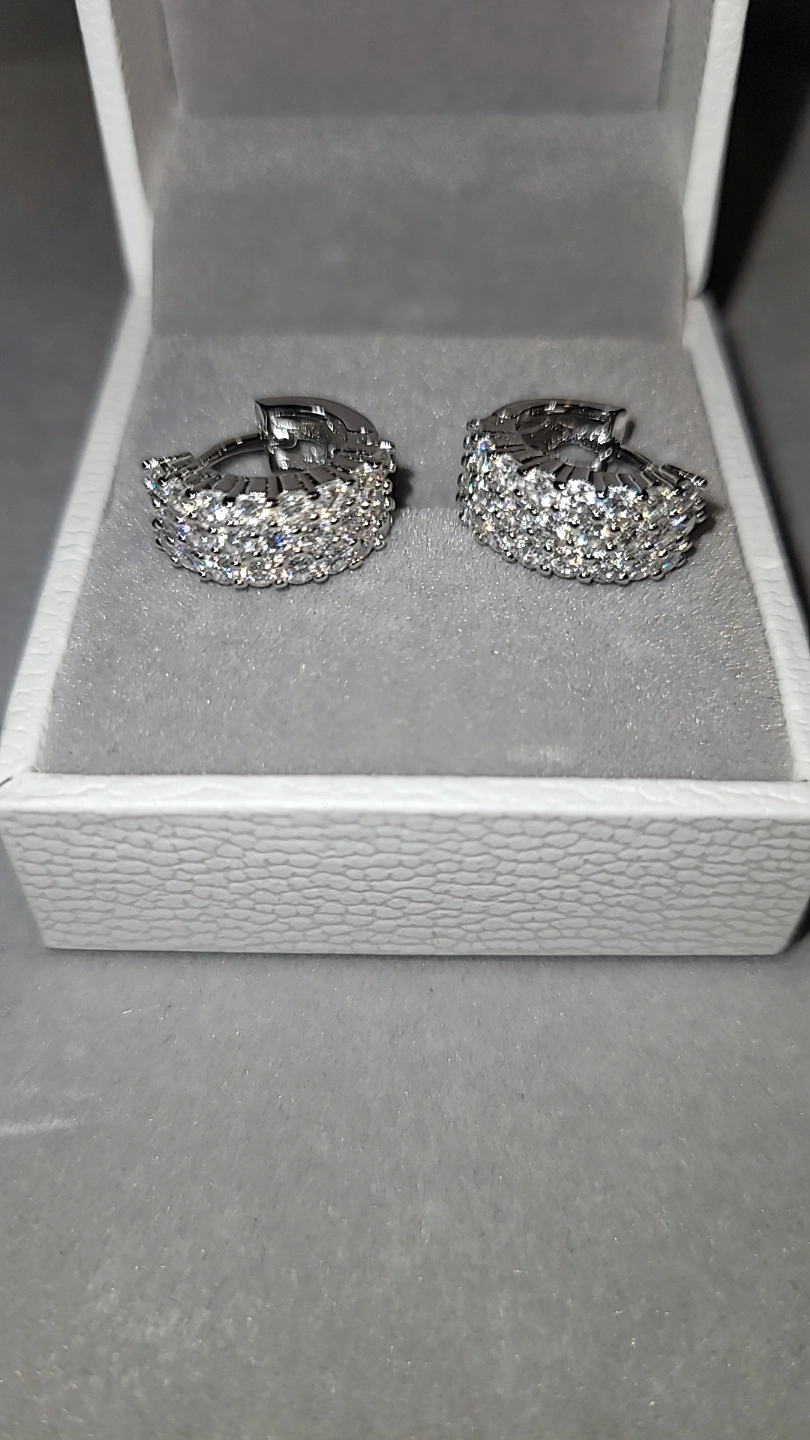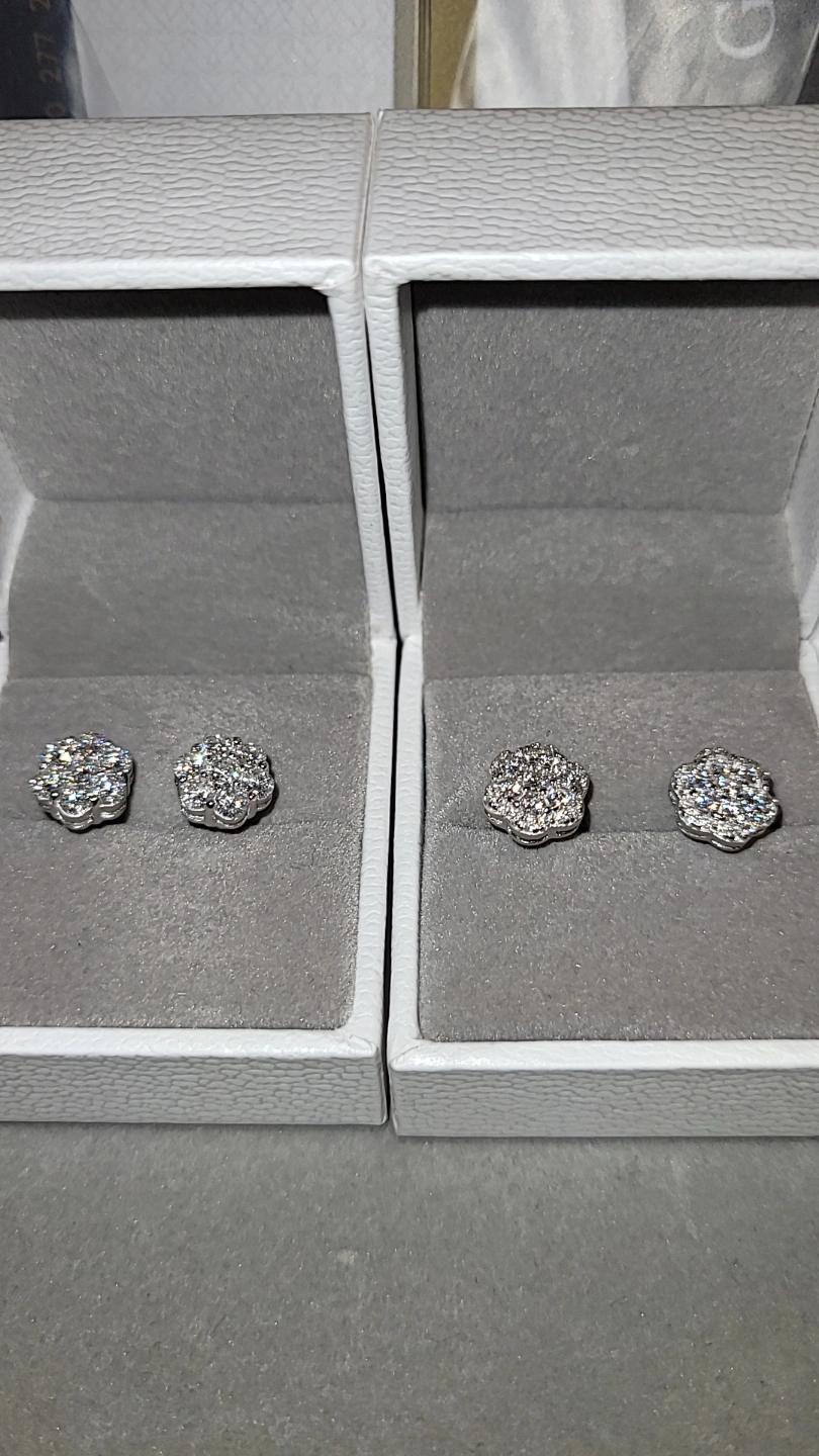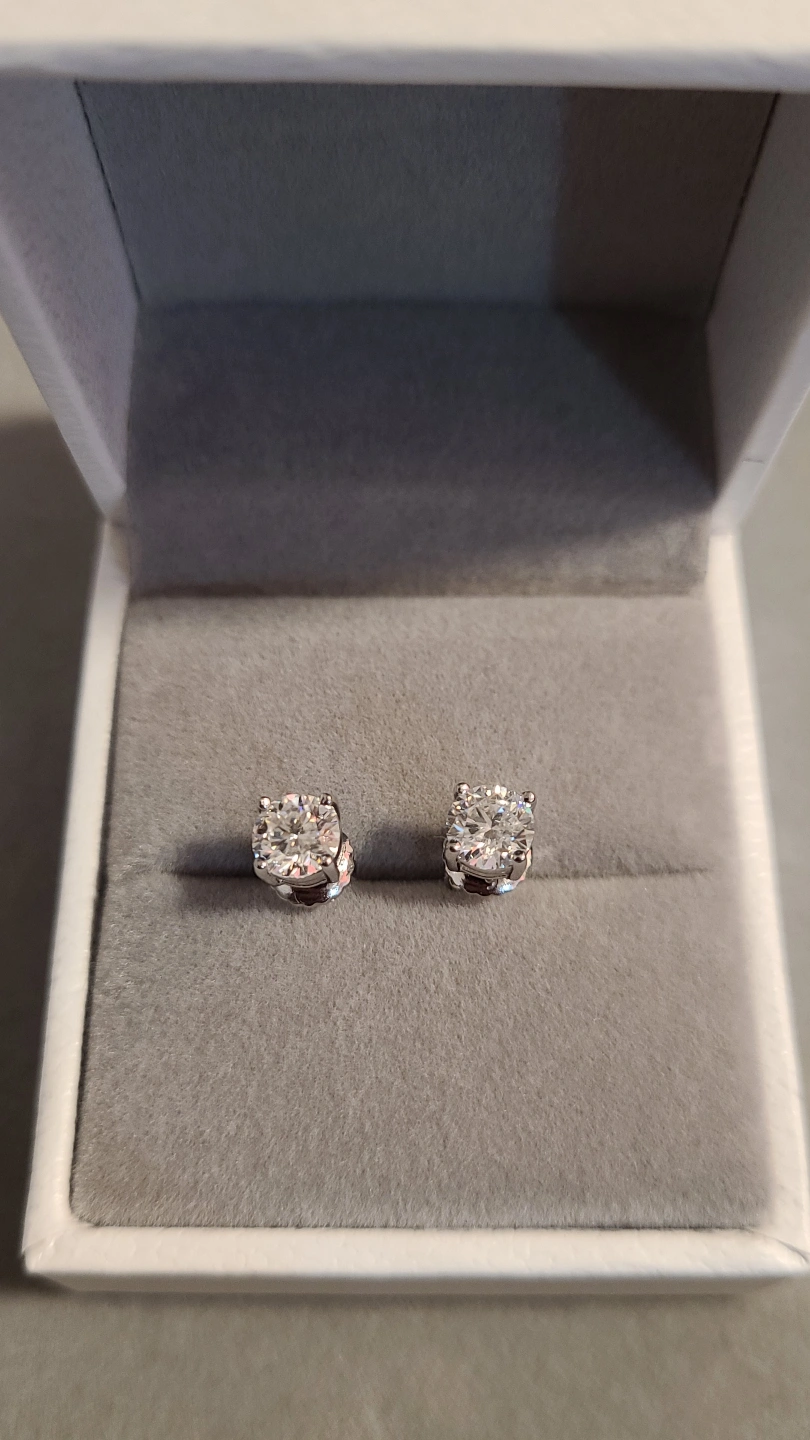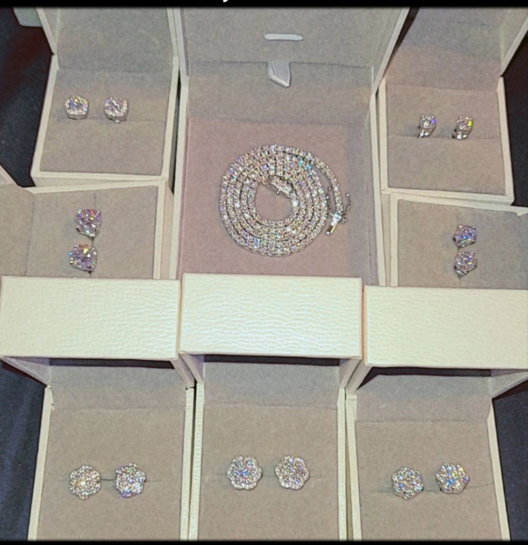 gra certified earrings made with 925 silver and flawless clarity d color lab stones that pass the diamond tester. Earrings include jewelery box and certification round studs, halo studs, honeycomb/cluster studs and hoops available