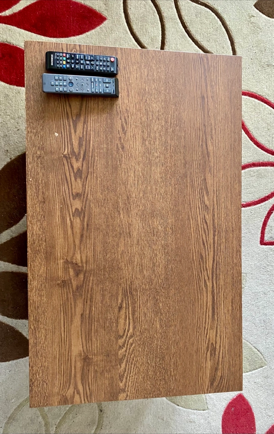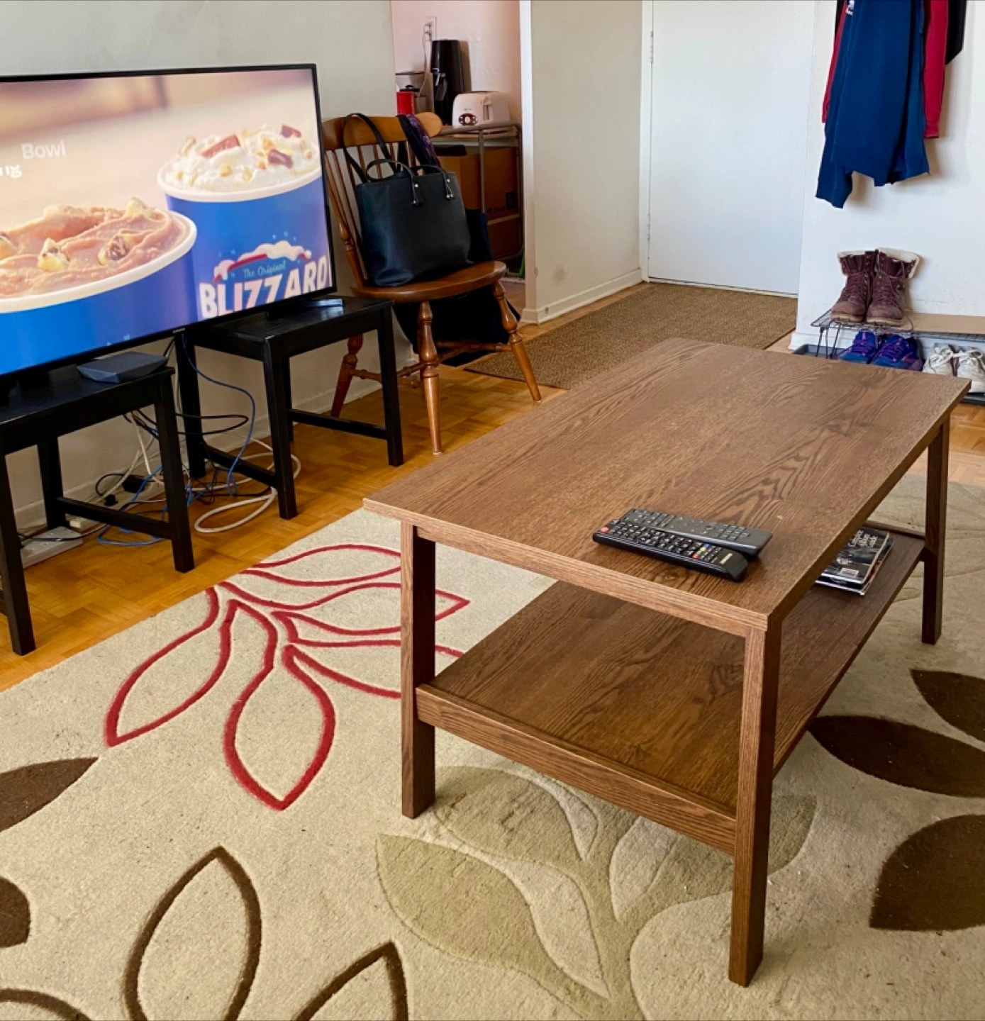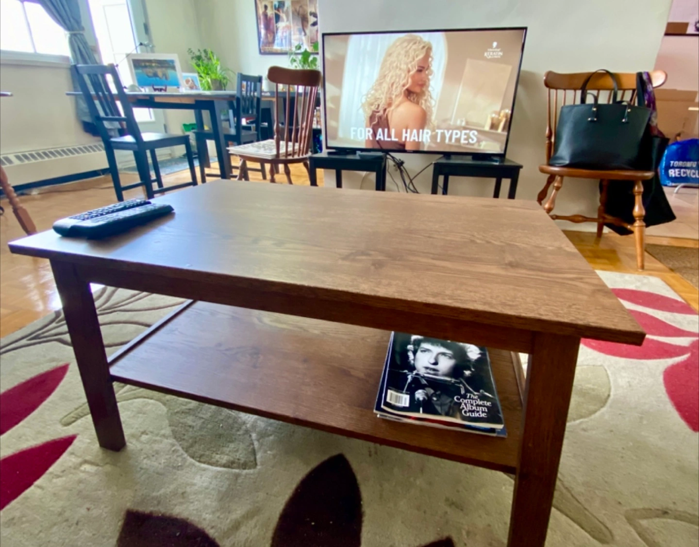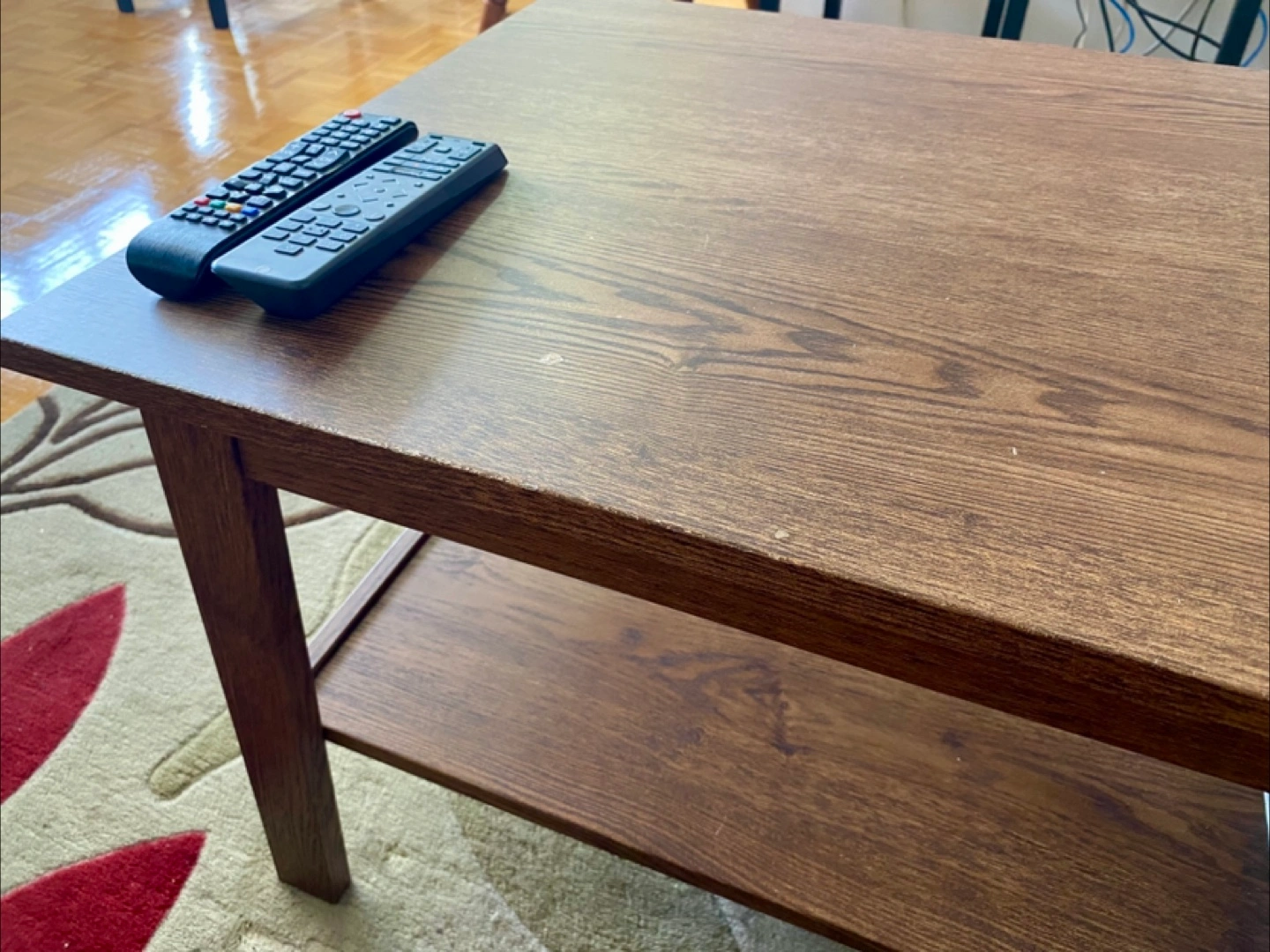 Coffee table. Dark brown wood finish. Features a lower shelf for storage. Great for living room.