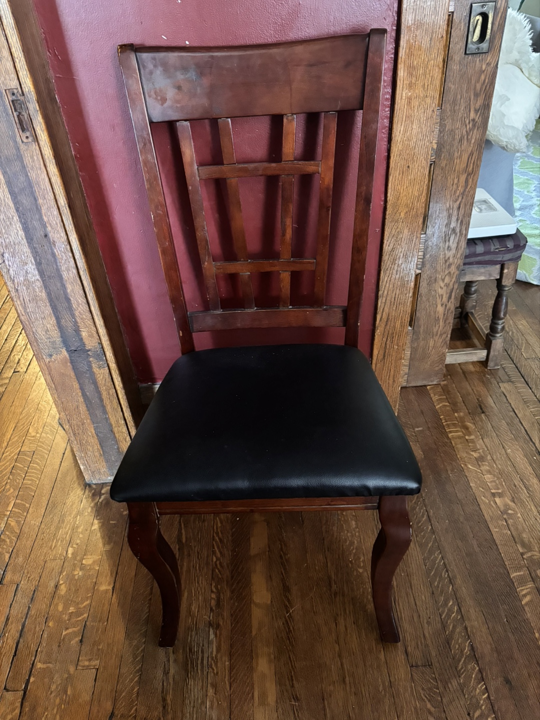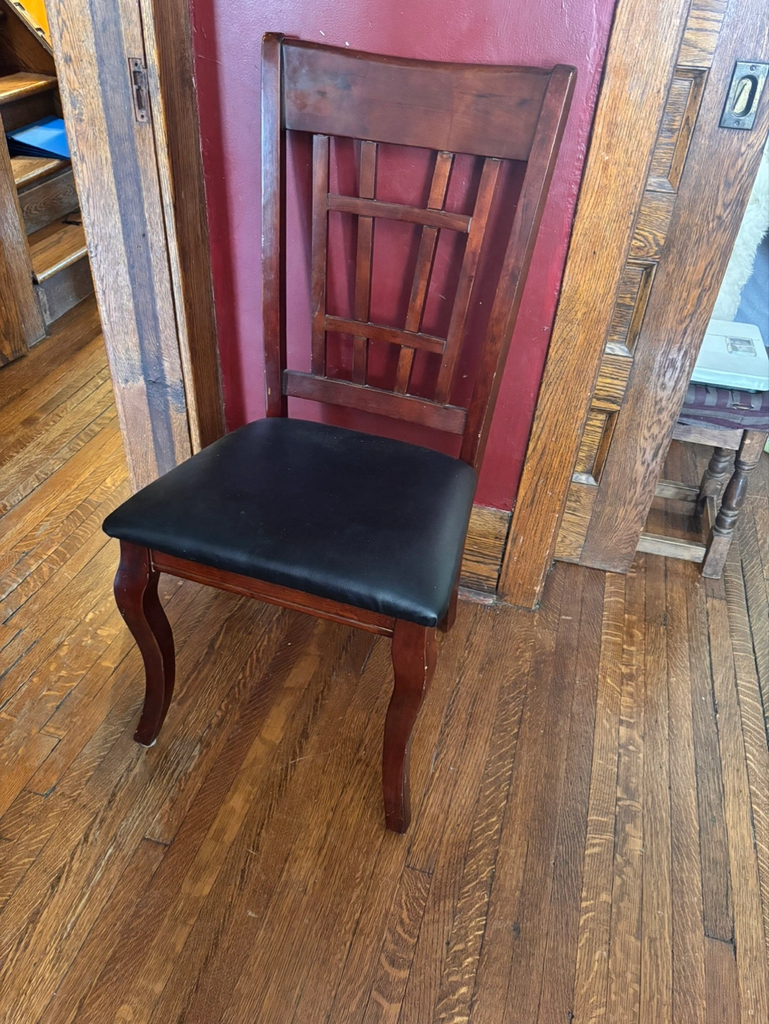 Dark brown wooden chair. Features a black vinyl cushioned seat. Simple, classic design. Good for kitchen or dining room.