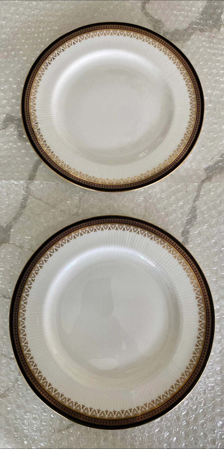 Includes 2 dinner plates, 2 salad/dessert plates, 2 bread plates, 2 saucers and 2 cups. Stunning pattern, great gift for a newlywed couple!