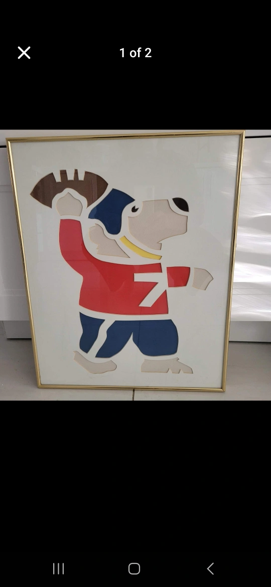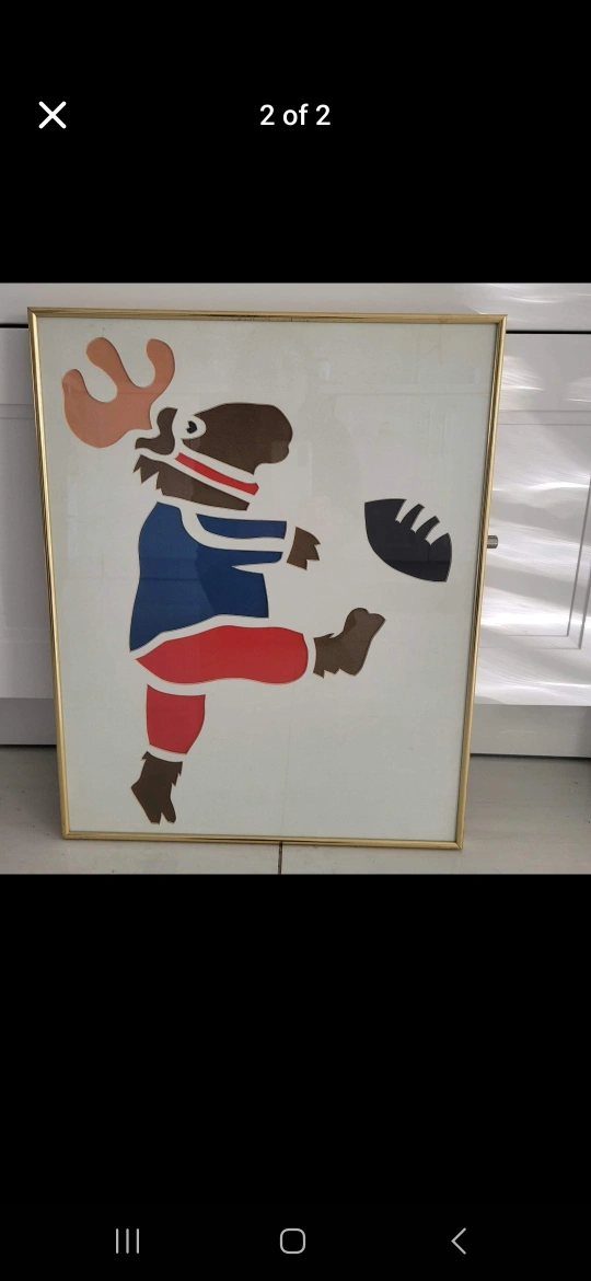 18Two framed prints featuring a dog and a moose playing football. Gold-toned frames. Unique layered design. Collectible art. Orginal price 140$. Brand new. Perfect for a kids room or football fan