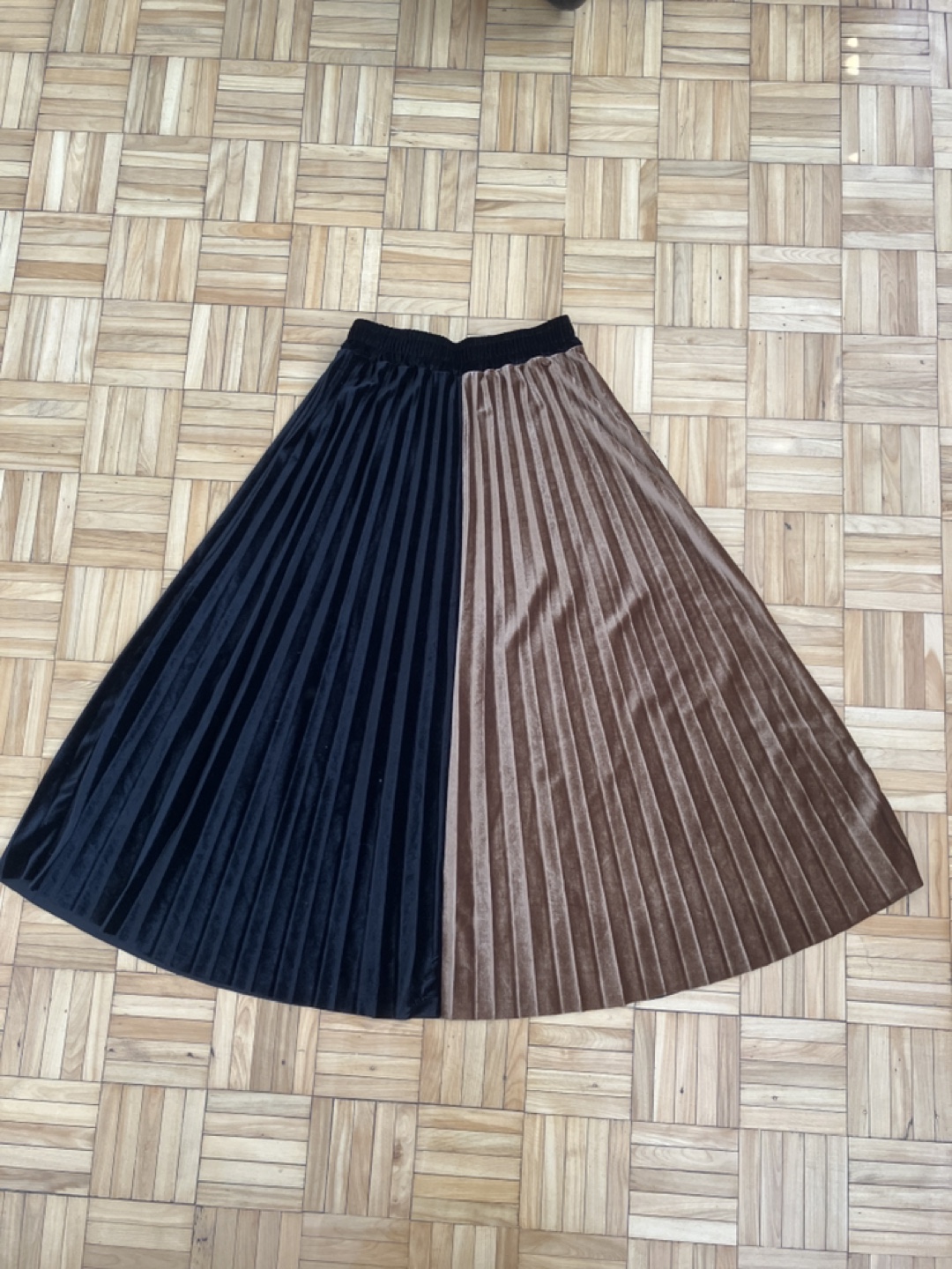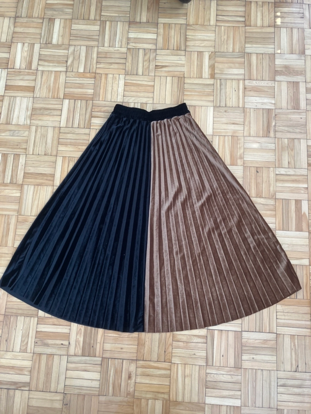 Velvet midi skirt. Features a pleated design and two colours: black and brown. Elastic waistband. Says large but fits smaller.