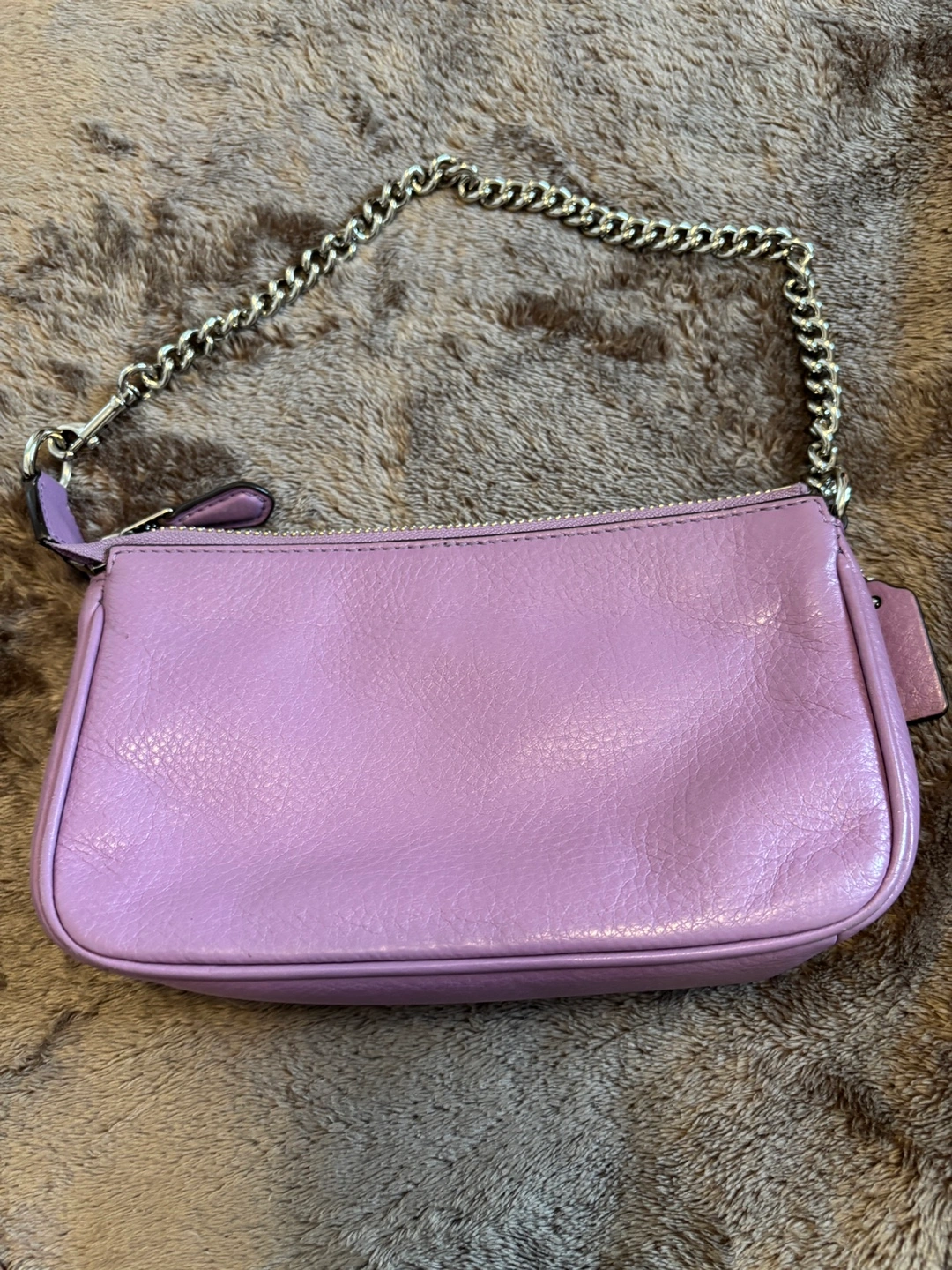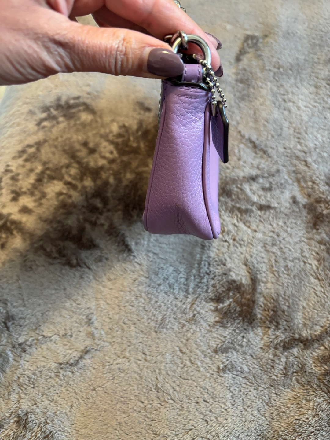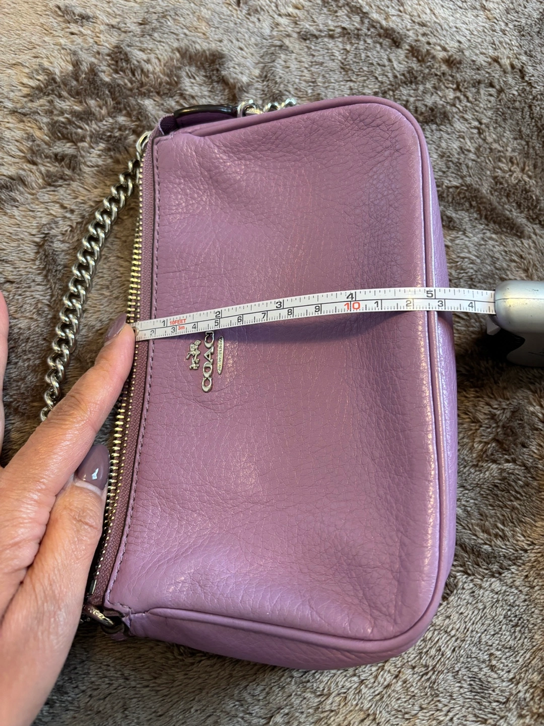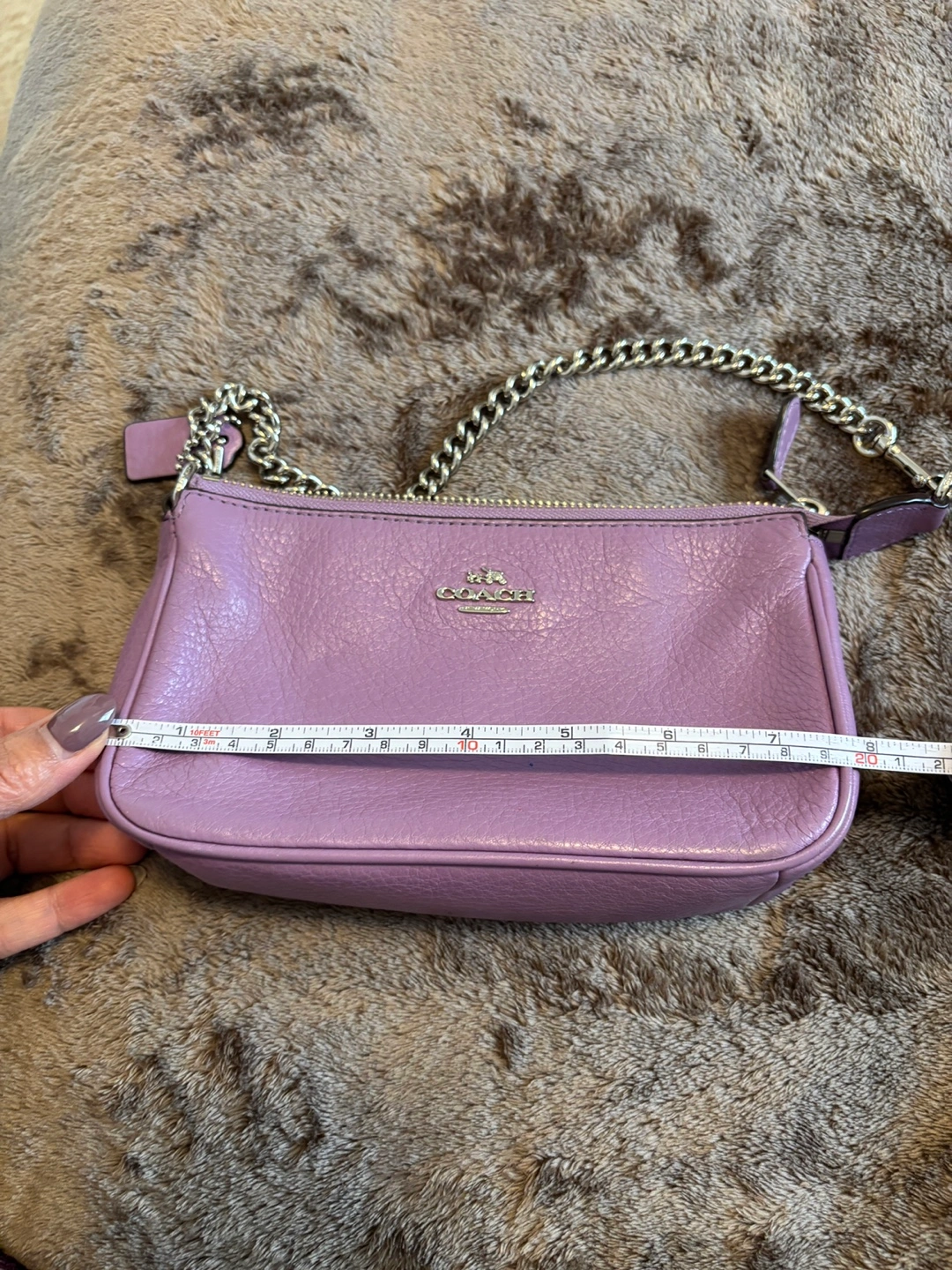 Adorable mini purple leather bag. Features a silver chain strap and zip closure. Small interior pocket. Perfect for evenings out.