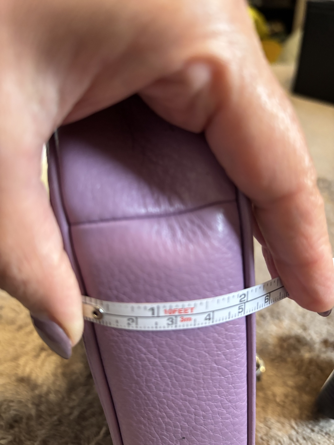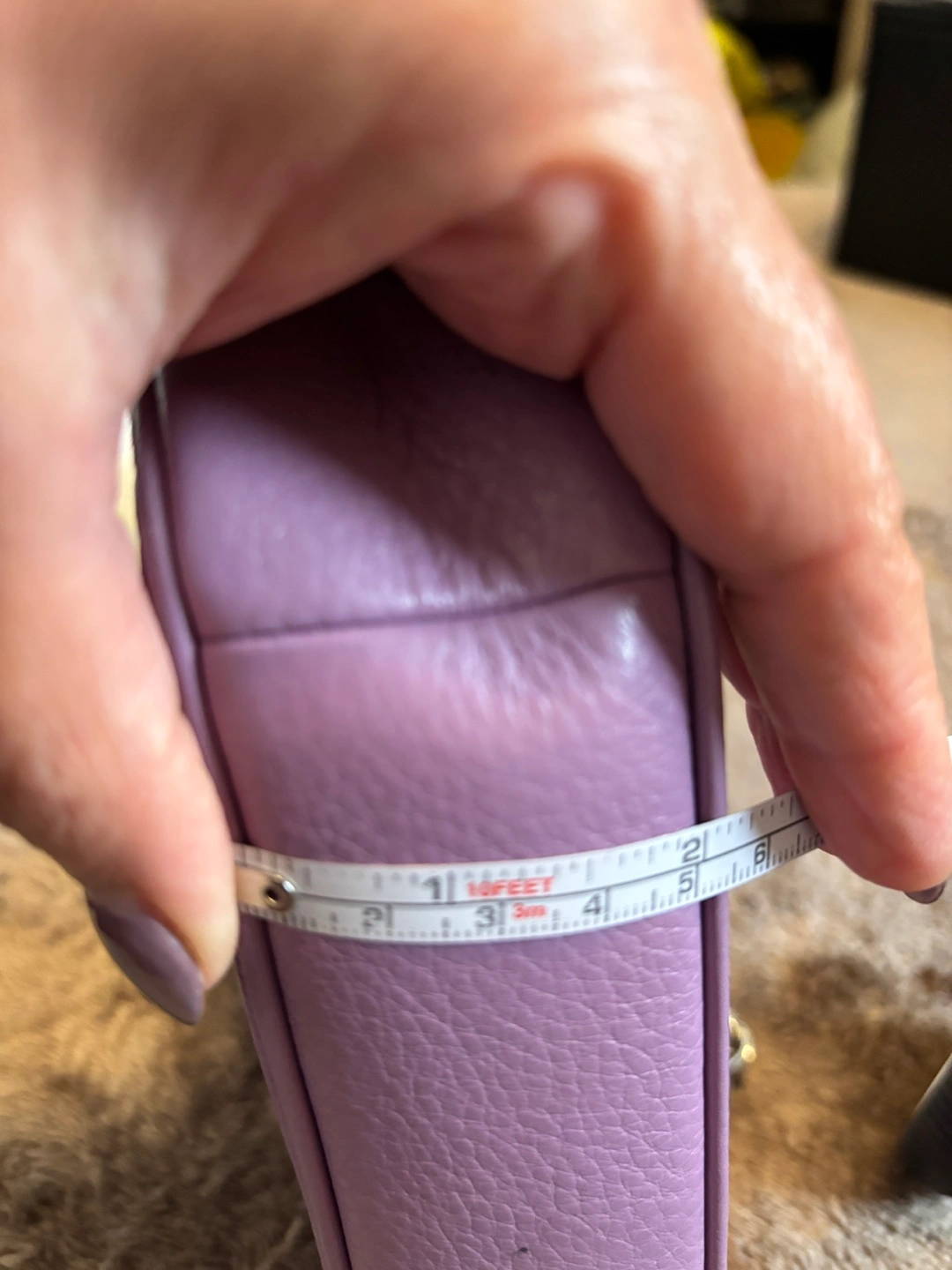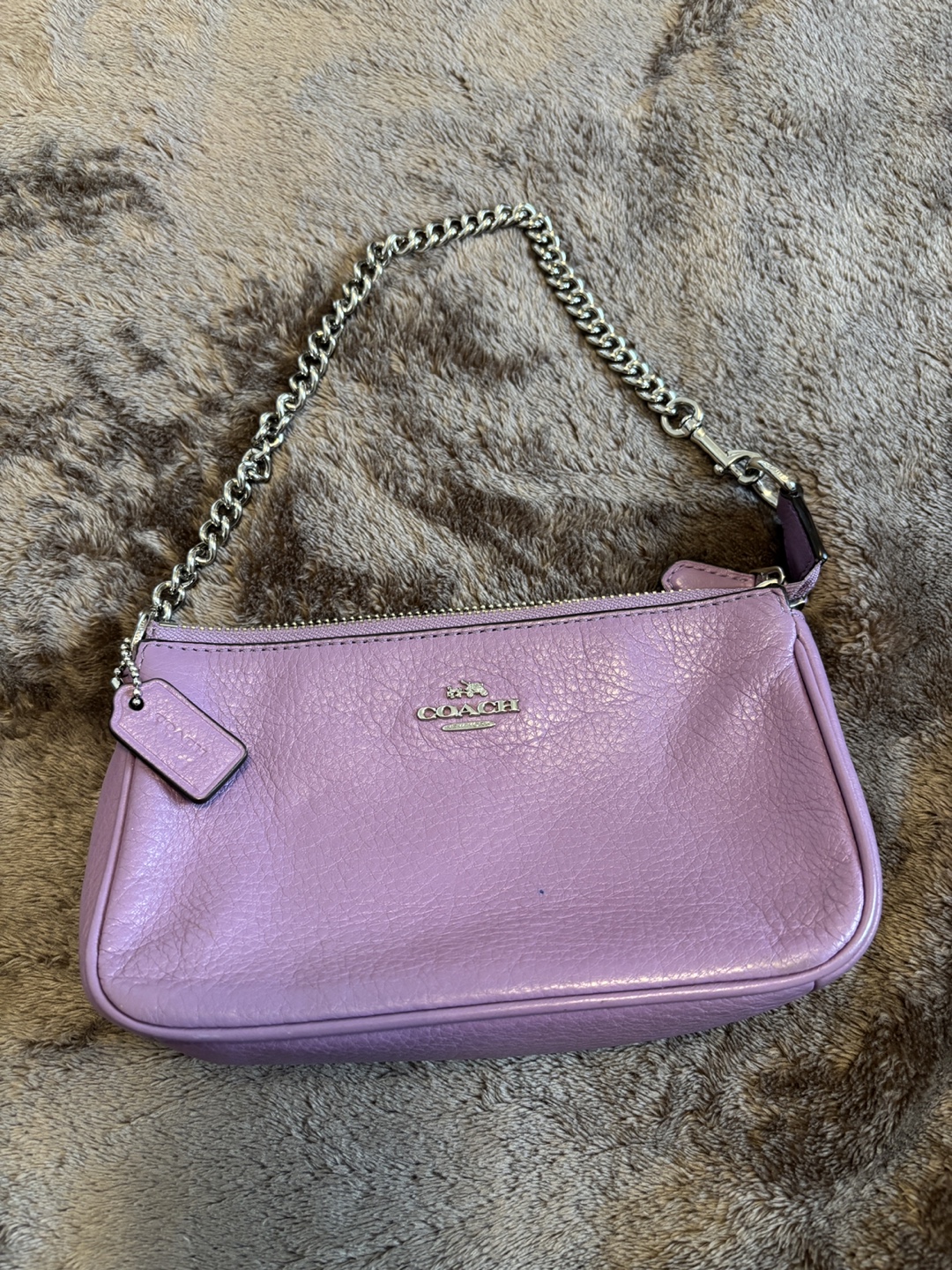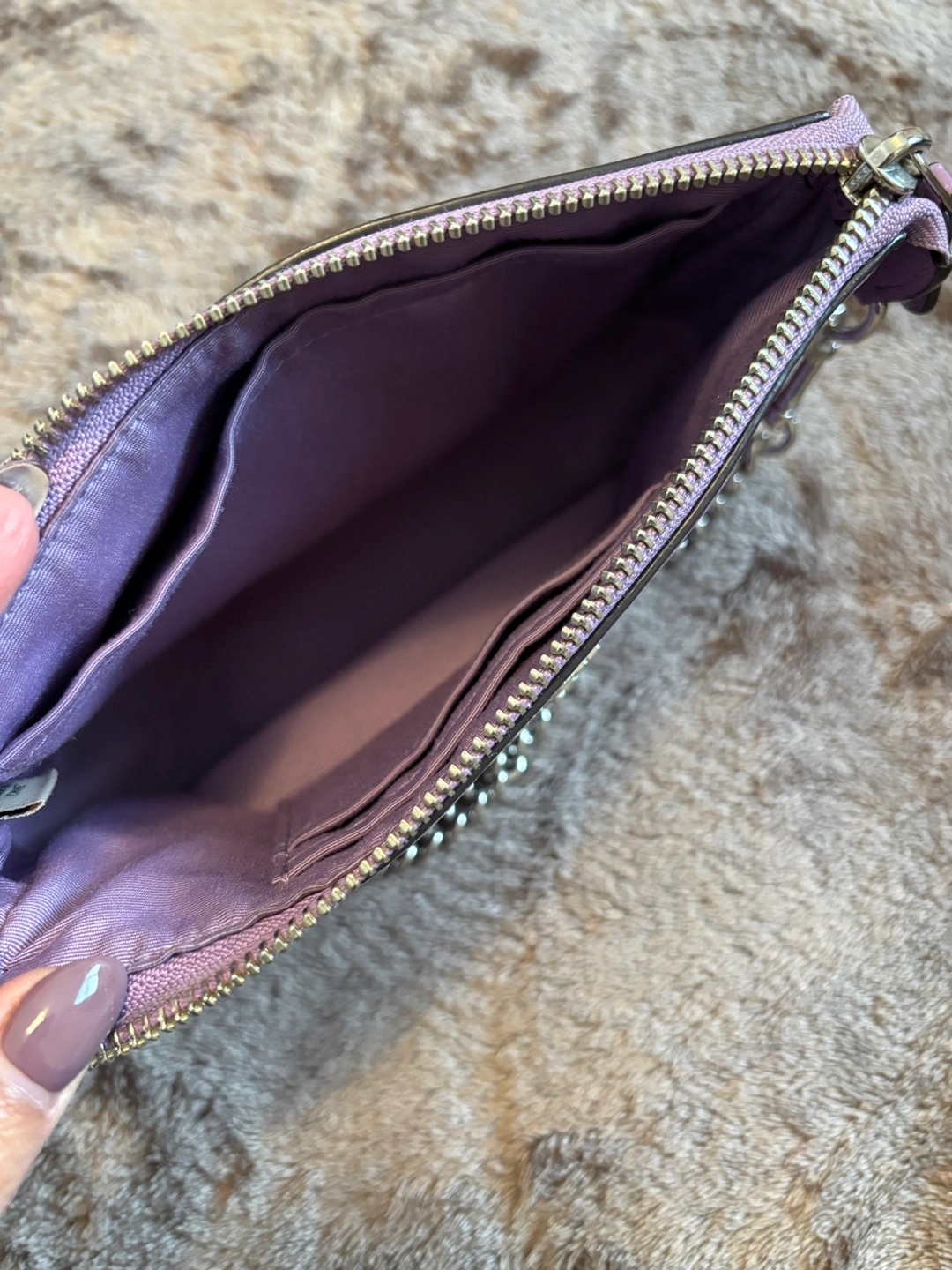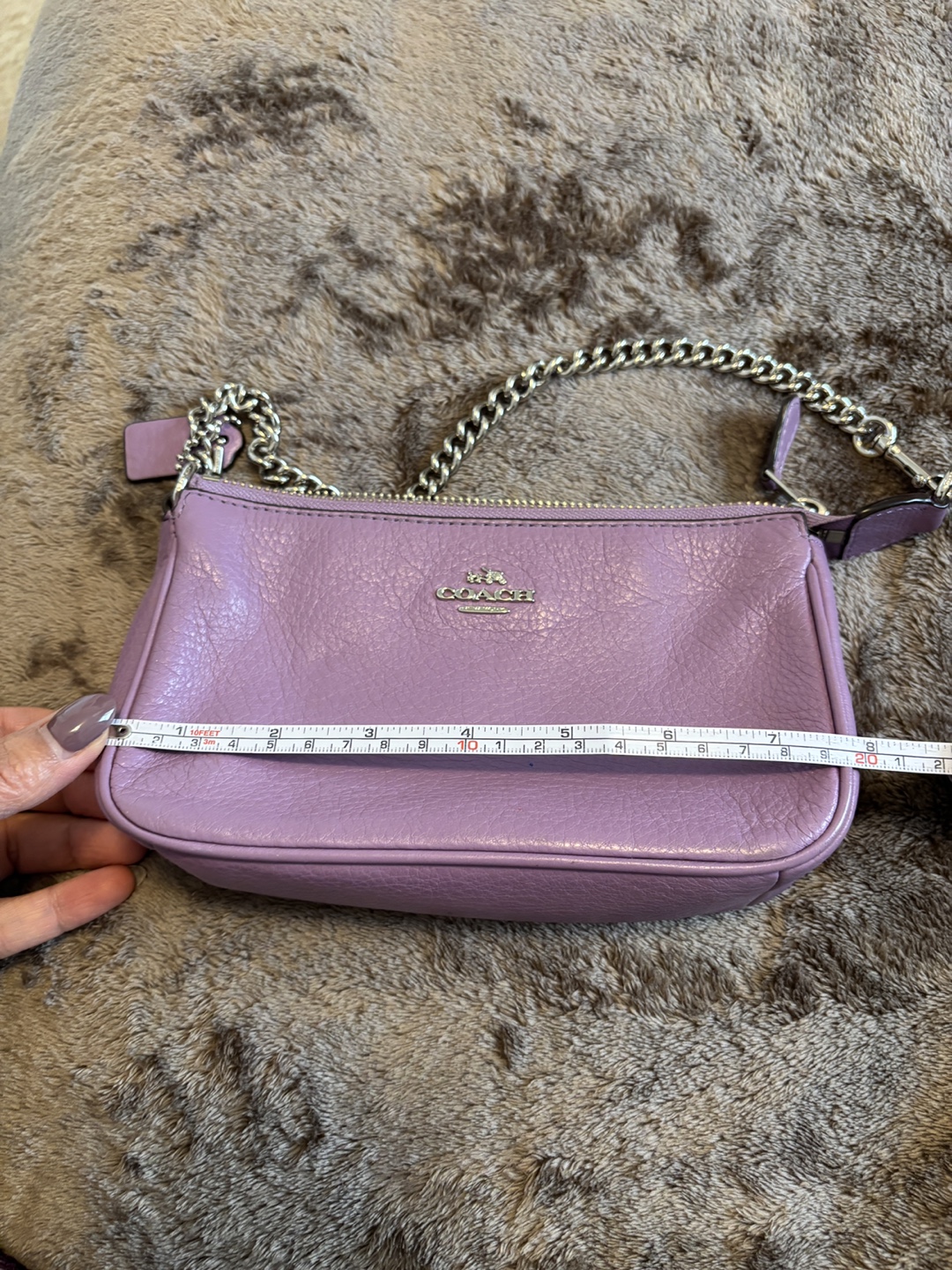 Adorable mini purple leather bag. Features a silver chain strap and zip closure. Small interior pocket. Perfect for evenings out.