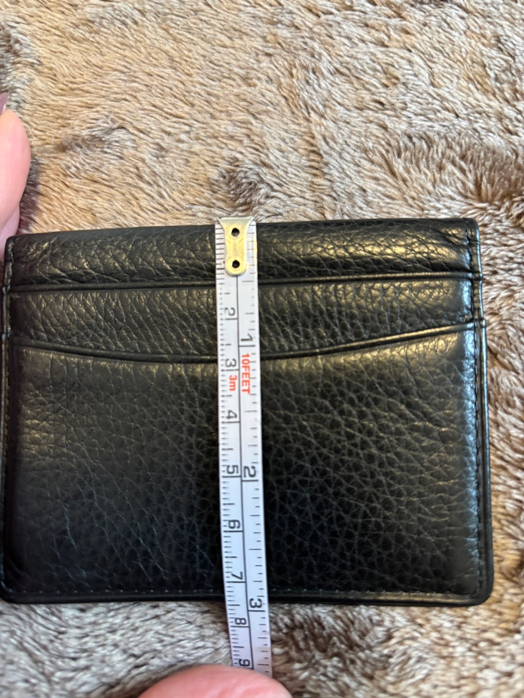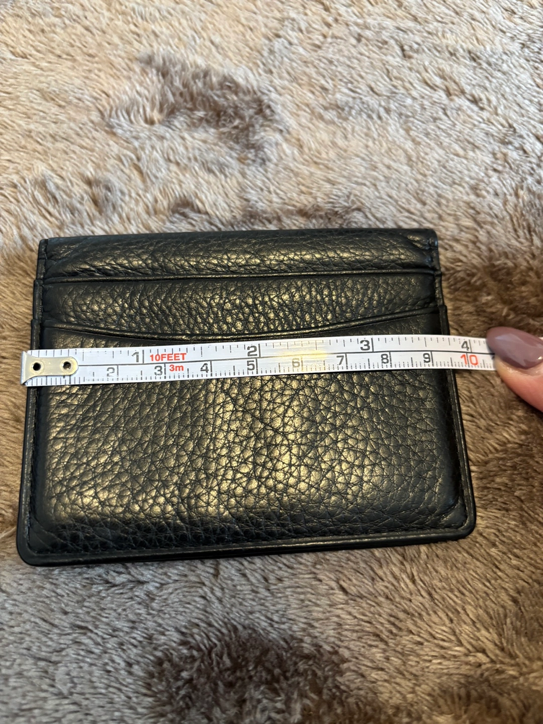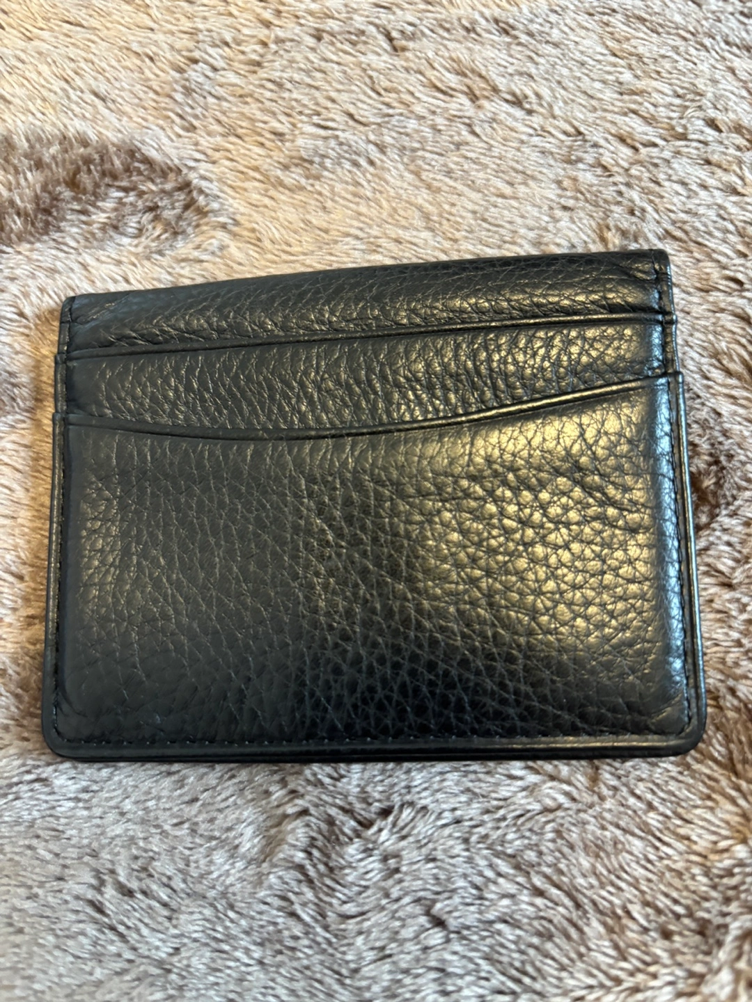 Compact black leather card holder. Multiple card slots. Measures approximately 3.5 inches by 2.5 inches. Great for minimalist needs.