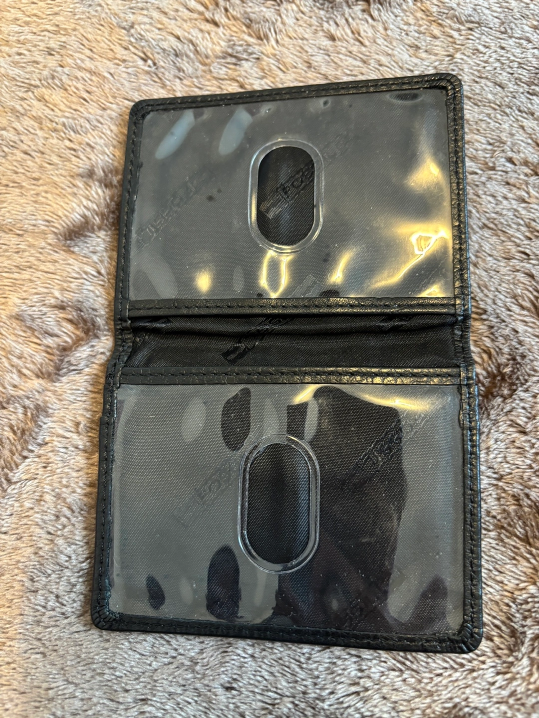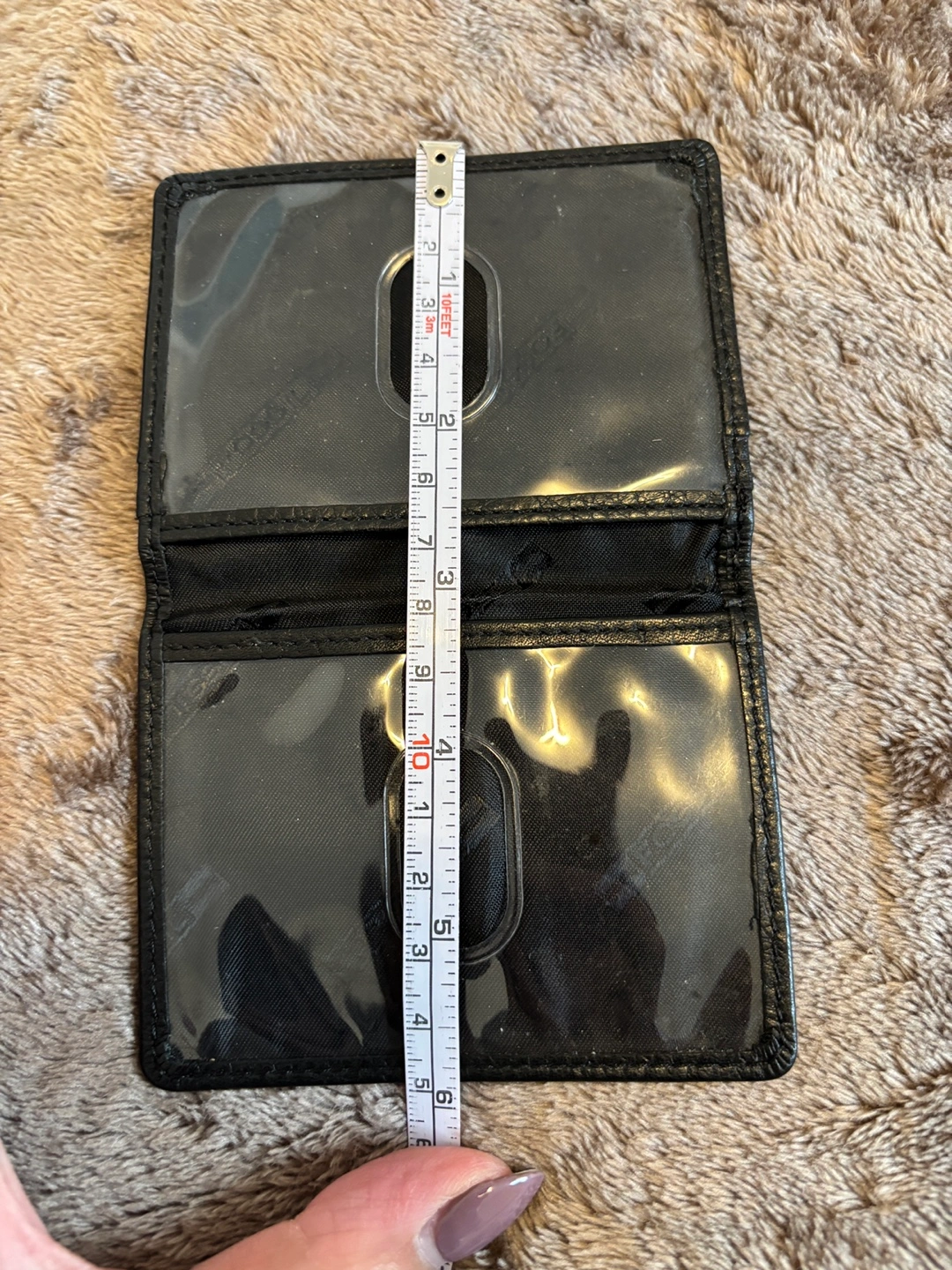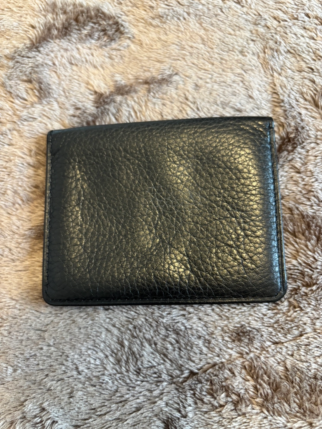 Compact black leather card holder. Multiple card slots. Measures approximately 3.5 inches by 2.5 inches. Great for minimalist needs.