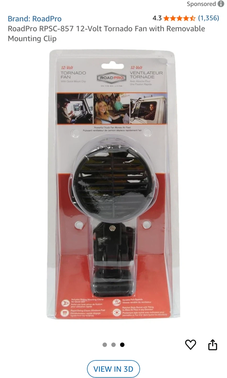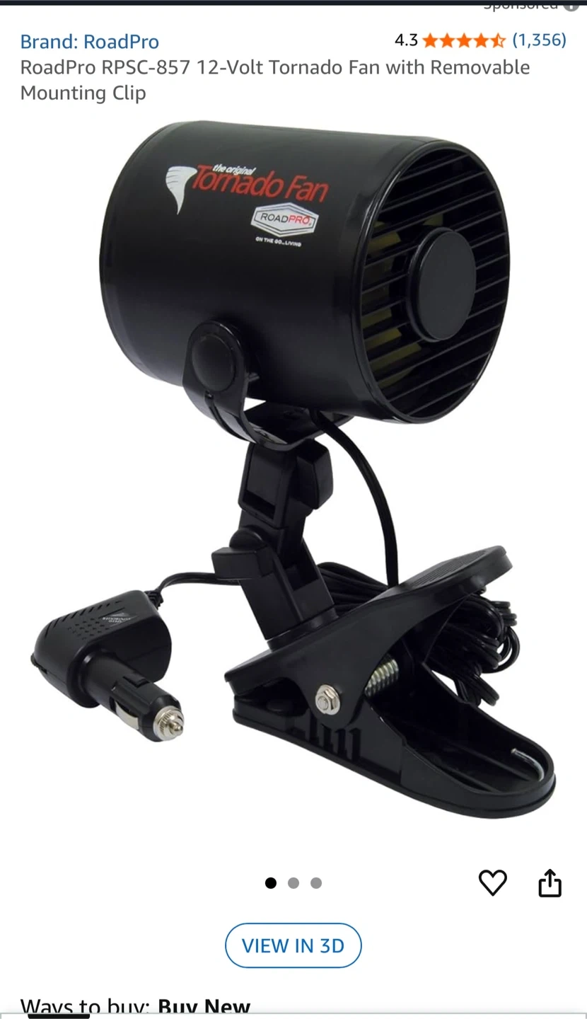 6512-volt fan. Powerful fan moves air fast. Includes strong mounting clamp for quick use. Multiple swivel points allow air flow in any direction. Variable speed control. Made in China.