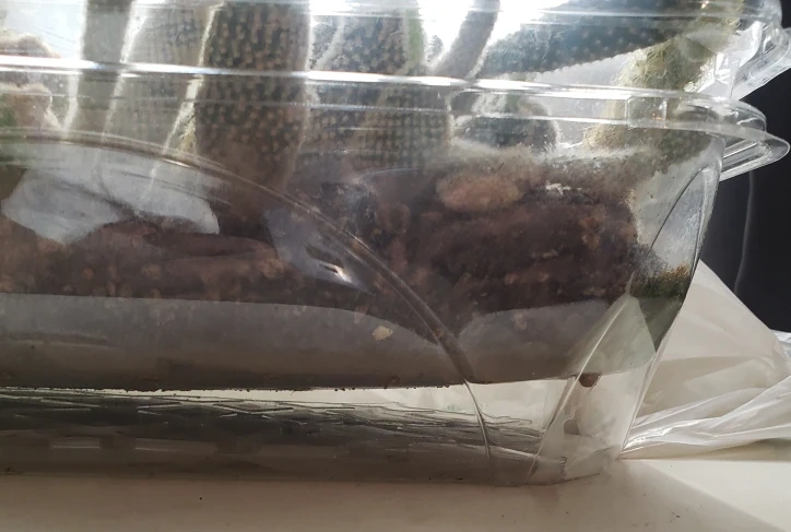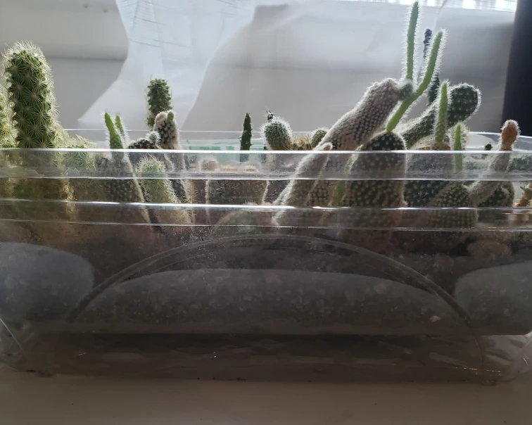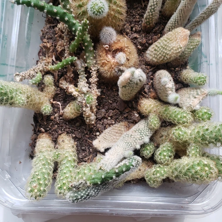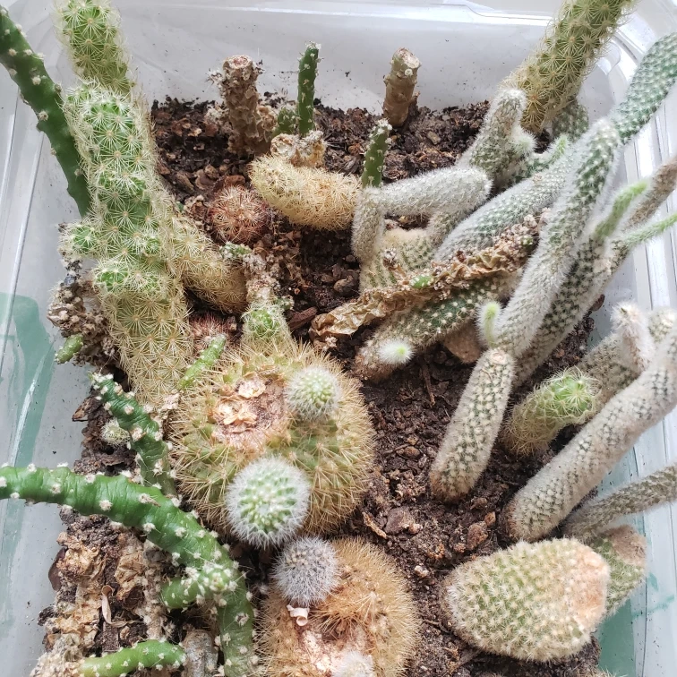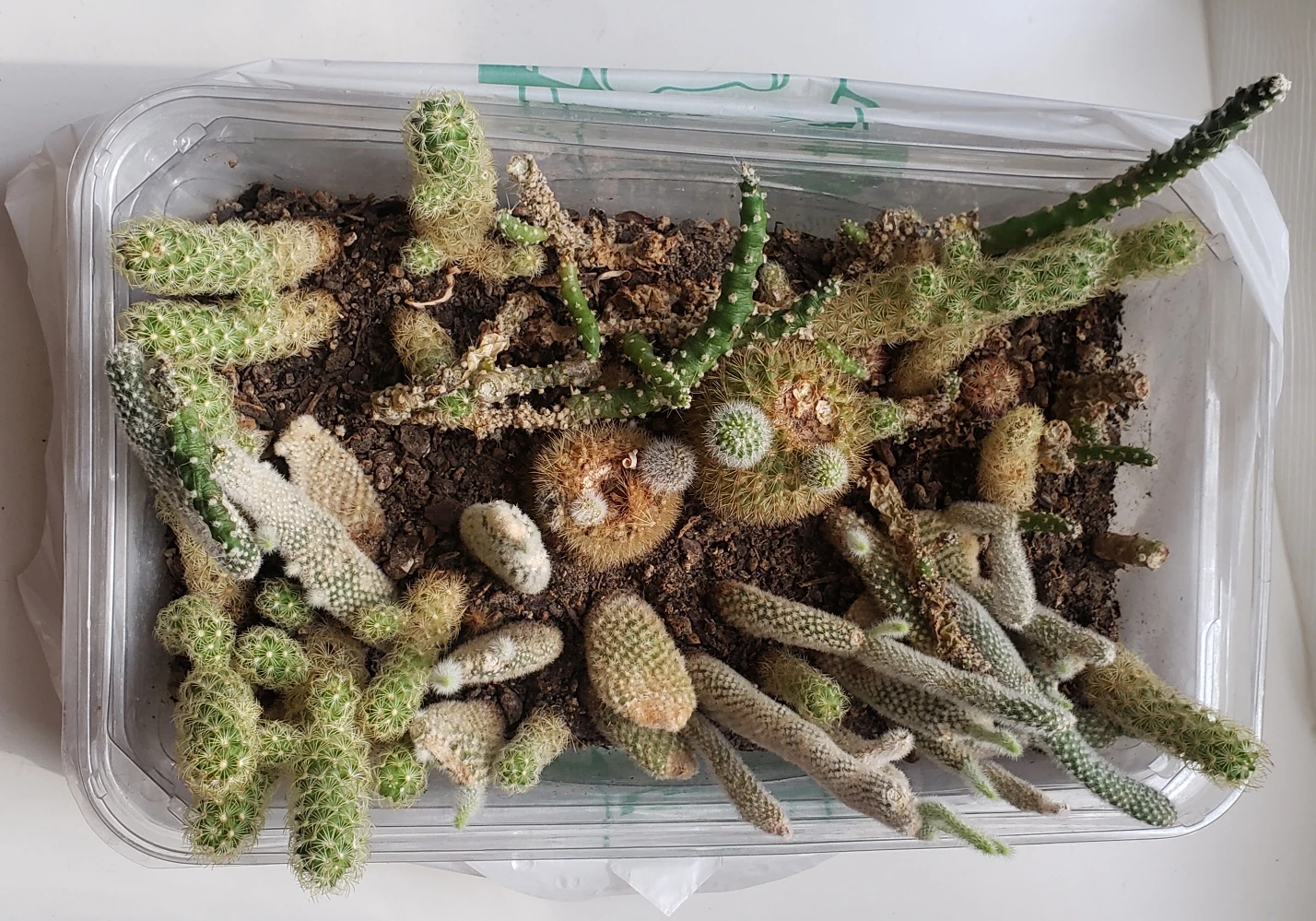 Collection of various cacti planted together in a clear plastic container. Soil appears dark brown. Multiple types and sizes of cacti present. Good for adding to your existing collection or starting a new one.