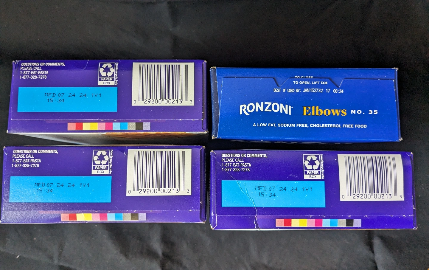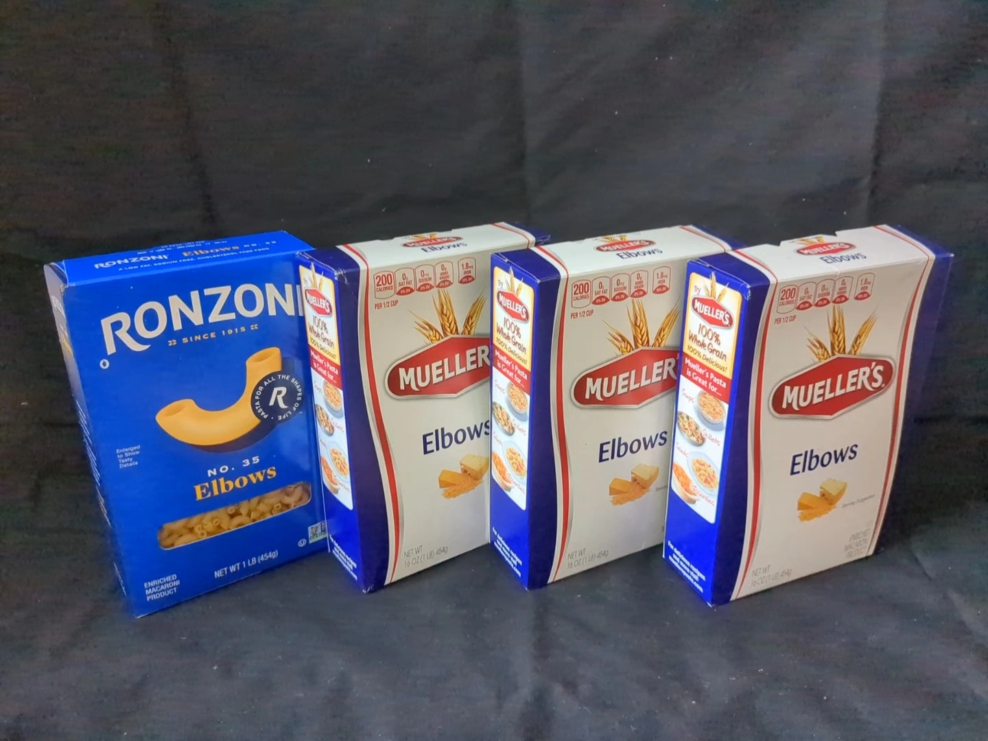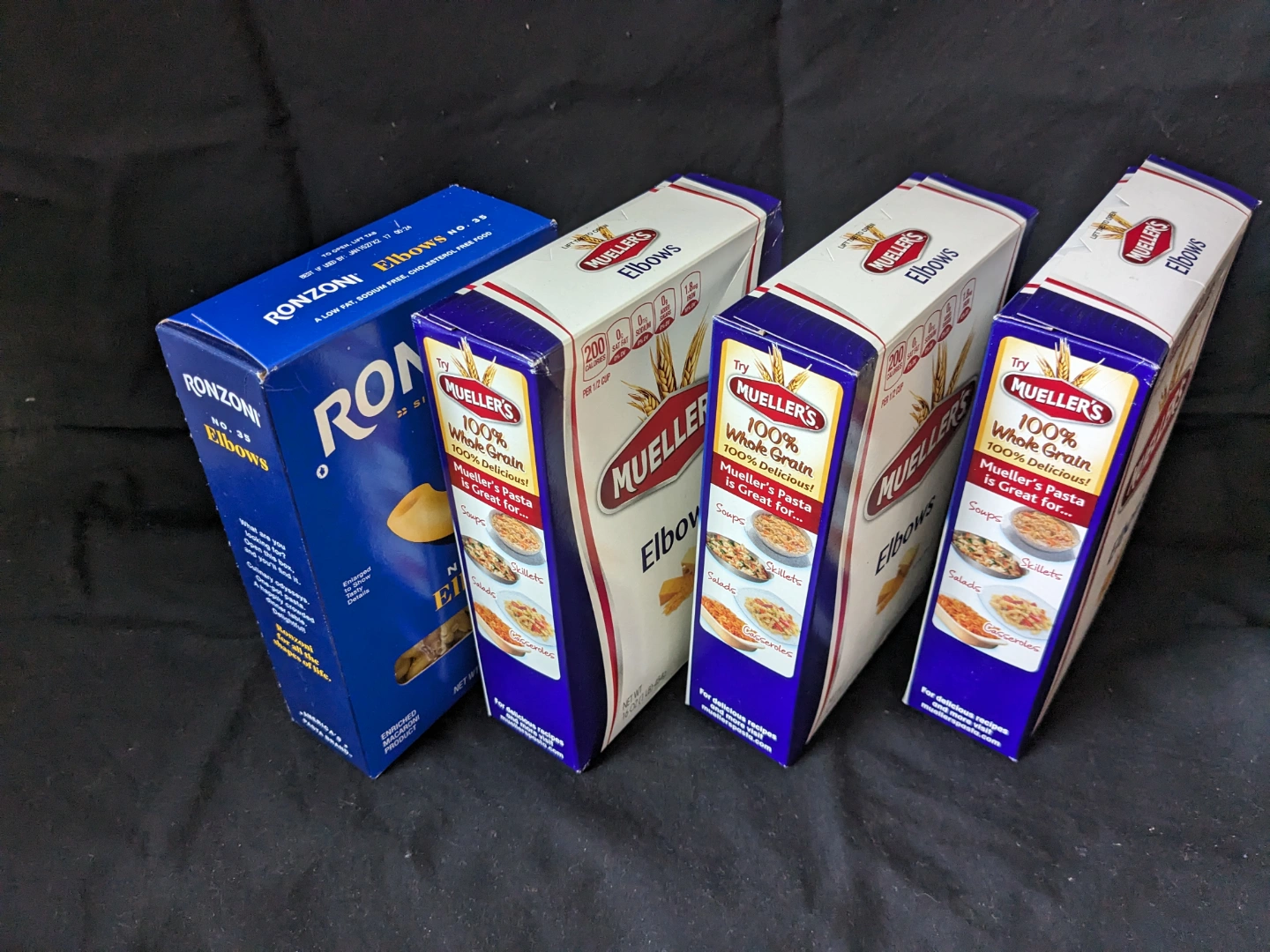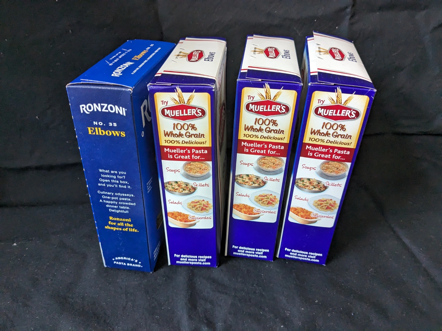 Five boxes of elbow macaroni. One box Ronzoni, and three boxes Mueller's 100% Whole Grain.