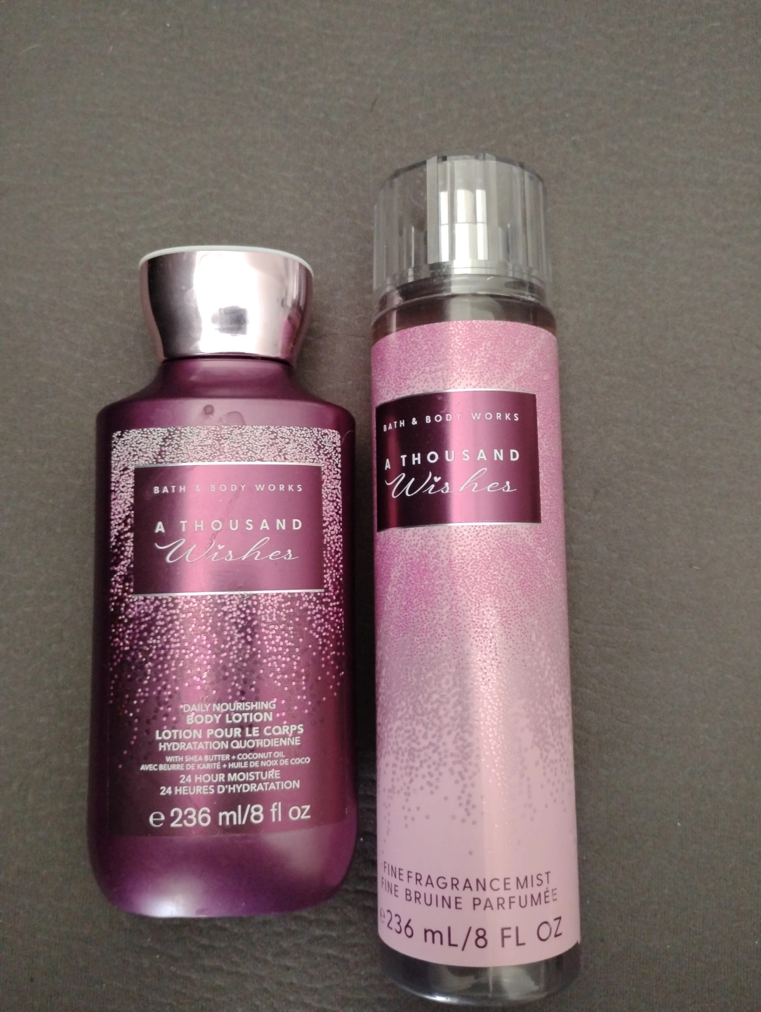 A Thousand Wishes body lotion and fine fragrance mist. Daily nourishing lotion with shea butter and coconut oil. 24-hour hydration. Fine fragrance mist. Each 236 ml/8 fl oz. unopened and 15 each for brand new but I'm selling both for only 10 together