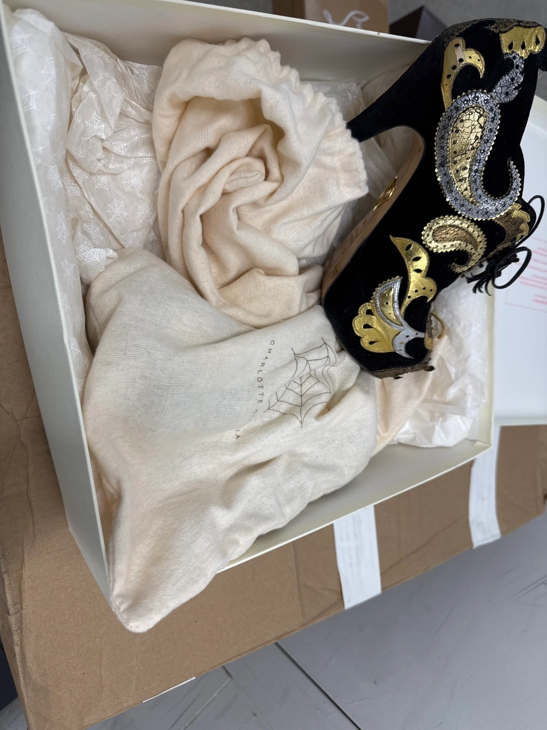 121Stunning black suede heels. Gold and silver embellishments. Lace-up detail. Come in original box and dust bag.