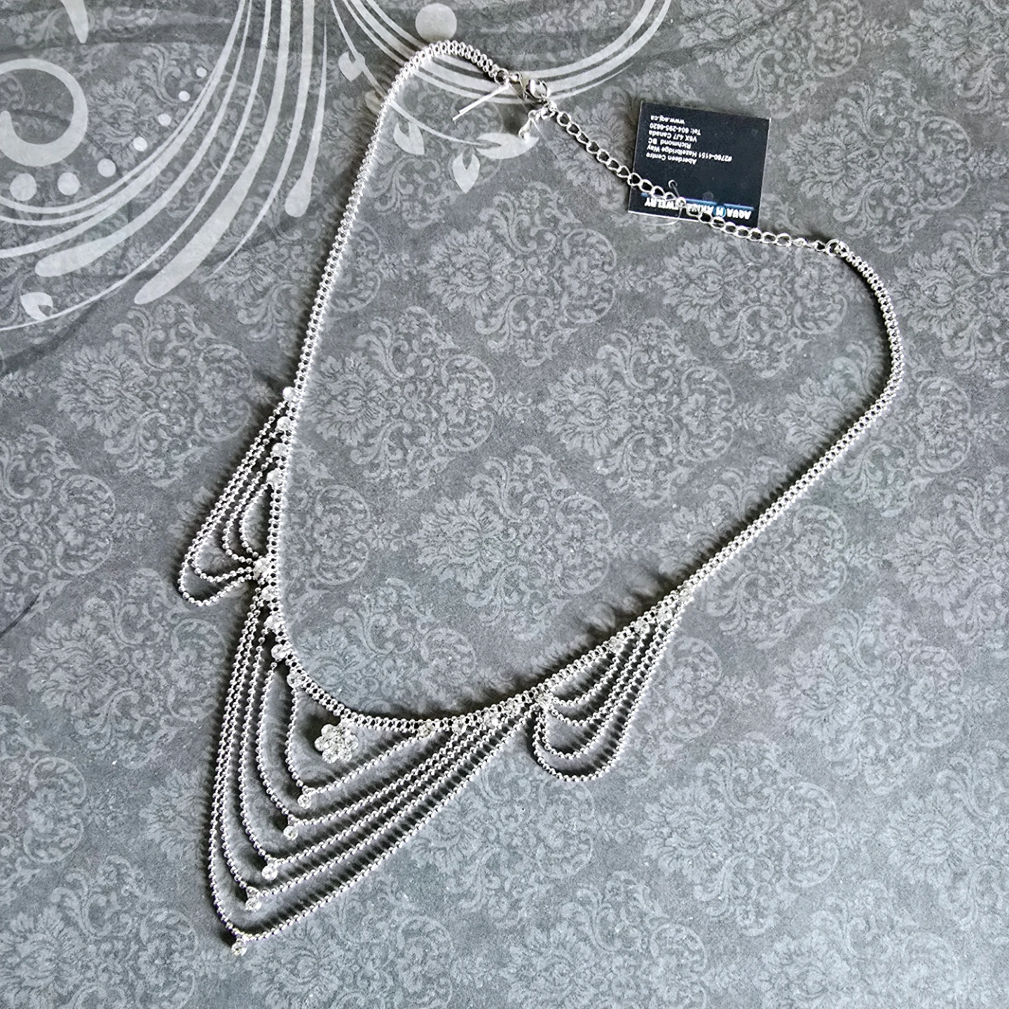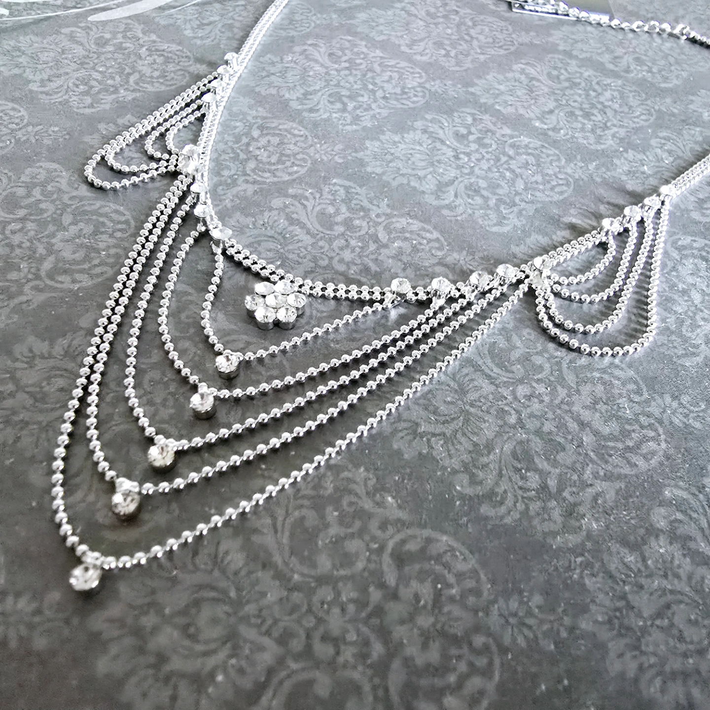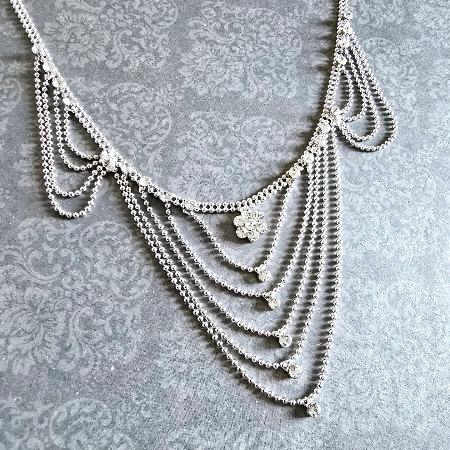 69Elegant silver tone necklace. Features multiple strands of beaded chains and clear rhinestones. Beautiful cascading design. Perfect for special occasions.