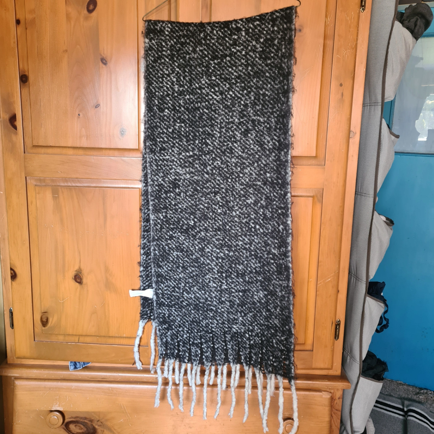 Long black and white scarf. Features a fringe at the bottom. 100% polyester. Machine wash with similar colours.