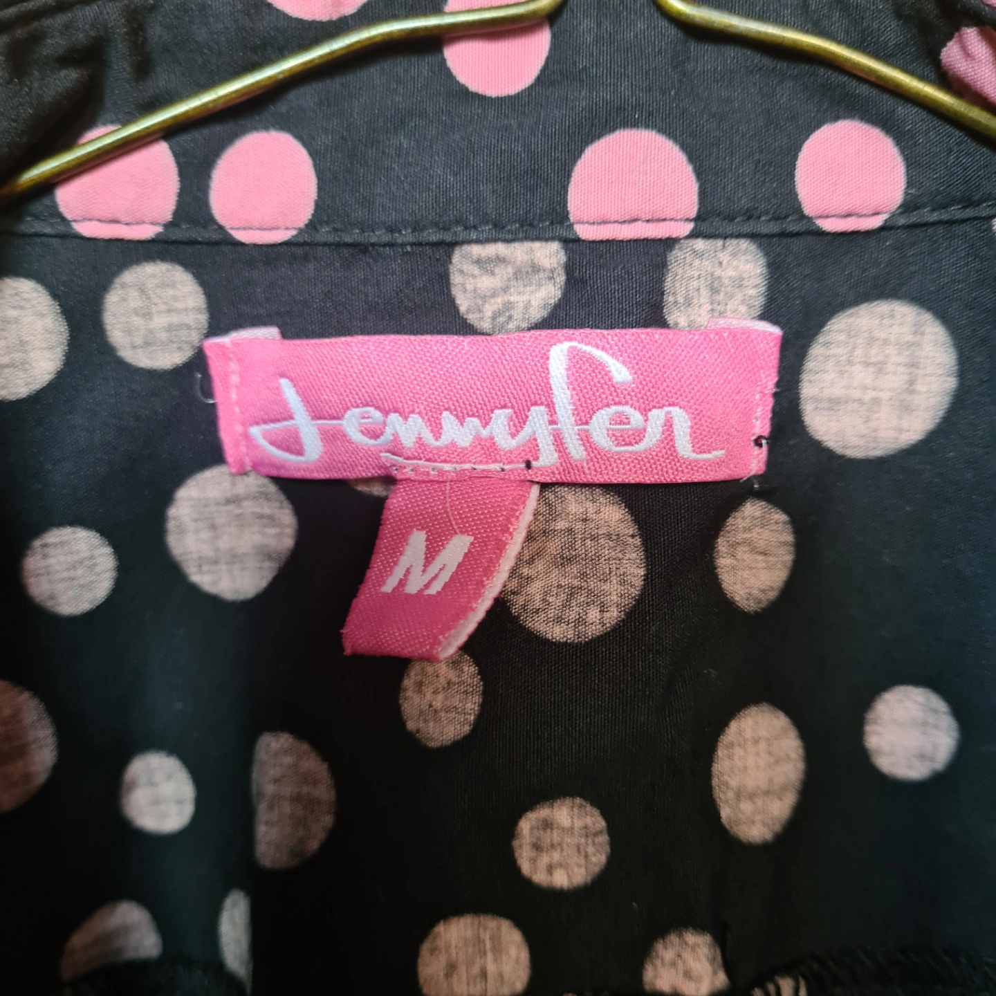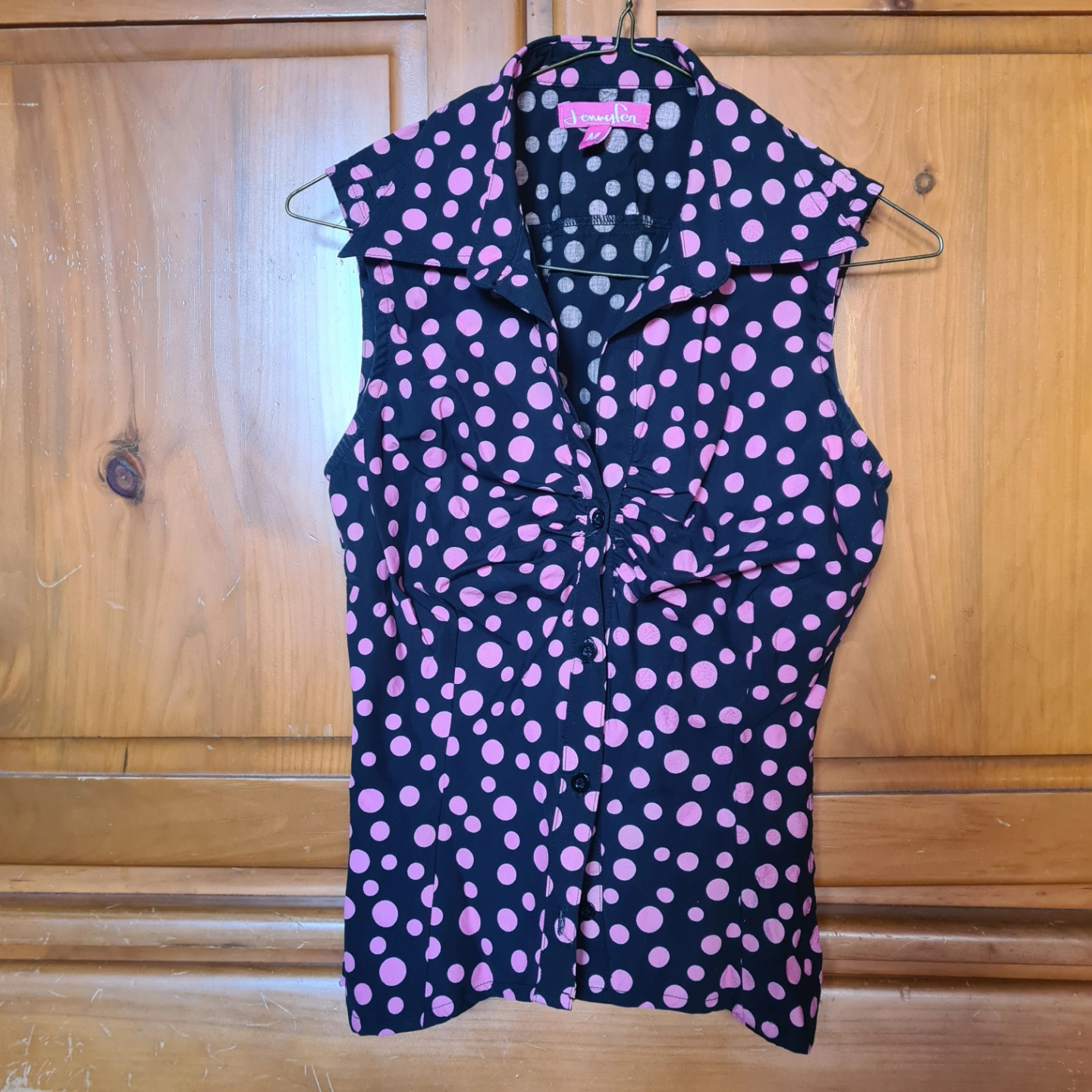 Black and pink polka dot sleeveless collared blouse. Button-up front.Cut out on both side of the waist. Size medium.