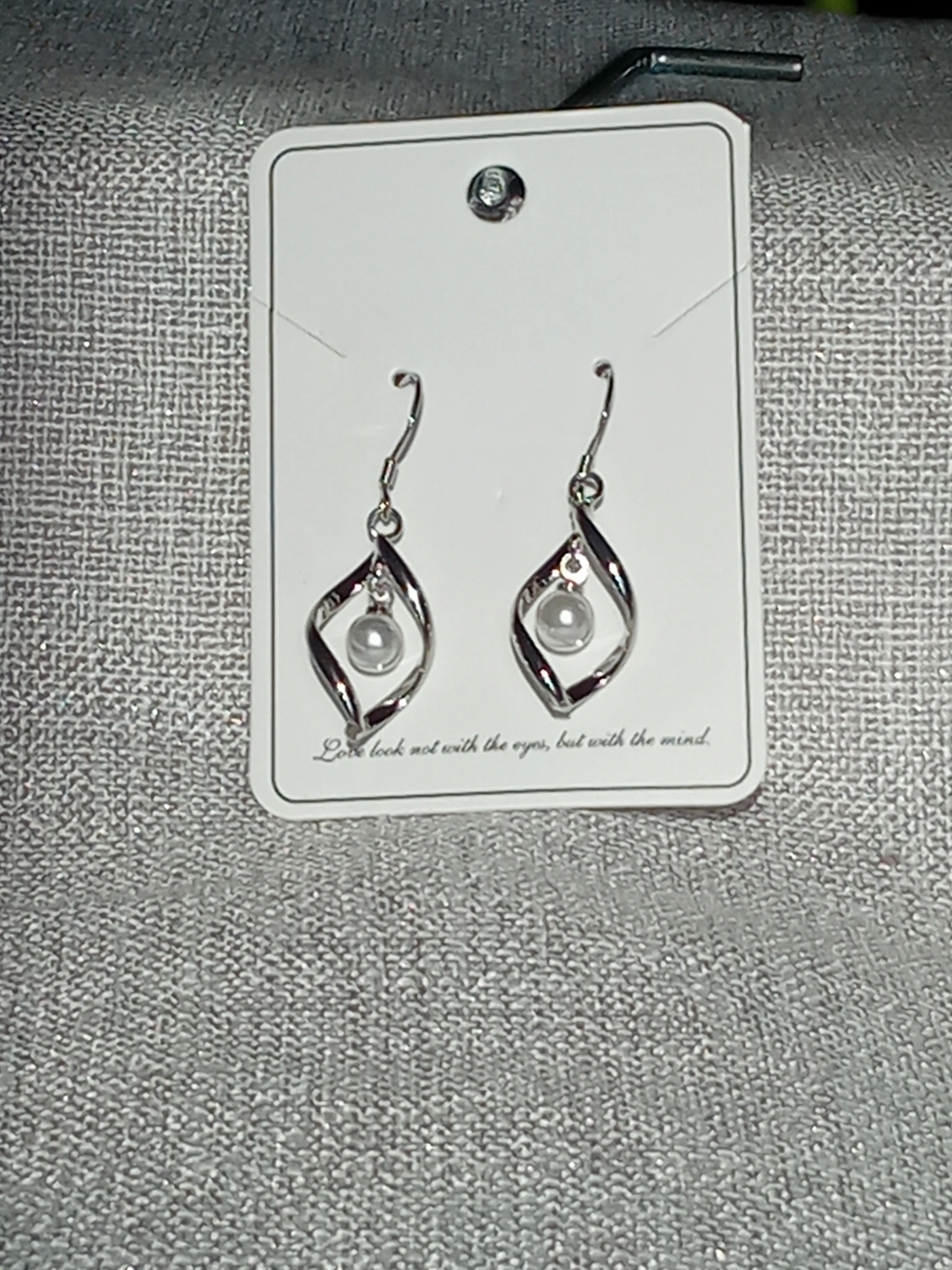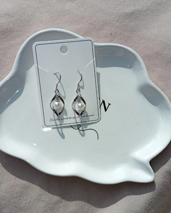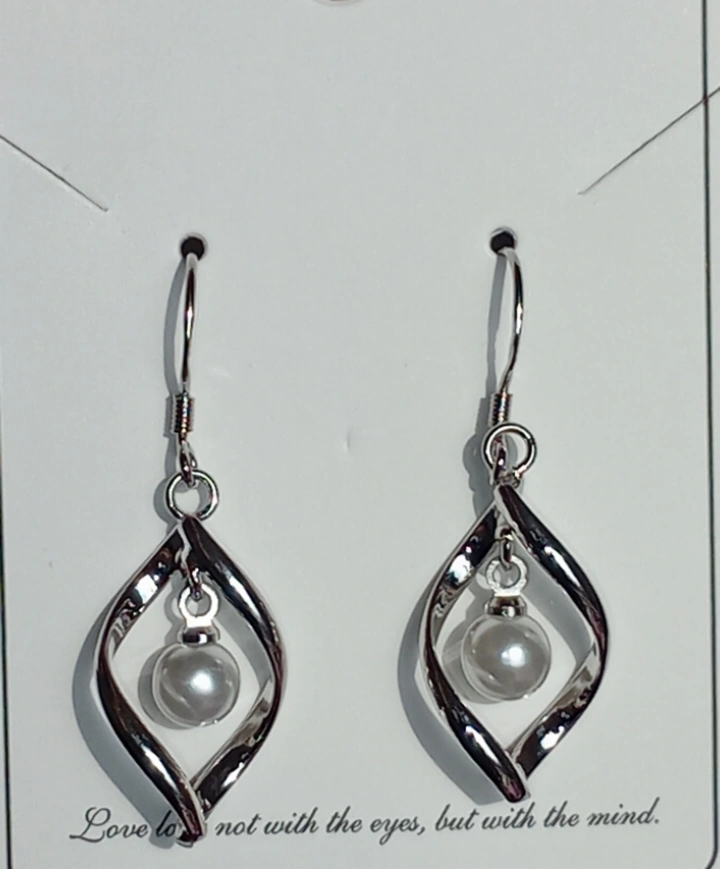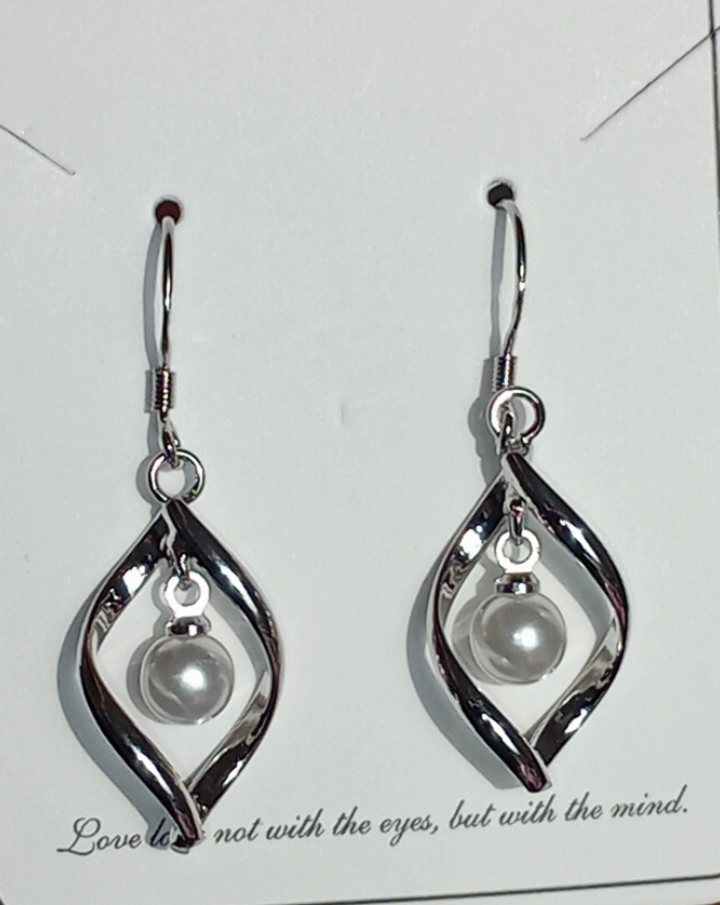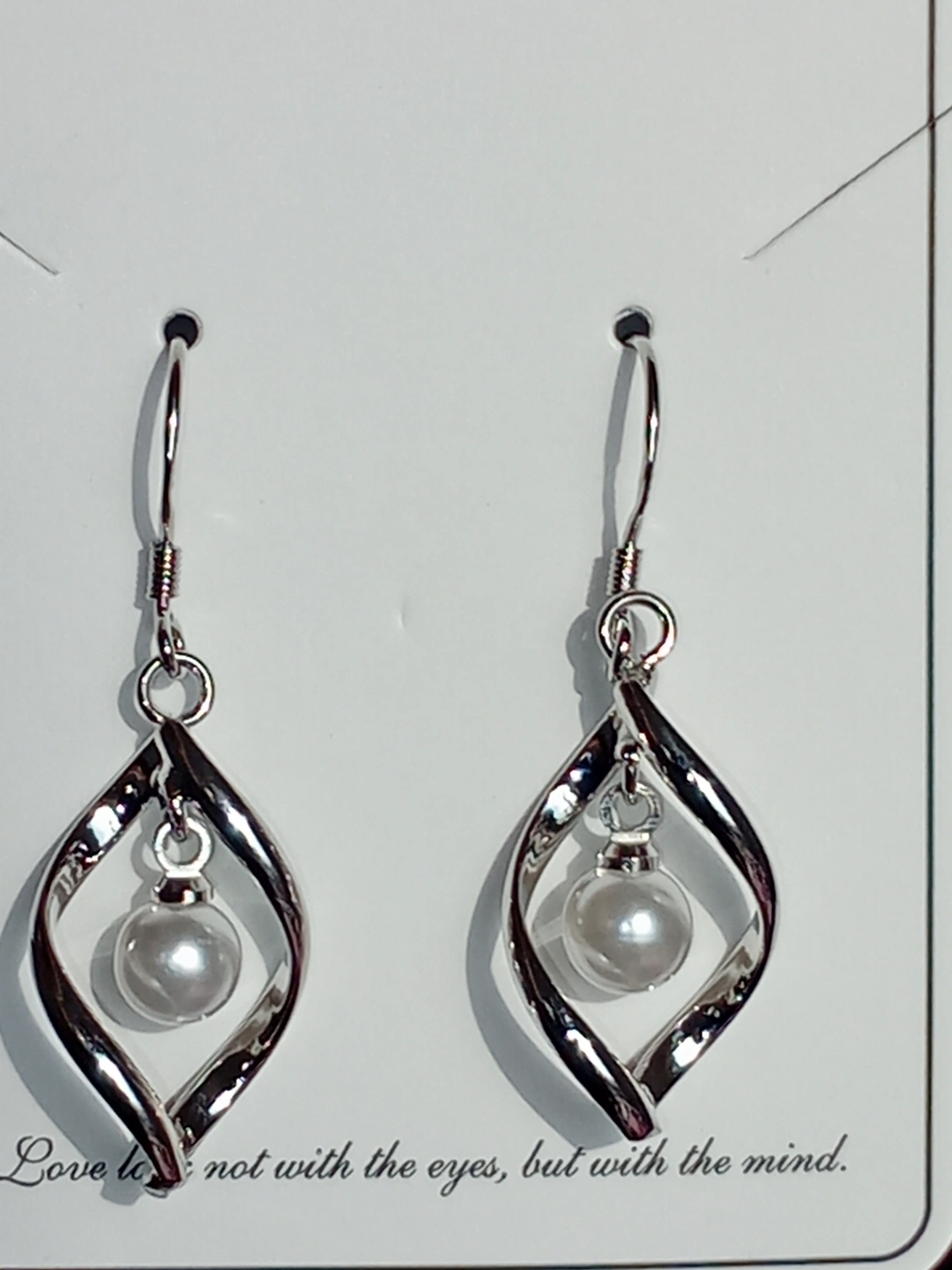 Elegant silver dangle earrings. A single pearl hanging from a twisted metal design. Lightweight and stylish.