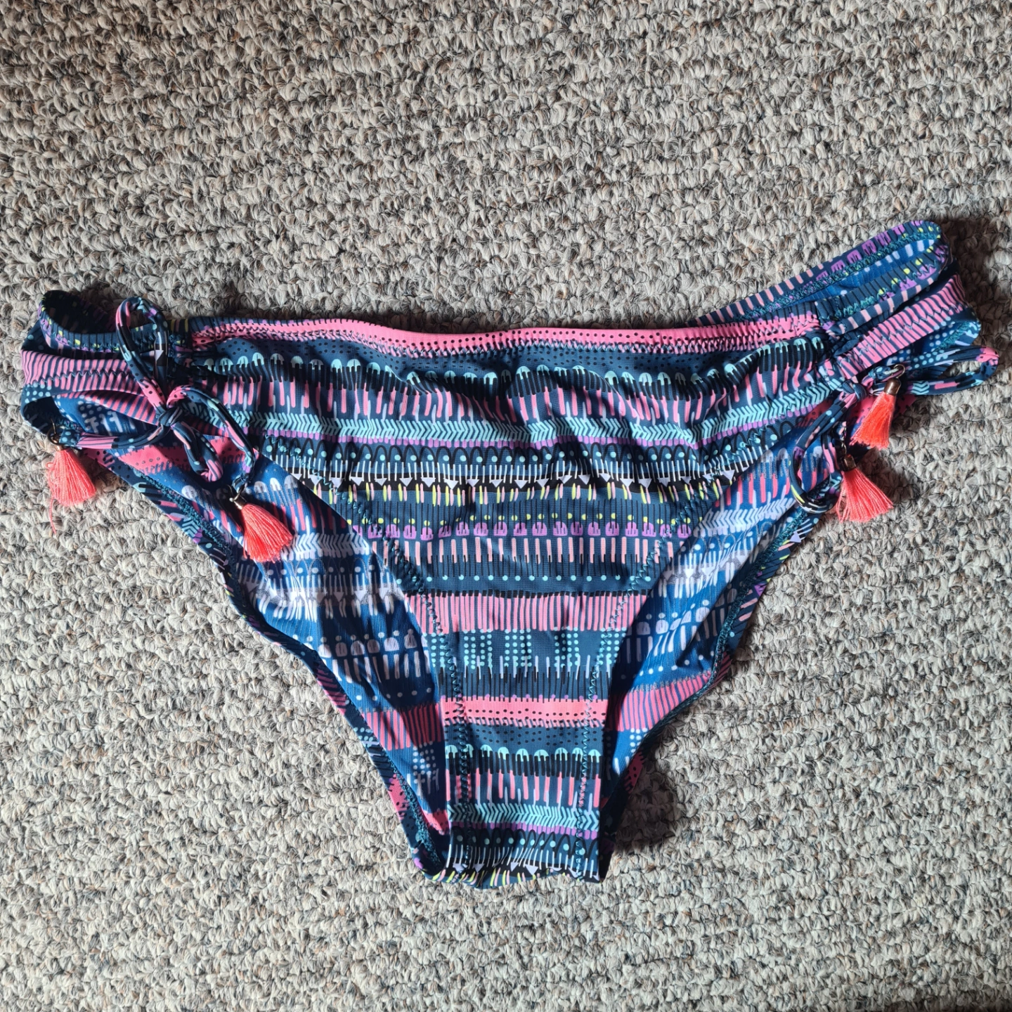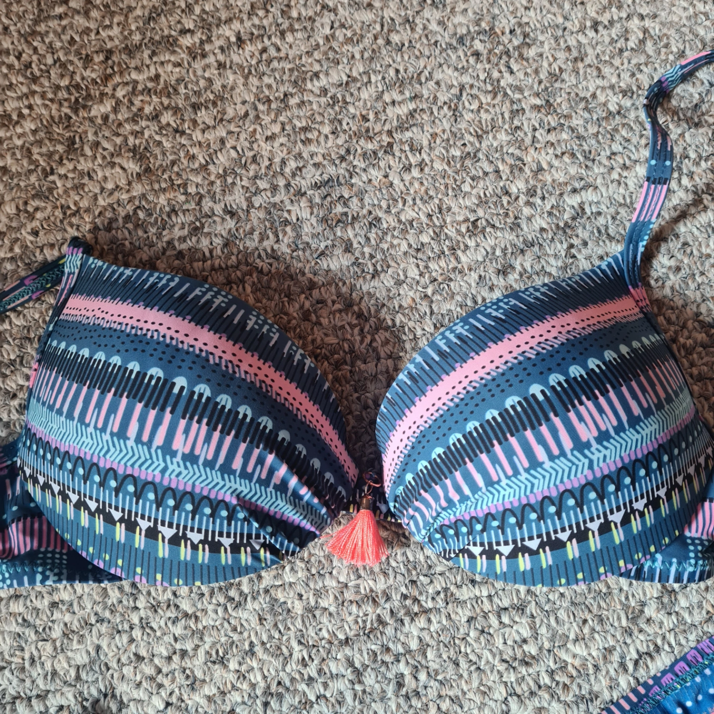 Women's bikini set. Features a vibrant aztec-inspired print. Includes a push-up bra top and high-cut bottoms. Adjustable straps and side ties. Coral-coloured tassels.