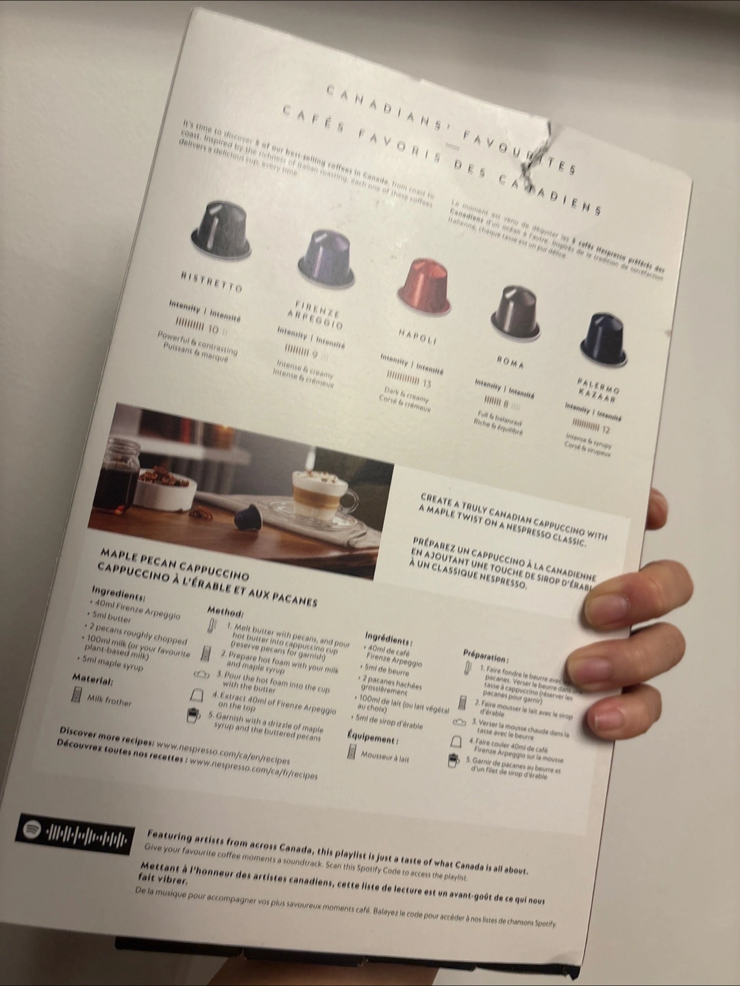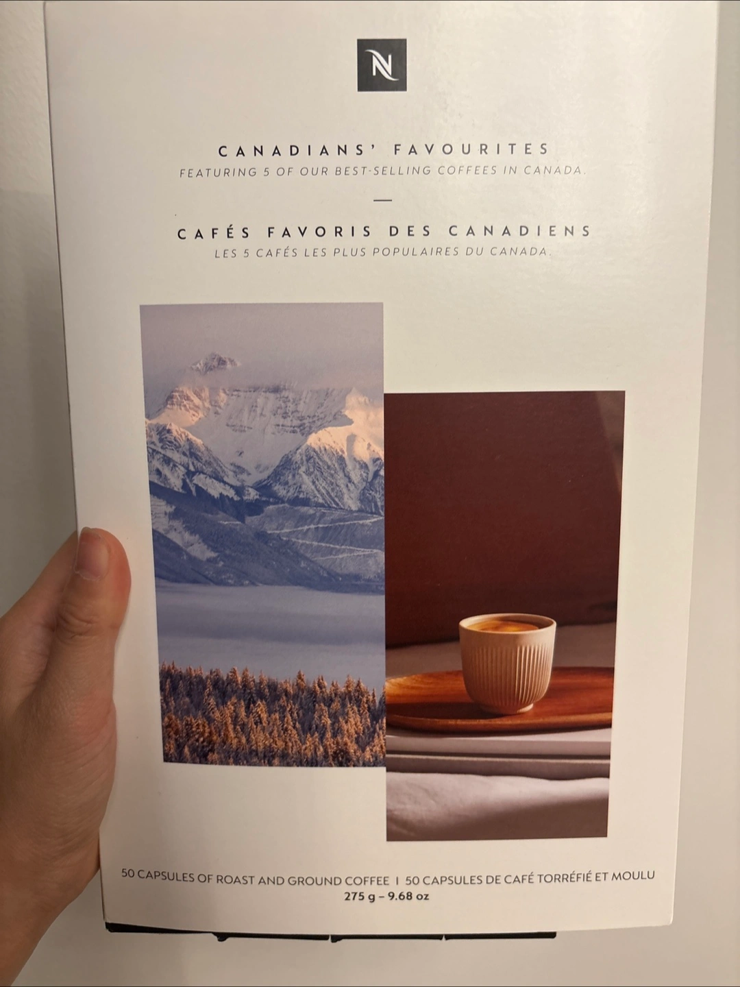50 count box of Nespresso coffee capsules. Features five of their best-selling coffees in Canada. Roast and ground coffee. Includes recipes.