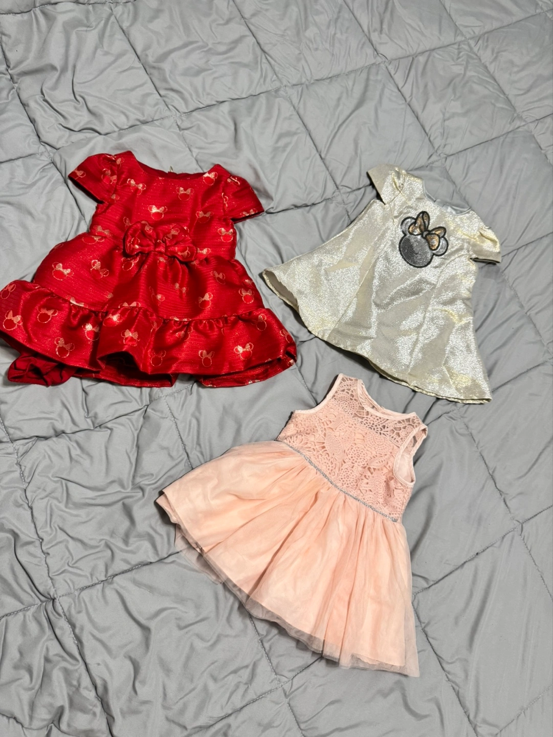 76One red dress features a Minnie Mouse print. One gold dress features a Minnie Mouse applique. One pink tulle dress features lace detailing. Perfect for special occasions or first birthday photoshoot. Used once for birthday photoshoot , excellent condition.