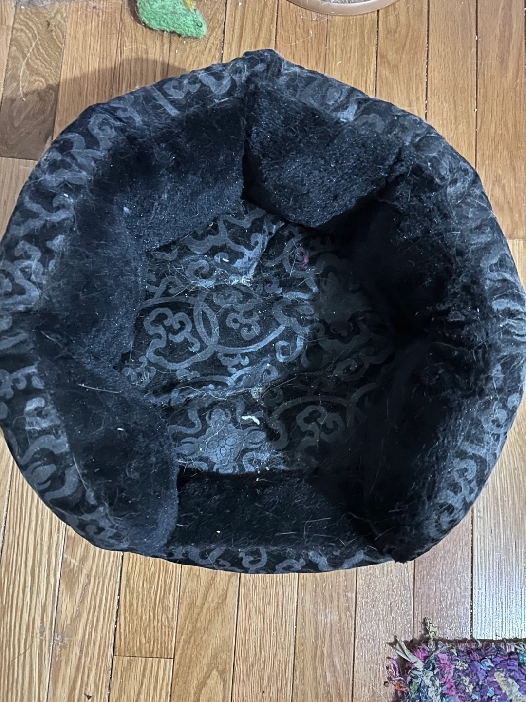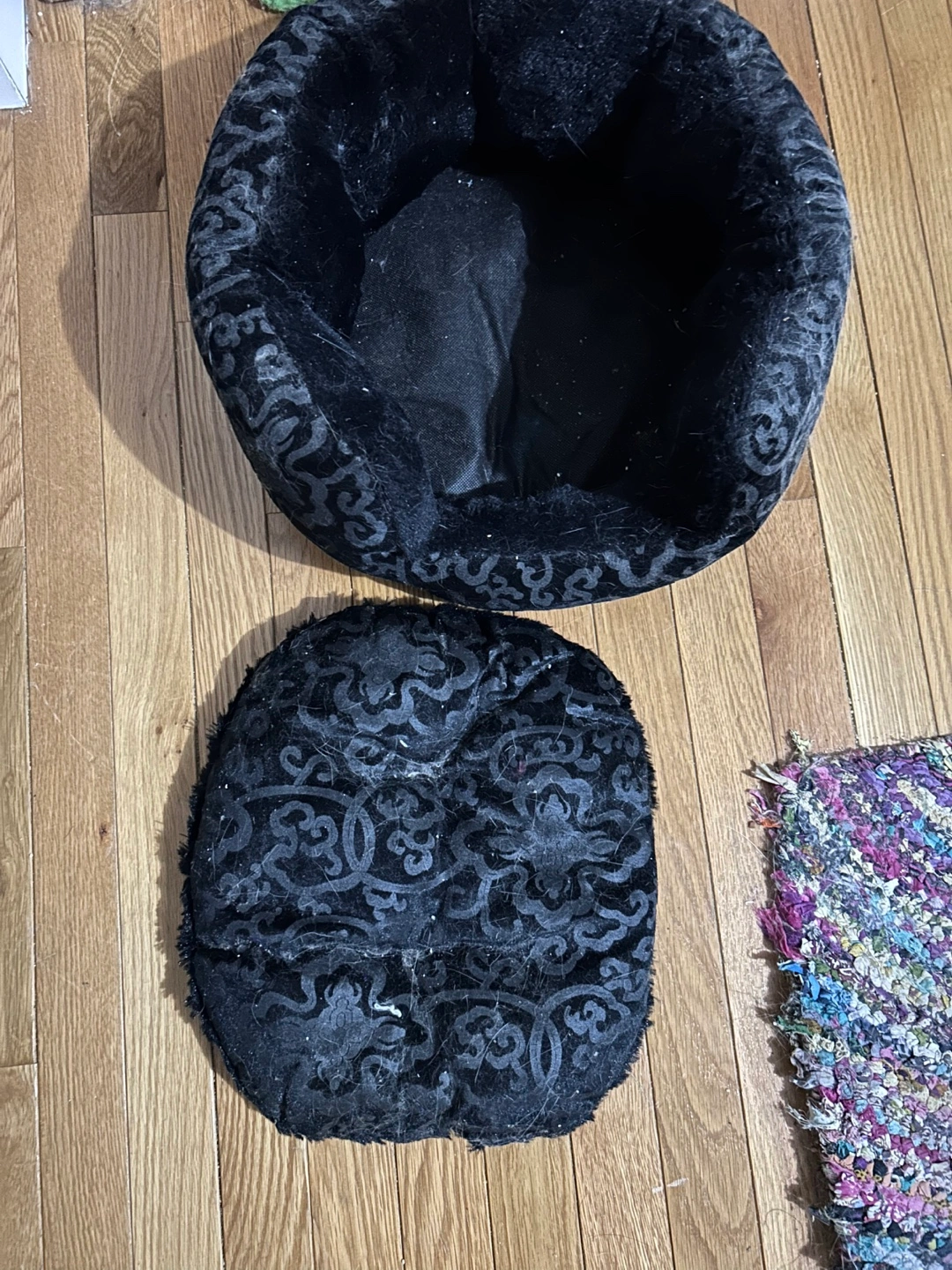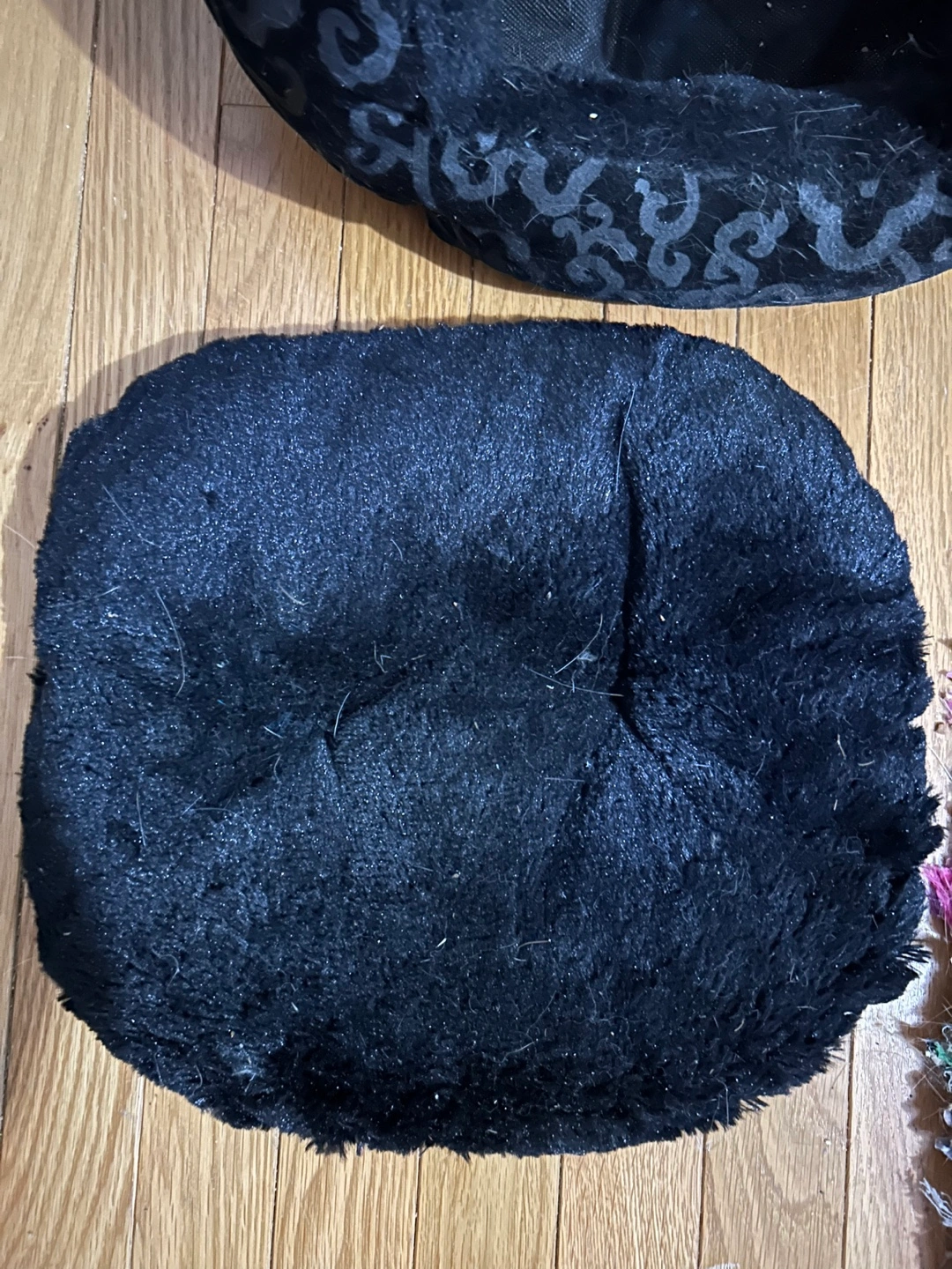 Round pet bed with a removable cushion. For small cats or dogs. About 12” in diameter