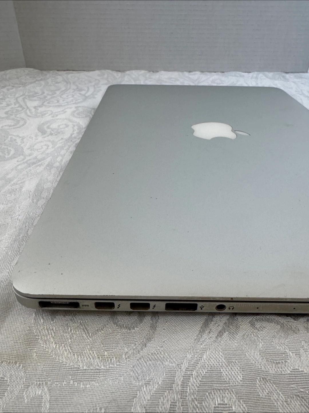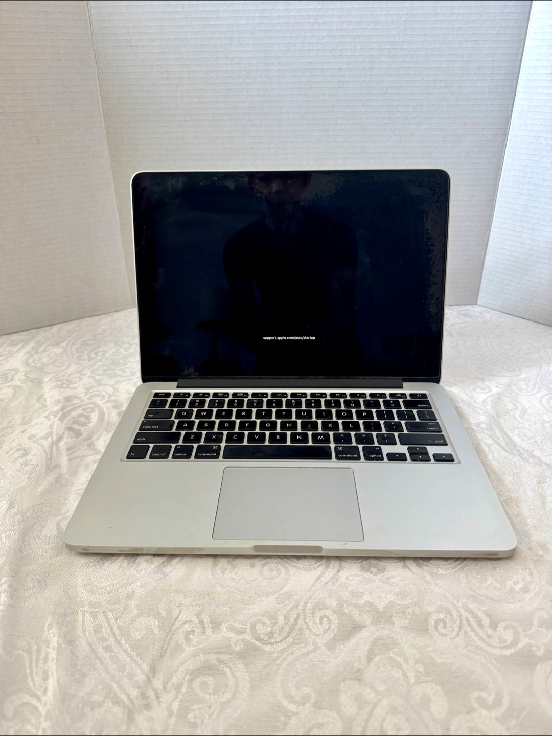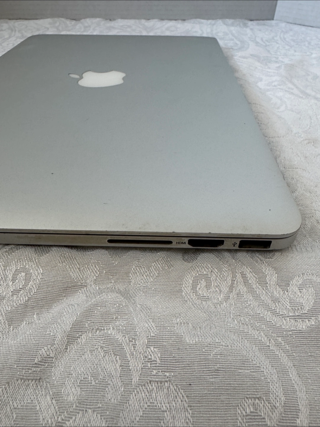 2015 model MacBook Pro. Silver aluminum body. Shows some wear. Includes ports: USB, HDMI. Screen displays startup message.