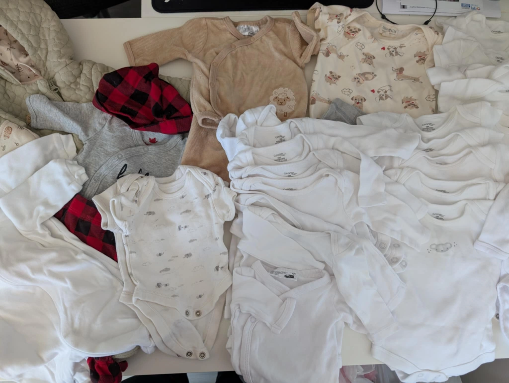 Large bundle of newborn and 0-3 month baby clothes. Includes bodysuits, sleepers, and a snowsuit.