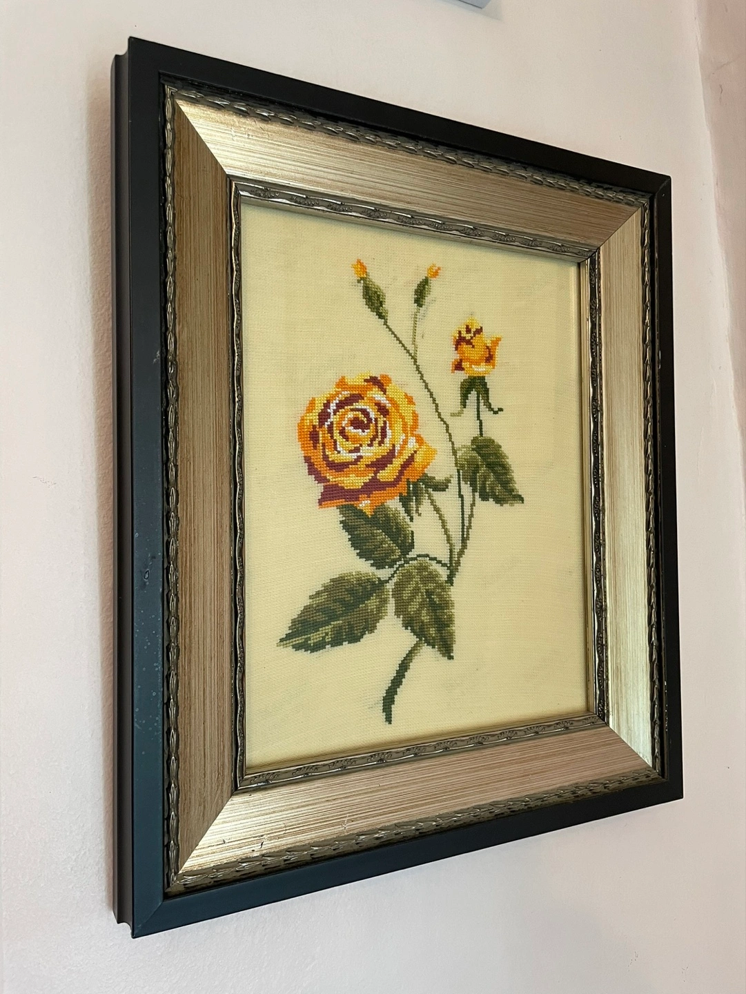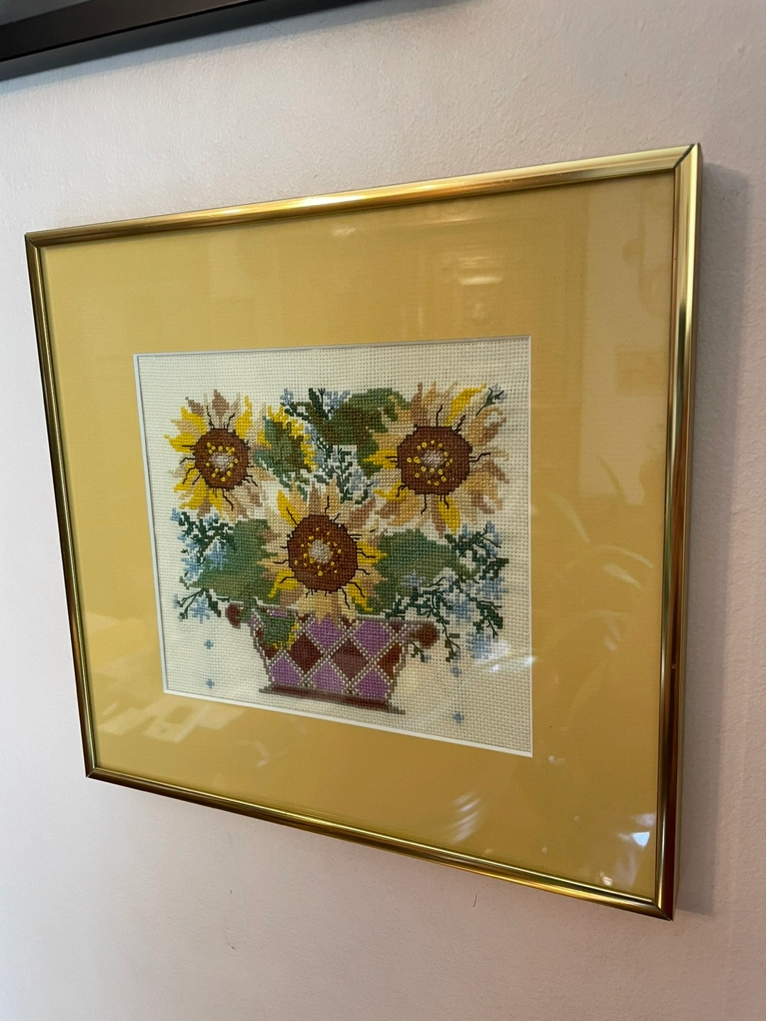 Two framed needlepoint embroidery pictures. One features sunflowers in a vase, the other a single yellow rose. Gold and black frames. Great for adding a touch of vintage charm to your home décor. 8$ each