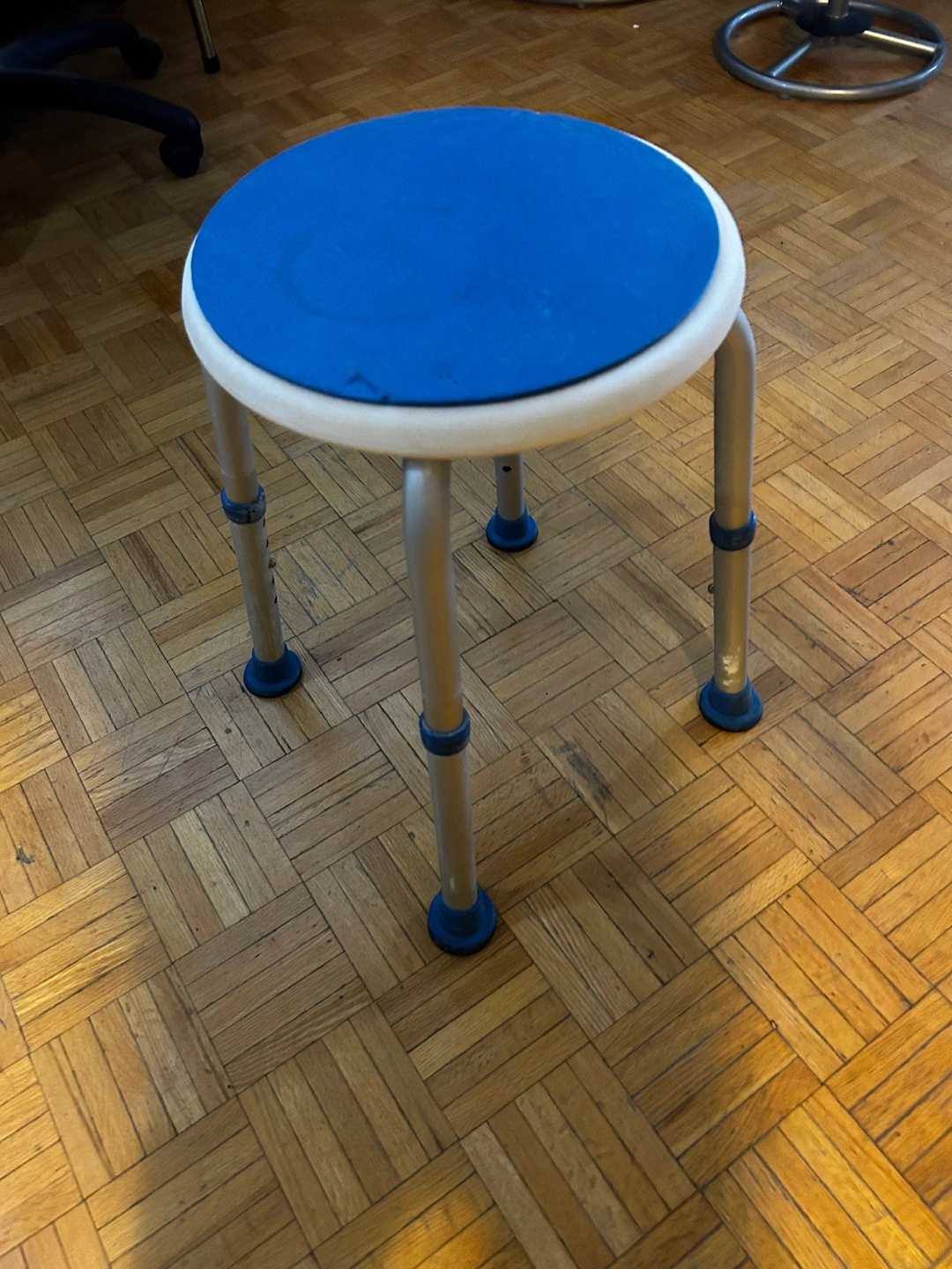 Bathroom shower stool. Adjustable height. Features a blue cushioned top and aluminum legs. Good for showering or bathing.