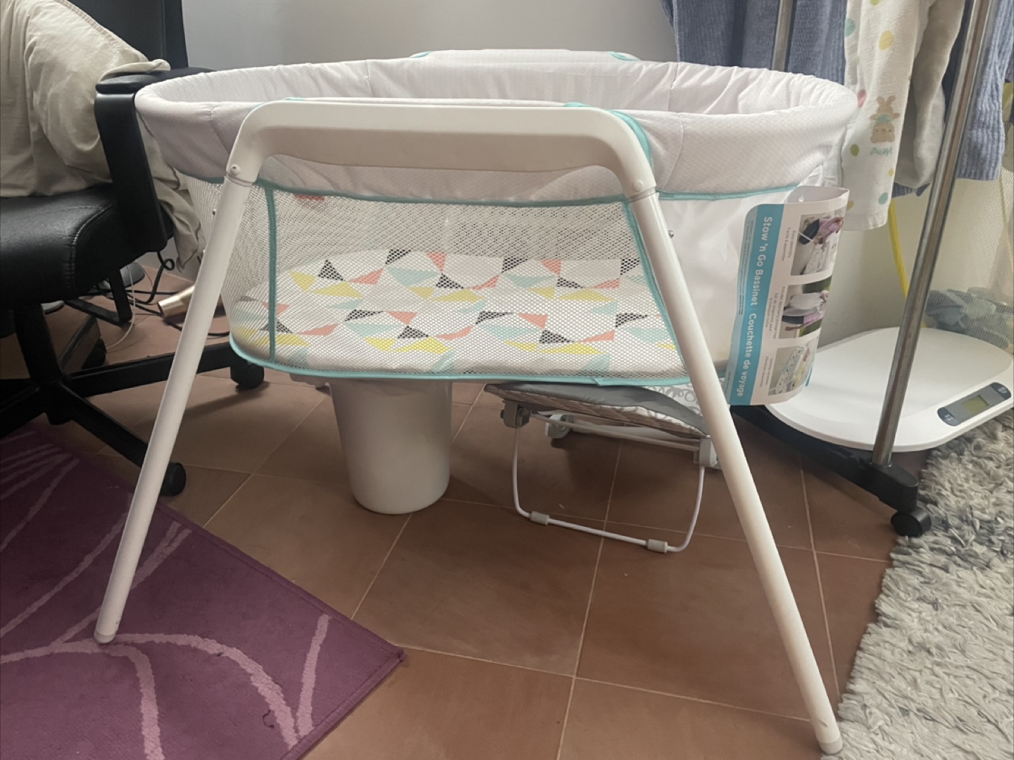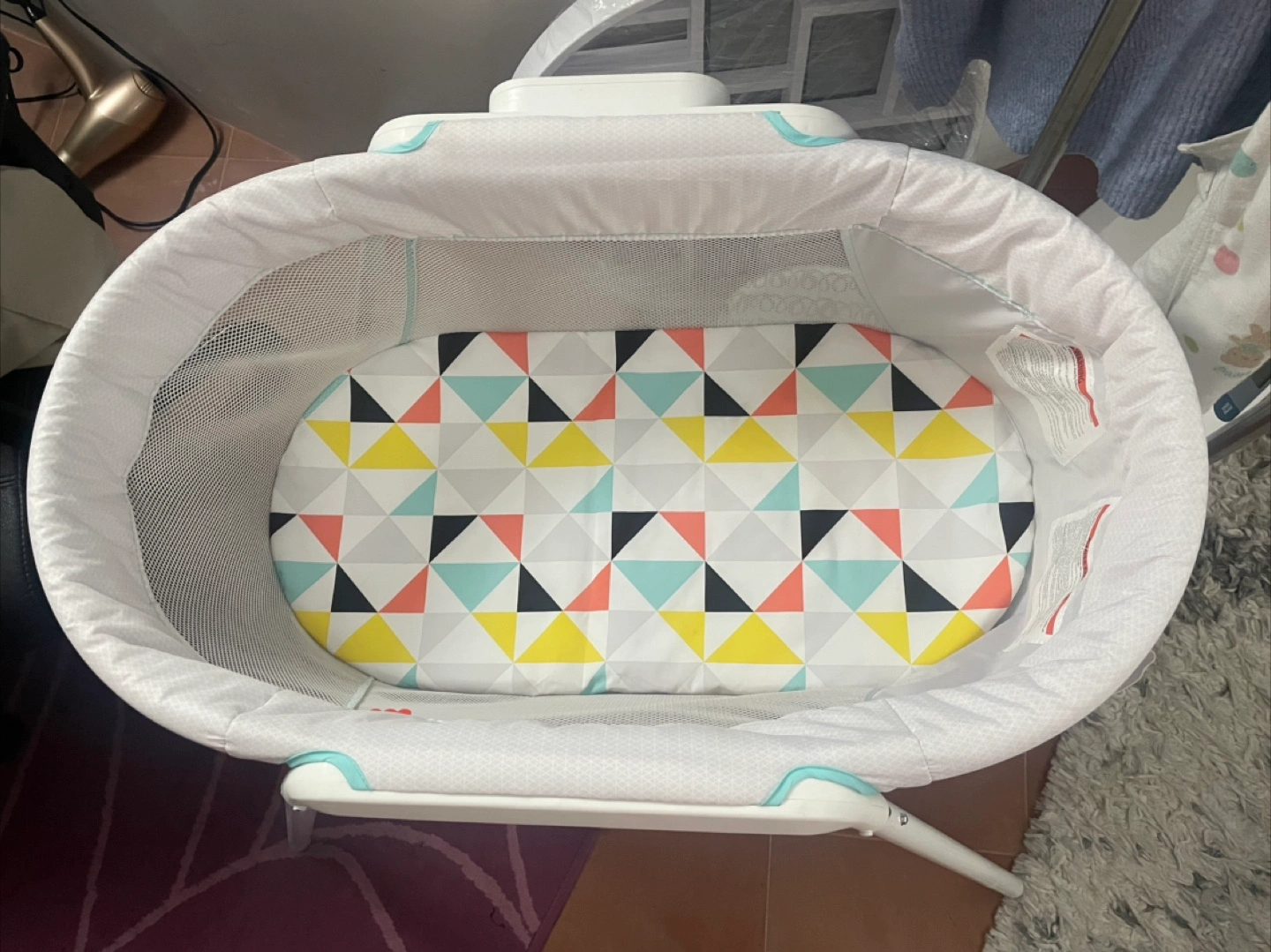 Portable bassinet, easy to assemble and clean. Geometric print. Great for travel or small spaces. Includes mattress.