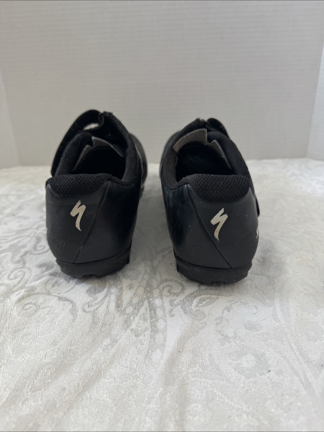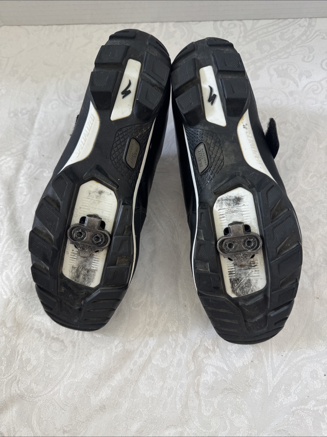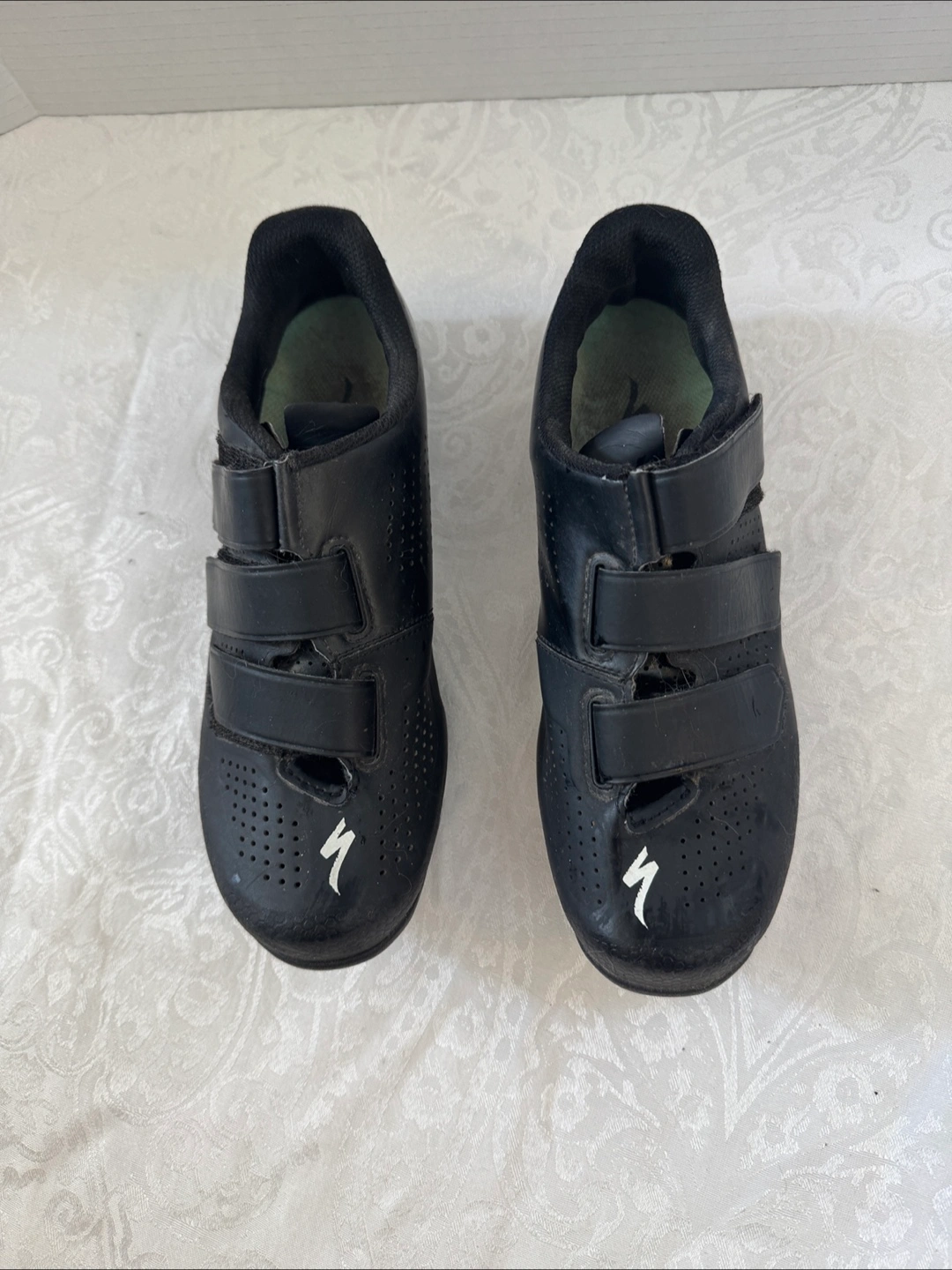 Specialized clip in bike shoes. Ladies size 42 or 8.5. Black with three velcro straps. Good condition, some wear on soles. Cleats included.