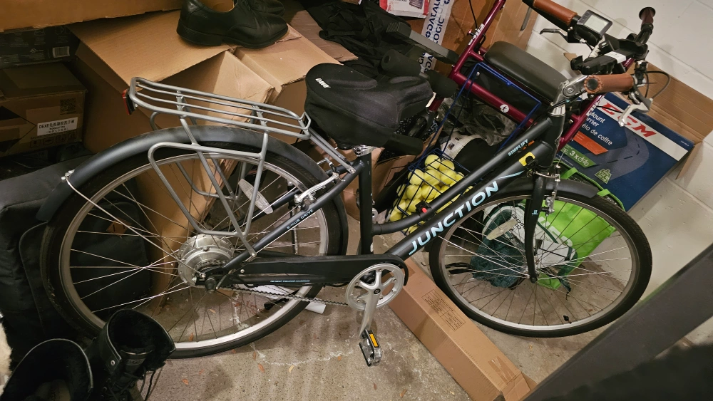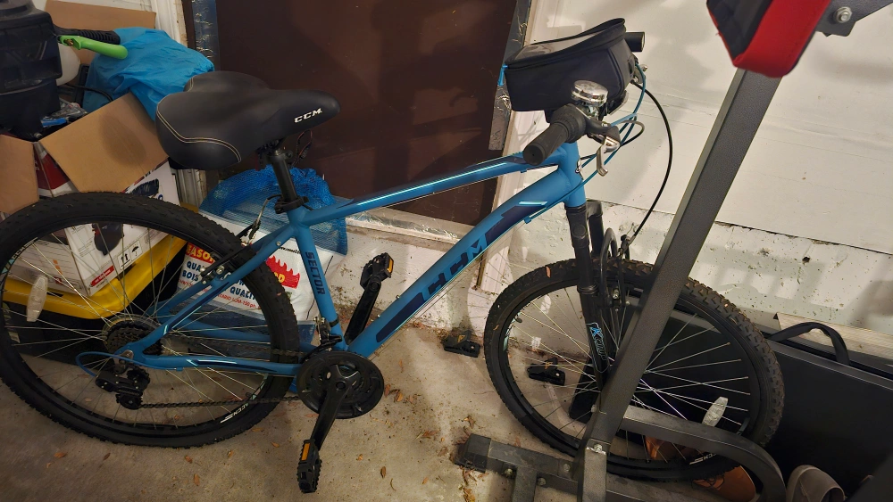 Two bicycles and two helmets for sale. One CCM blue bike. One black hybrid bike. One blue and one red helmet. Used condition. Also with one charger. The blue bike is $200. The black bike costs $600. Didn't even ride it 10 times.