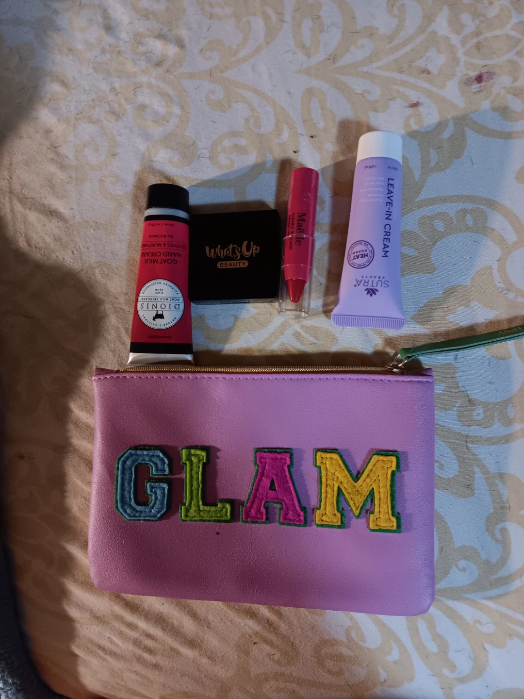 Adorable purple cosmetic bag with assorted beauty products. Includes hand cream, lip balm, eyeshadow, and leave-in cream. Perfect for travel!