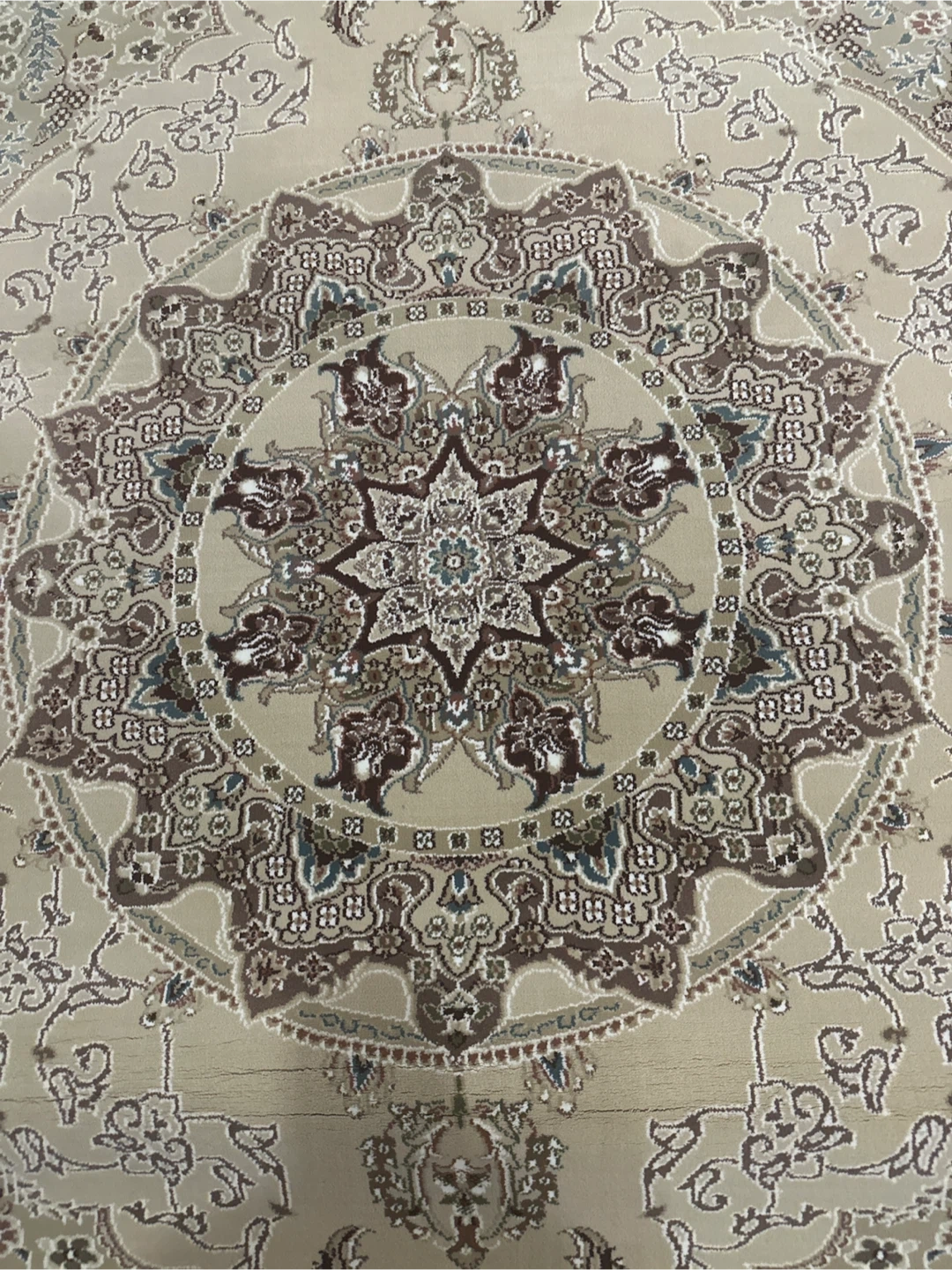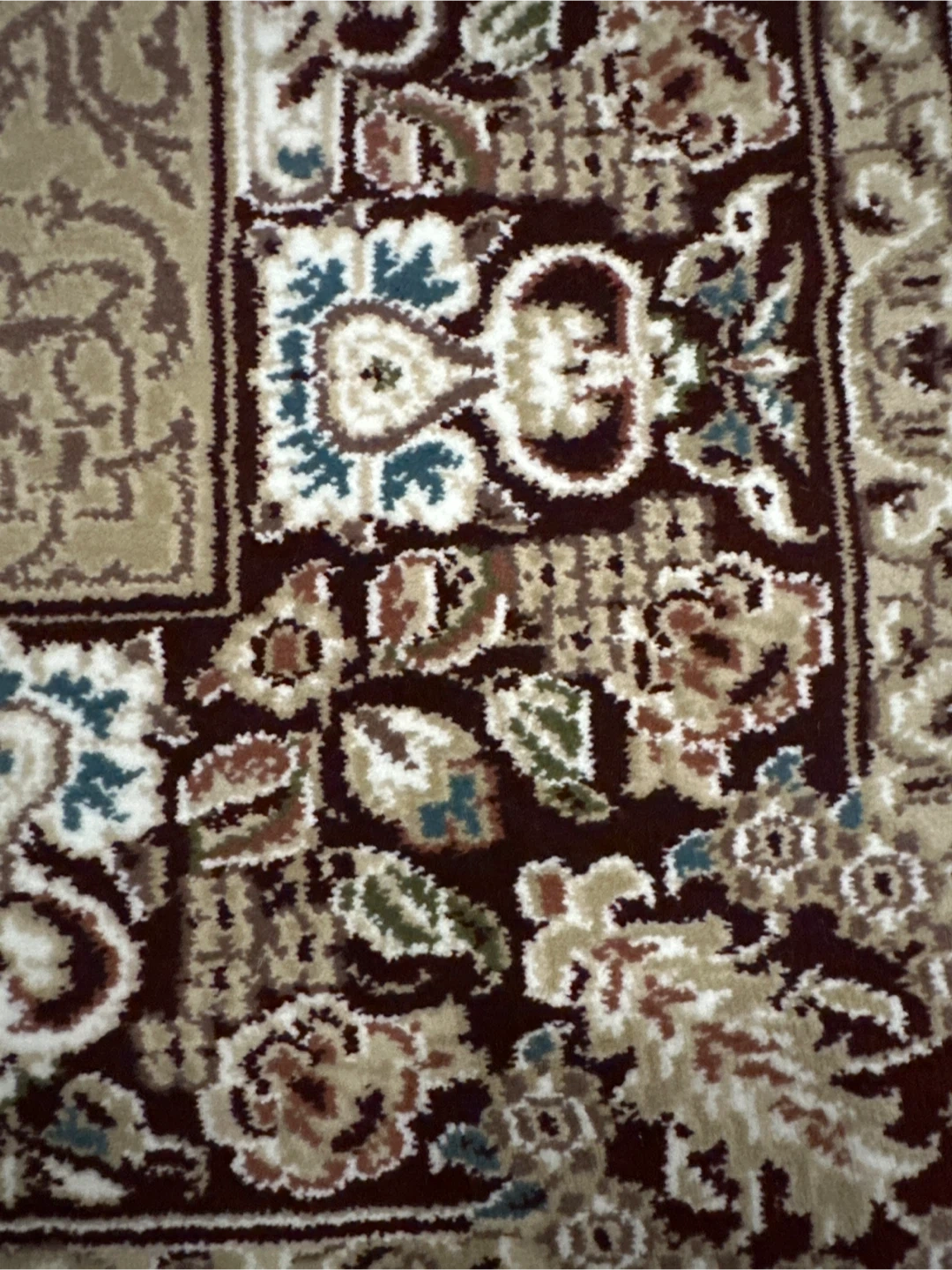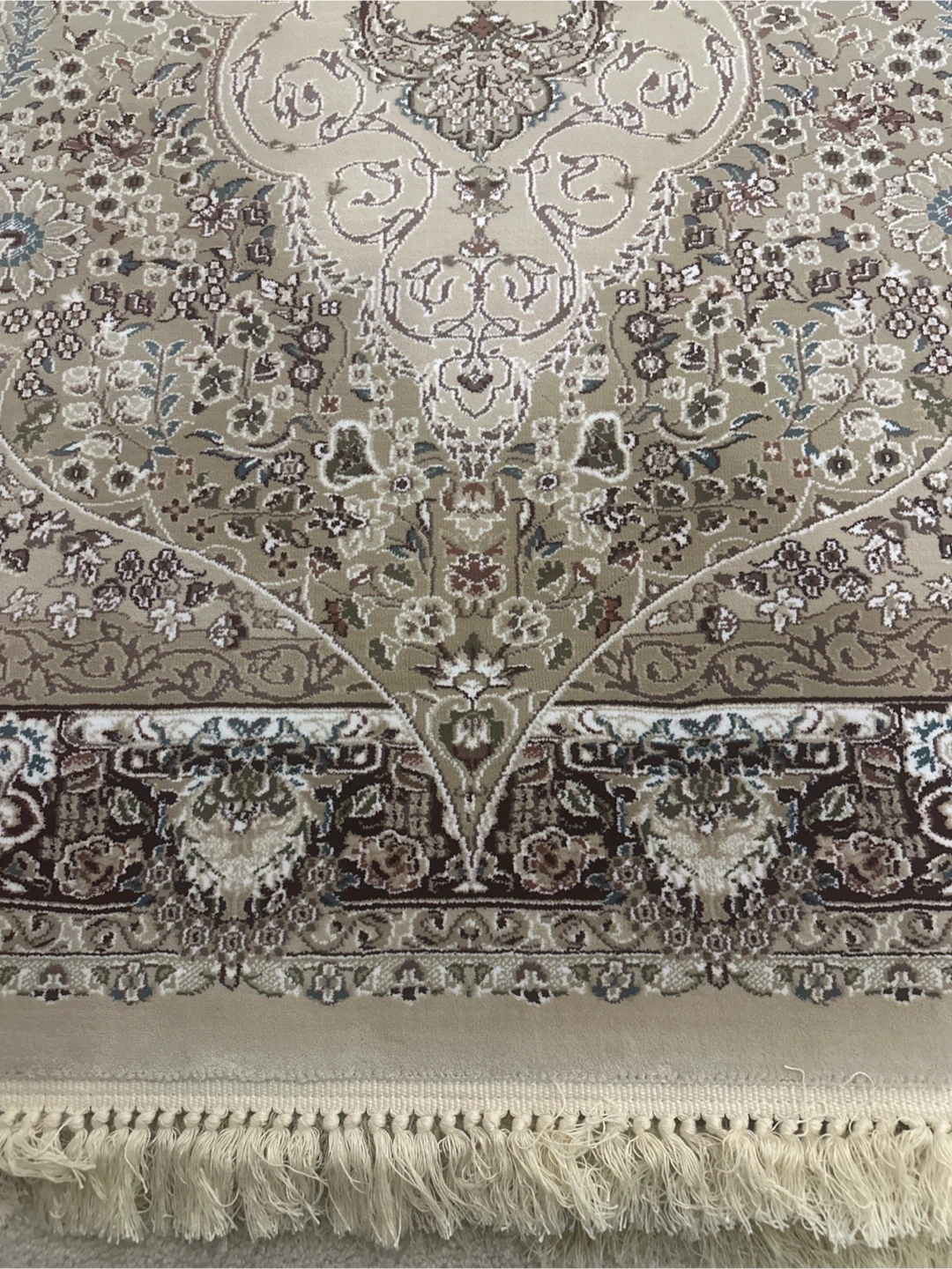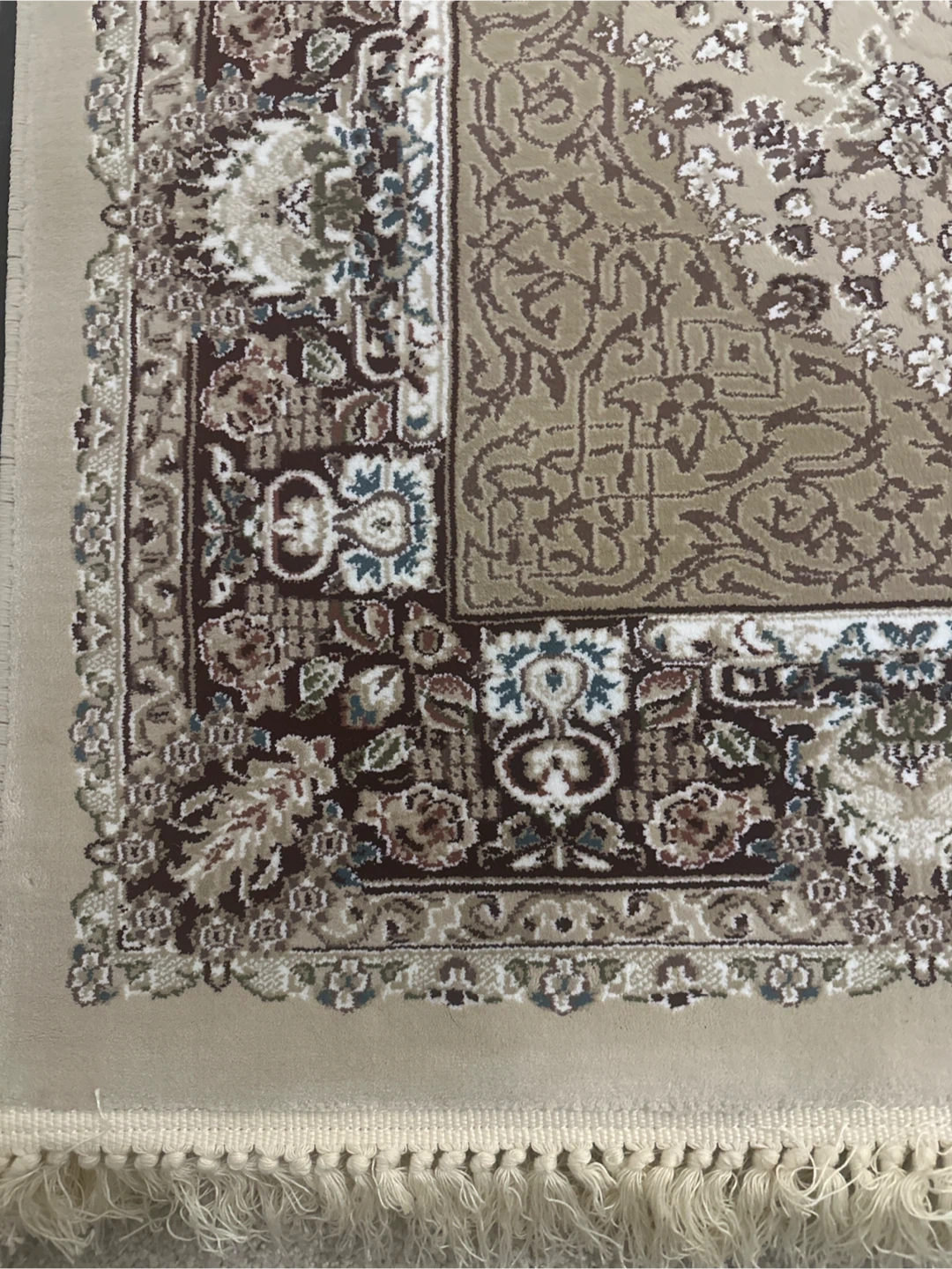 Beautifully patterned area rug with intricate floral designs and a traditional border. It features a classic colour palette of ivory-beige, brown, dark red, and cream. The fringed edges add a touch of elegance. Great for adding warmth and style to any room! Made in Turkey.