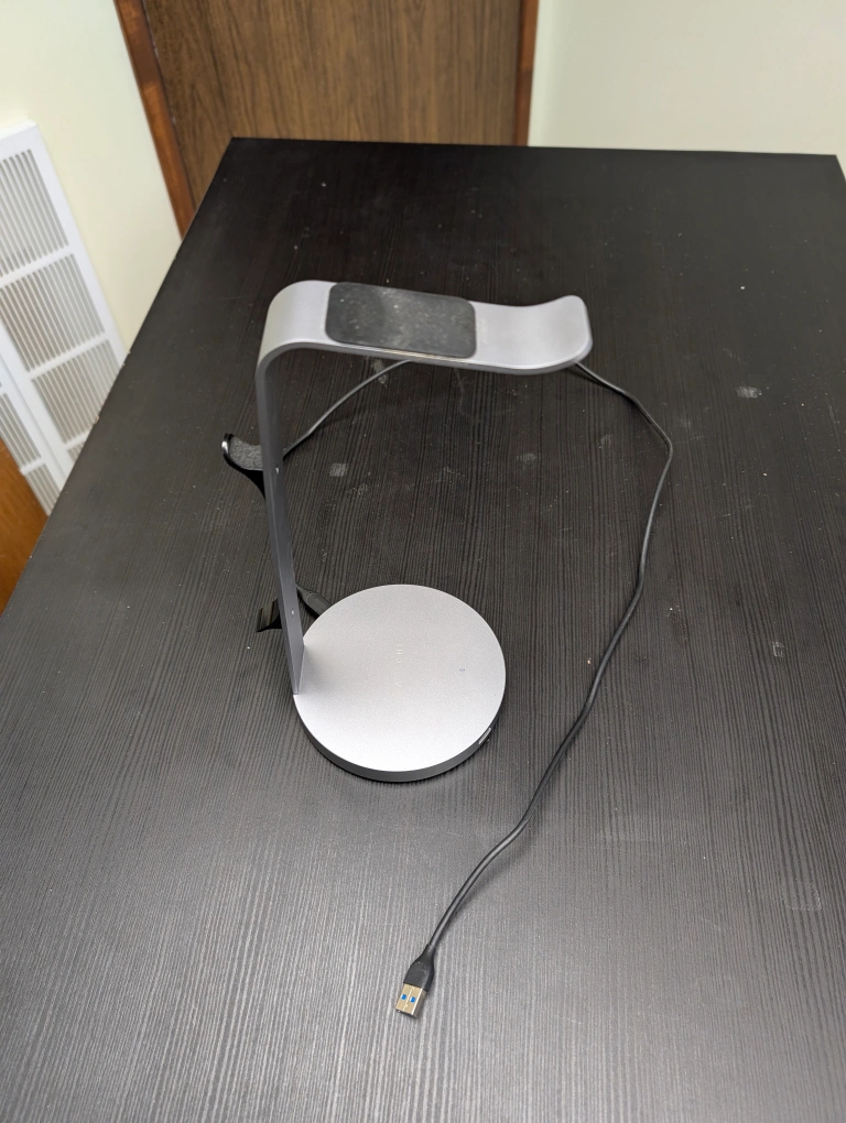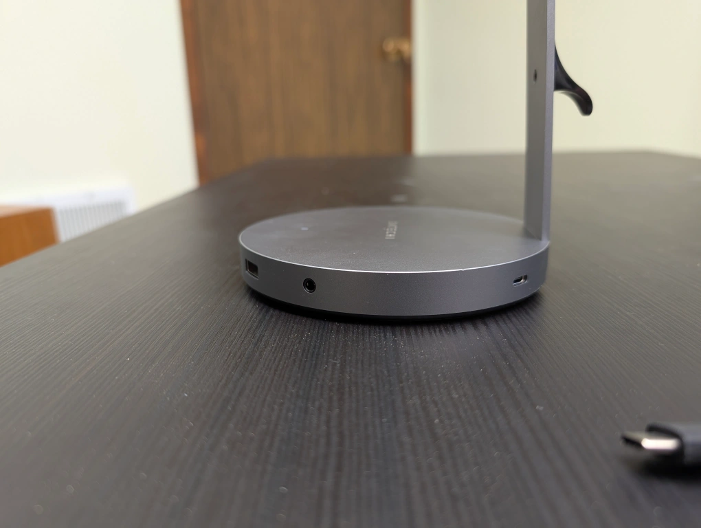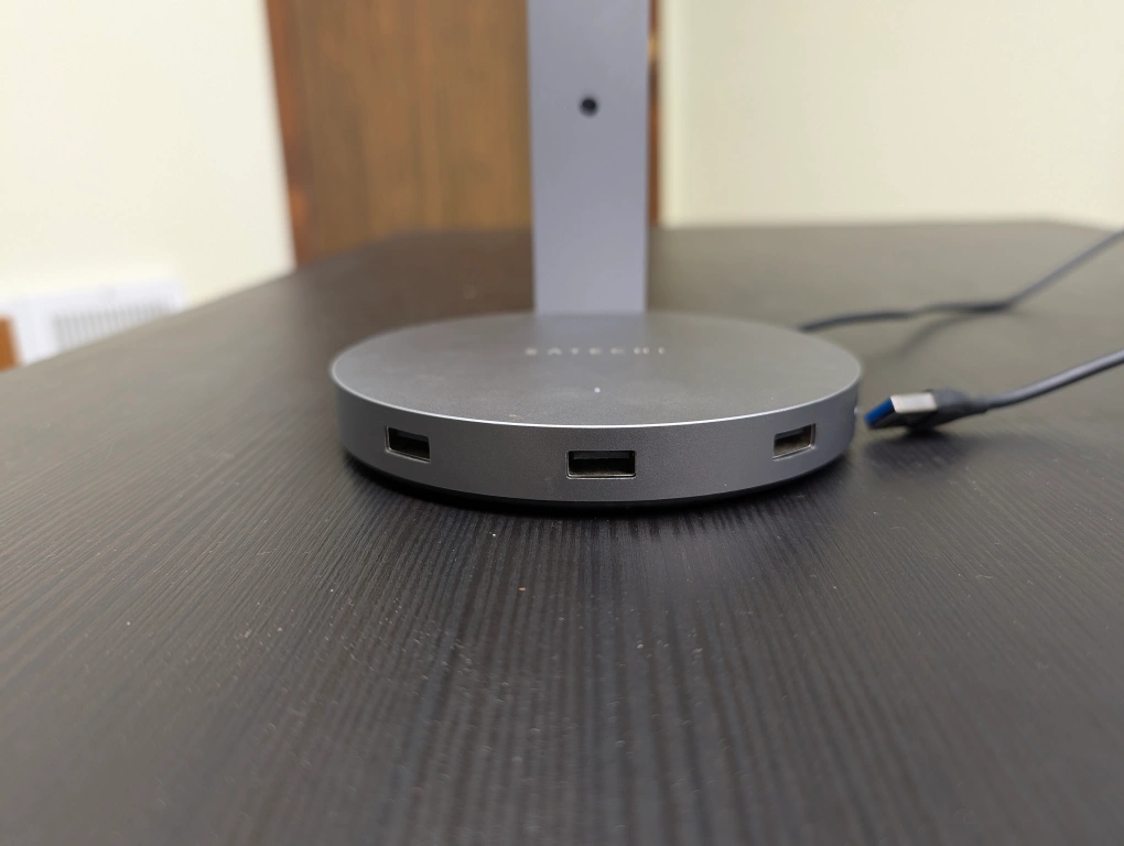 73Sleek aluminium design. Multiple USB ports and headphone hook. USB-C connection. Minimalist style.