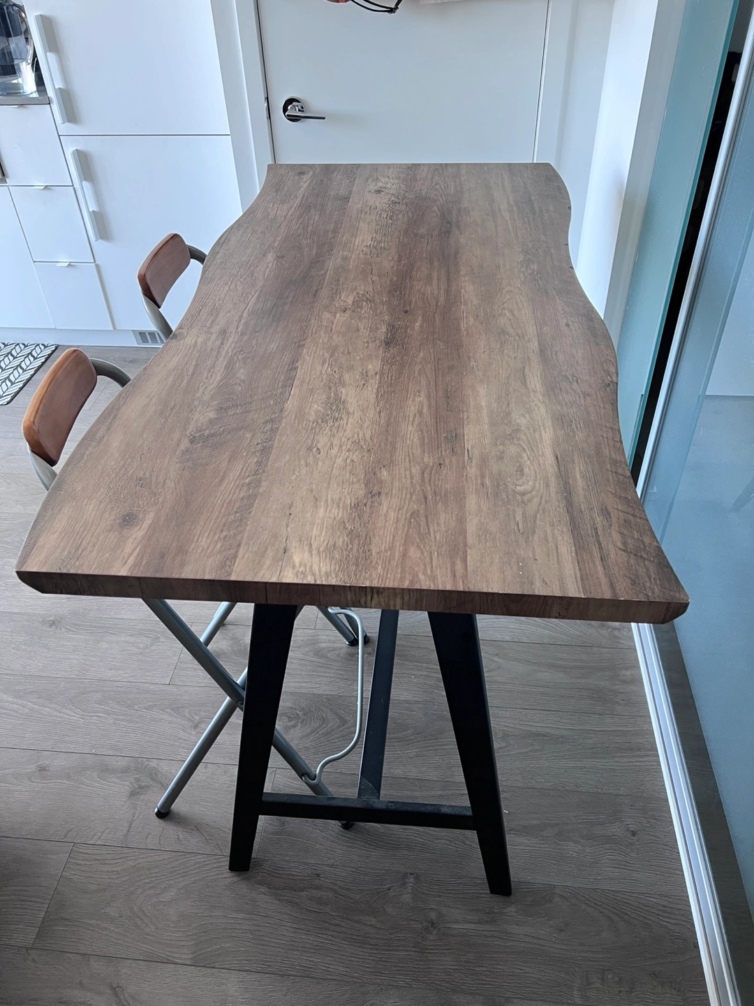Unique live edge wood top. Black metal frame. Perfect for a small kitchen or apartment. Minimalist design.