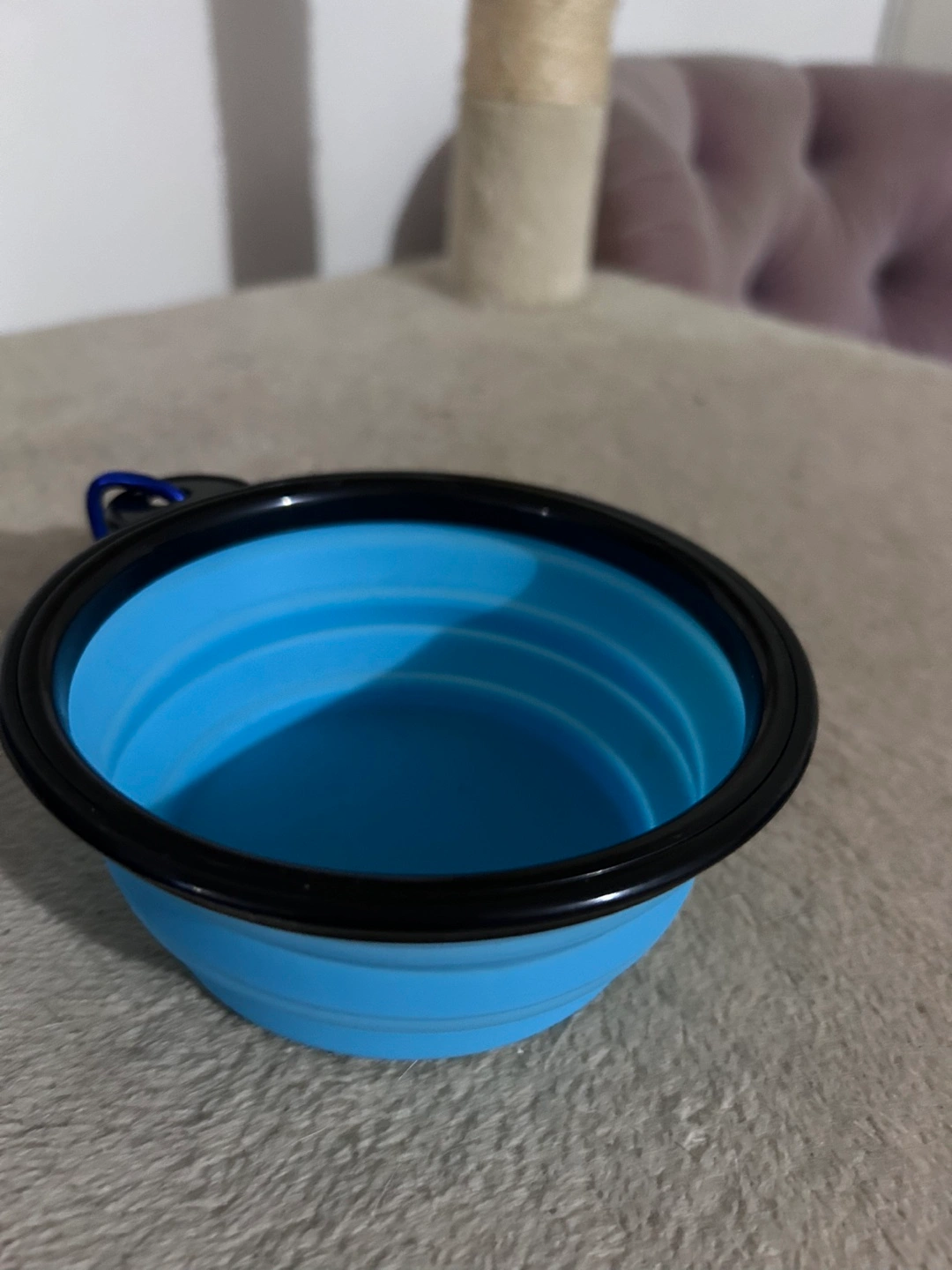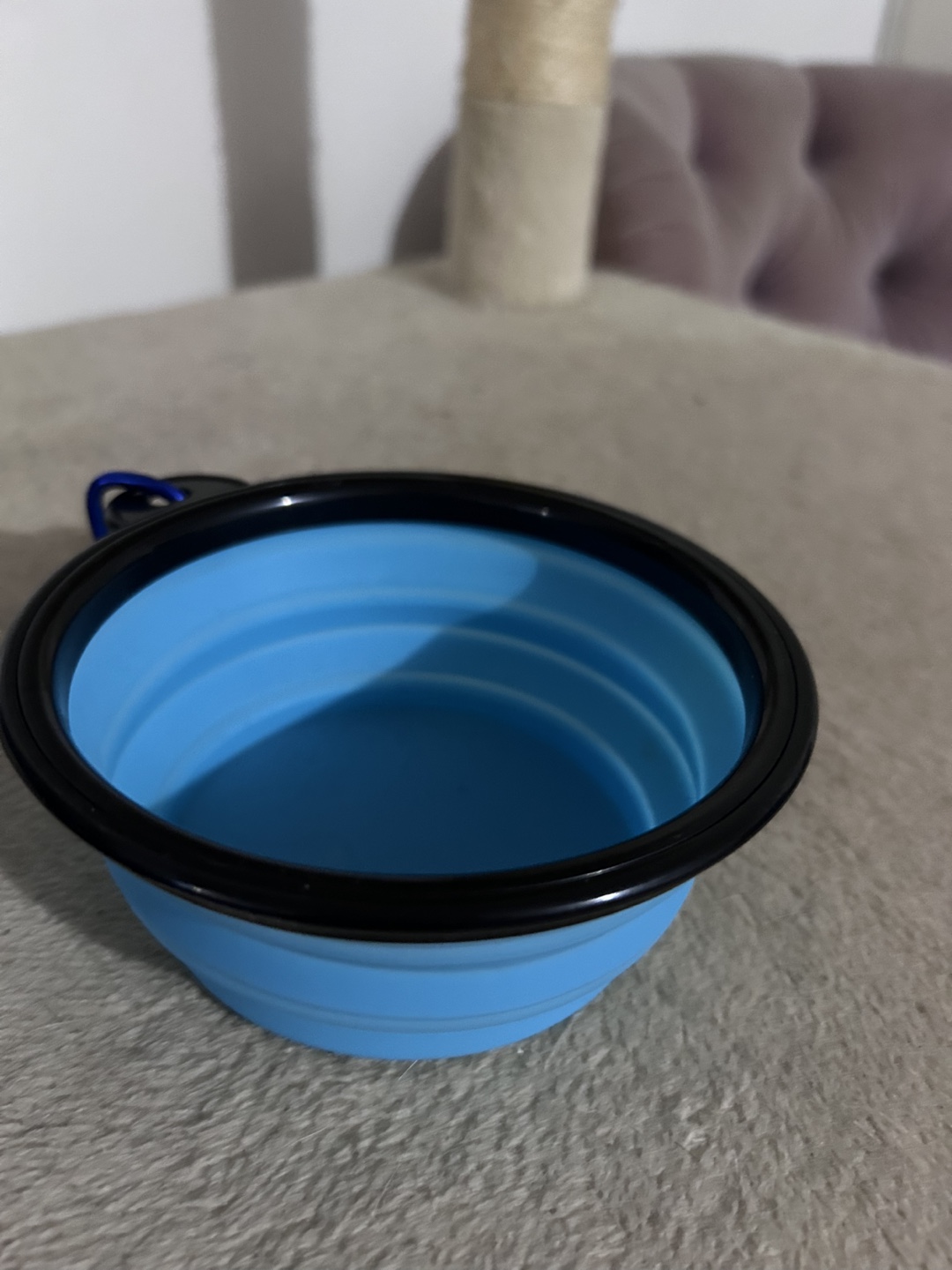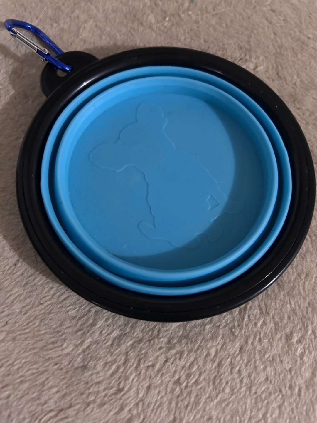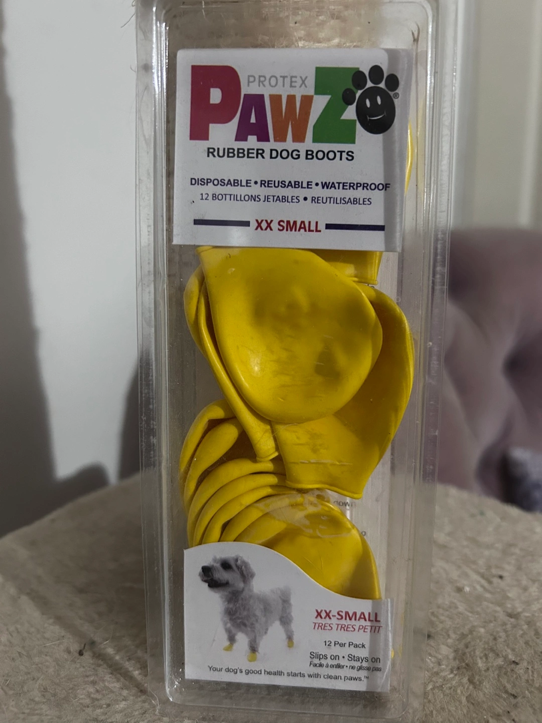 Portable silicone collapsible pet bowl Carabiner clip and 12 pack of yellow XXS ProteX Pawz rubber dog boots. Waterproof, reusable.