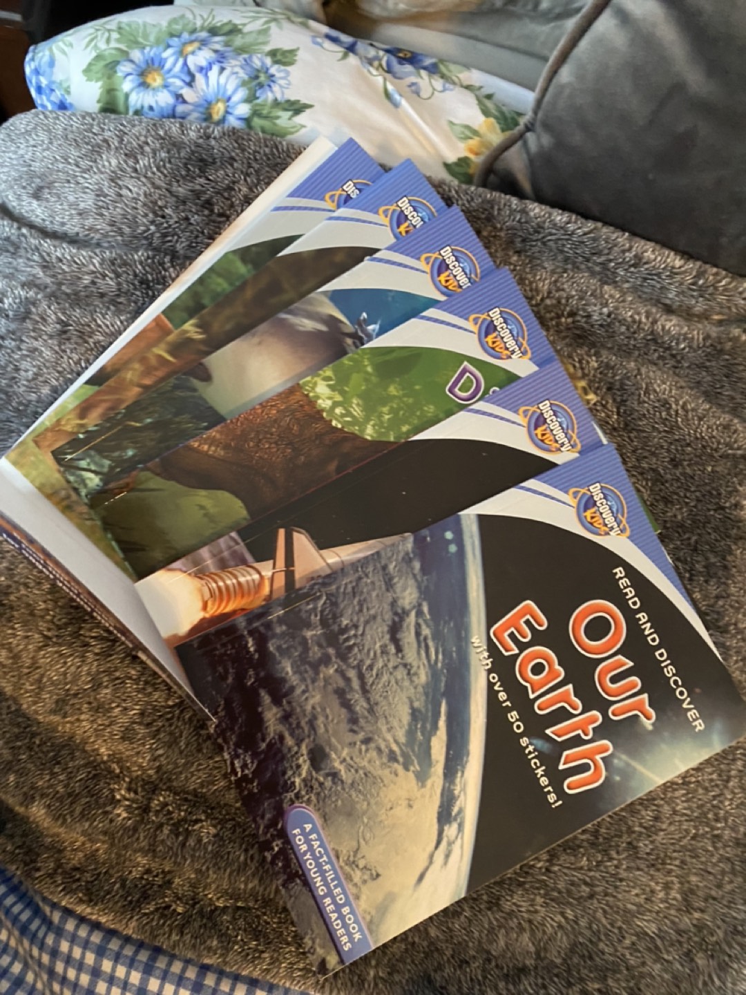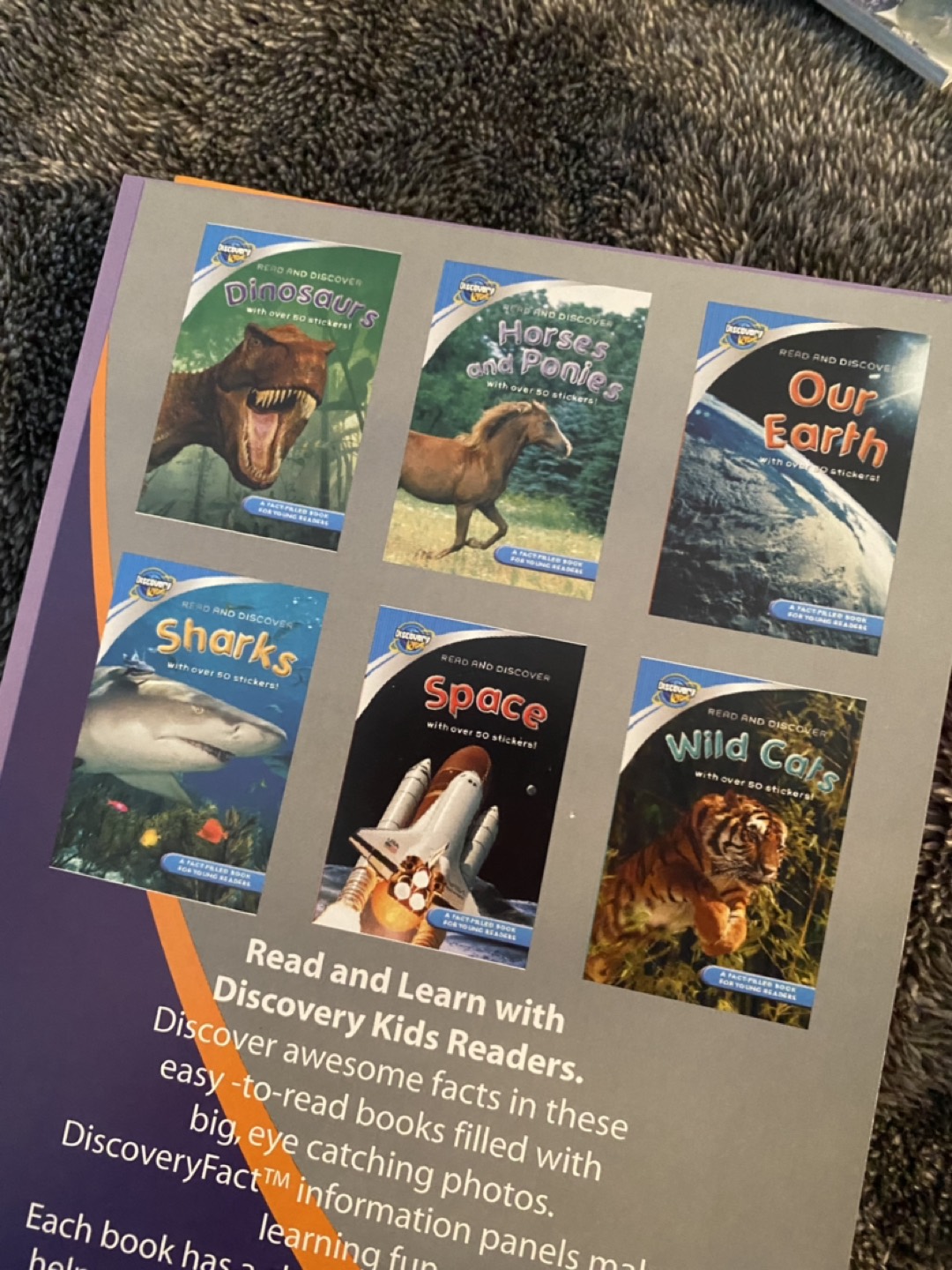 219Discovery Kids. Set of 6 books (new). Reading Books about sharks, our Earth, Dinosaurs, horses, space and wild cats. Never used.