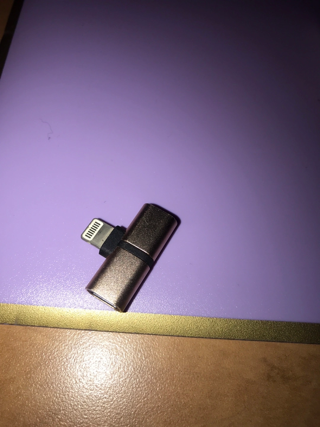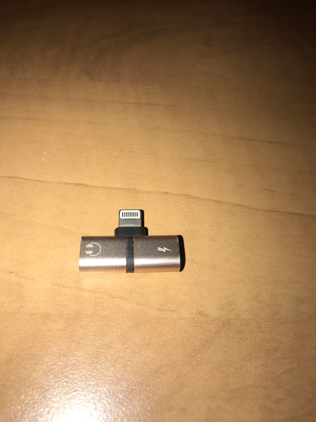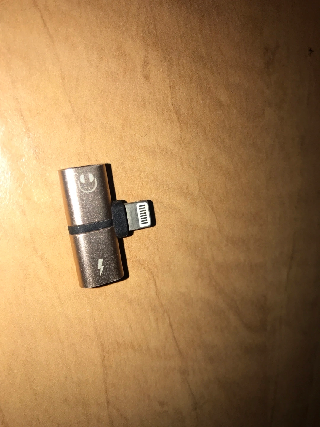 Gold-coloured Lightning to 3.5mm headphone jack adapter. Connects headphones to devices with Lightning ports. For charing and earphones plug. For IOS but donโt if it can work Android. Compact and portable design. Needs to be gone asap!