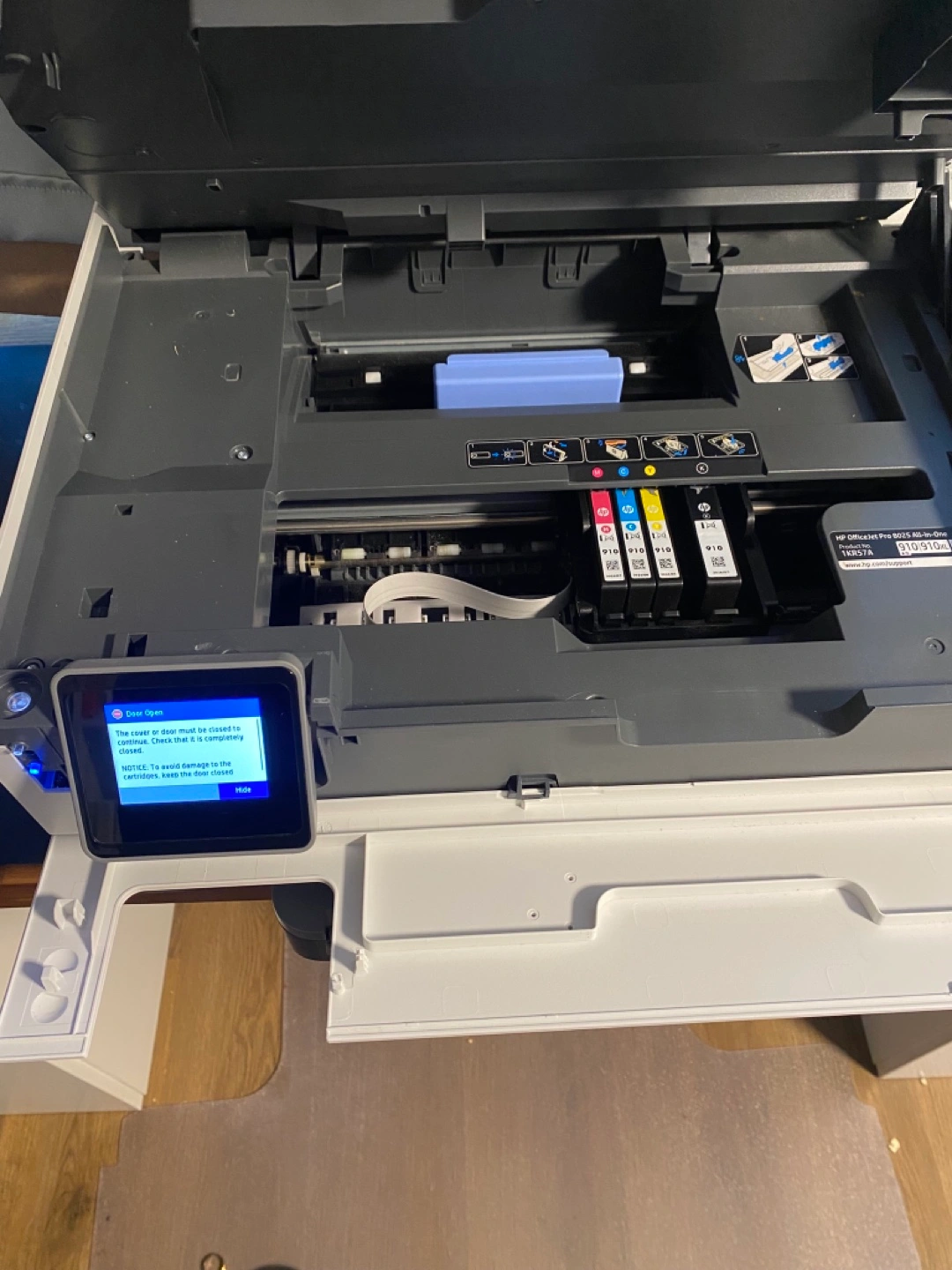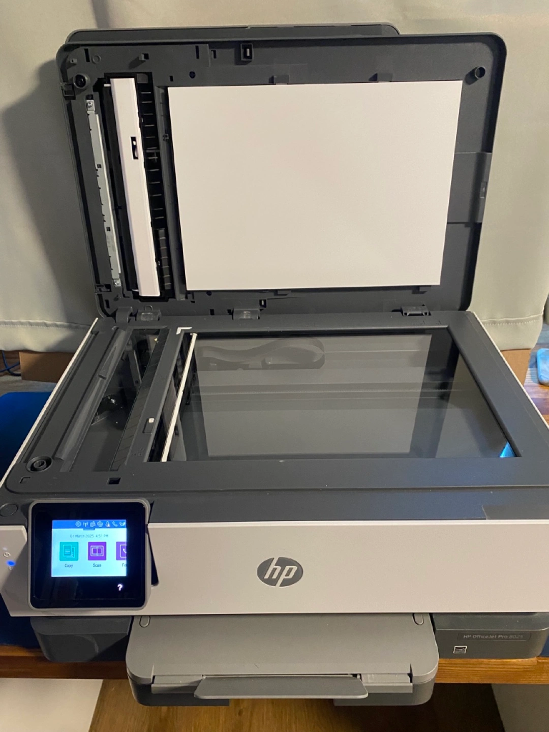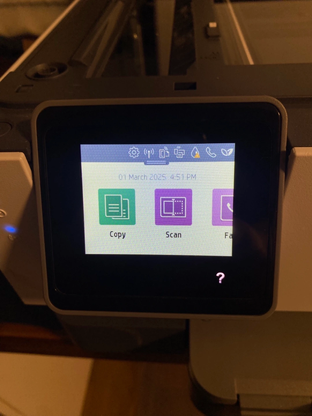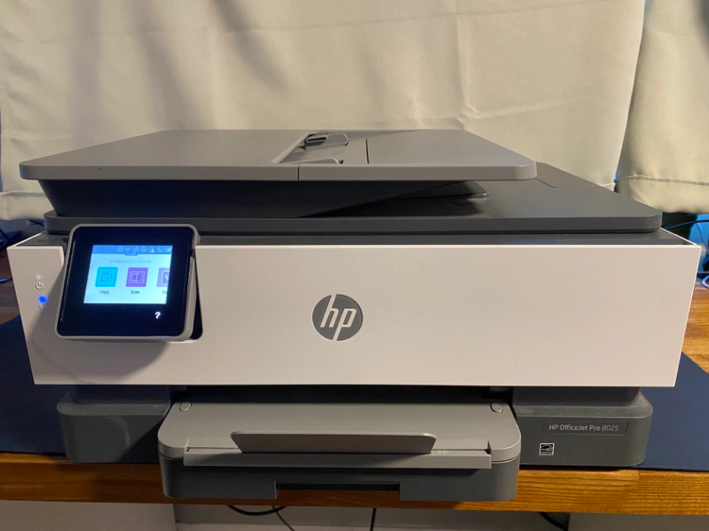 Wireless all-in-one printer. Prints, scans, and copies. Colour touchscreen display. Includes ink cartridges. Does not print colour well. Prints black ink and copies great.